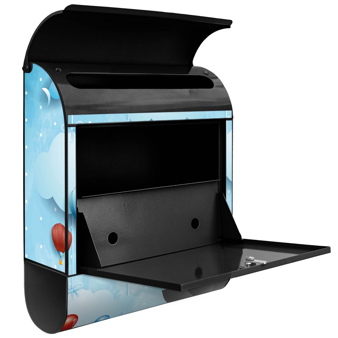 Der banjado Standbriefkasten mit Motiv Motiv fliegender Regenschirm kombiniert großzügigen Stauraum mit modernem Design. Durch das geräumige Fach finden auch große A4-Sendungen problemlos Platz. Die integrierte Zeitungsrolle sorgt dafür, dass Tageszeitungen und Magazine separat und griffbereit untergebracht sind. Der pulverbeschichtete Standfuß ist farblich passend zum Briefkasten gestaltet und sorgt für ein stimmiges Gesamtbild. Mit dem individuellen Motiv setzen Sie einen optischen Akzent, der sowohl praktisch als auch dekorativ ist.