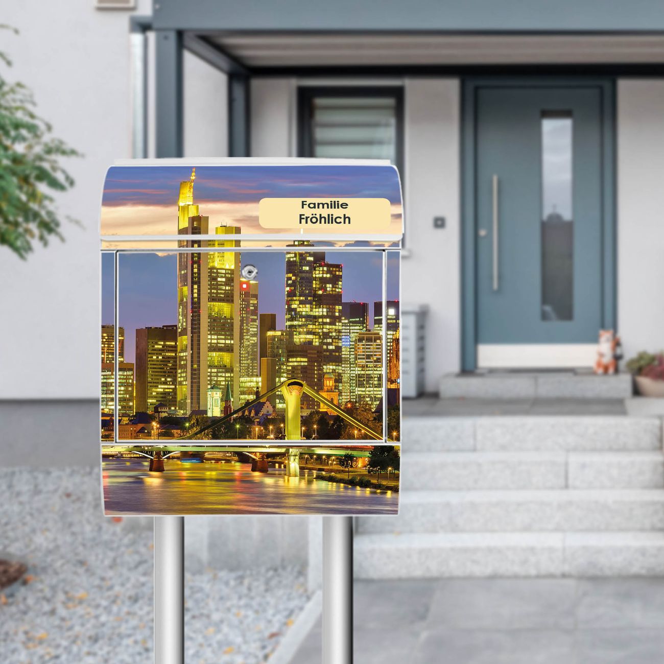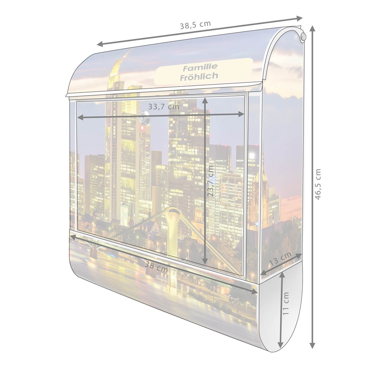 Der banjado Standbriefkasten mit Motiv Motiv Frankfurt Main kombiniert großzügigen Stauraum mit modernem Design. Durch das geräumige Fach finden auch große A4-Sendungen problemlos Platz. Die integrierte Zeitungsrolle sorgt dafür, dass Tageszeitungen und Magazine separat und griffbereit untergebracht sind. Der pulverbeschichtete Standfuß ist farblich passend zum Briefkasten gestaltet und sorgt für ein stimmiges Gesamtbild. Mit dem individuellen Motiv setzen Sie einen optischen Akzent, der sowohl praktisch als auch dekorativ ist.