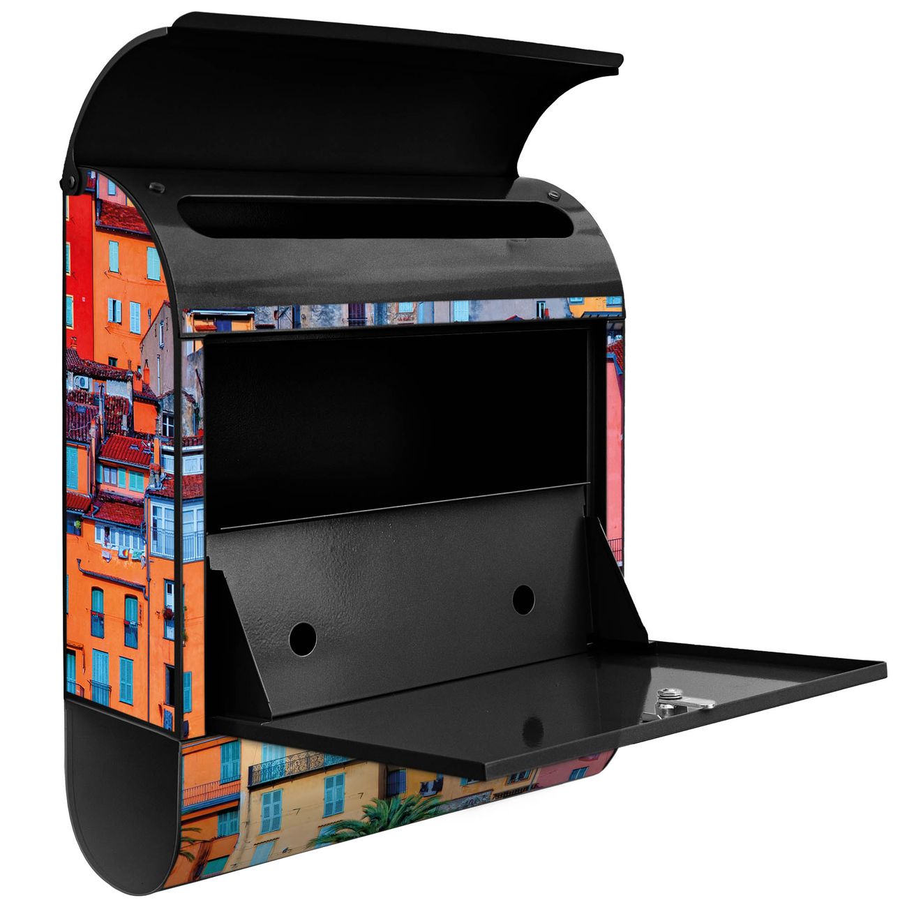 Der banjado Standbriefkasten mit Motiv Motiv Häuserberg kombiniert großzügigen Stauraum mit modernem Design. Durch das geräumige Fach finden auch große A4-Sendungen problemlos Platz. Die integrierte Zeitungsrolle sorgt dafür, dass Tageszeitungen und Magazine separat und griffbereit untergebracht sind. Der pulverbeschichtete Standfuß ist farblich passend zum Briefkasten gestaltet und sorgt für ein stimmiges Gesamtbild. Mit dem individuellen Motiv setzen Sie einen optischen Akzent, der sowohl praktisch als auch dekorativ ist.