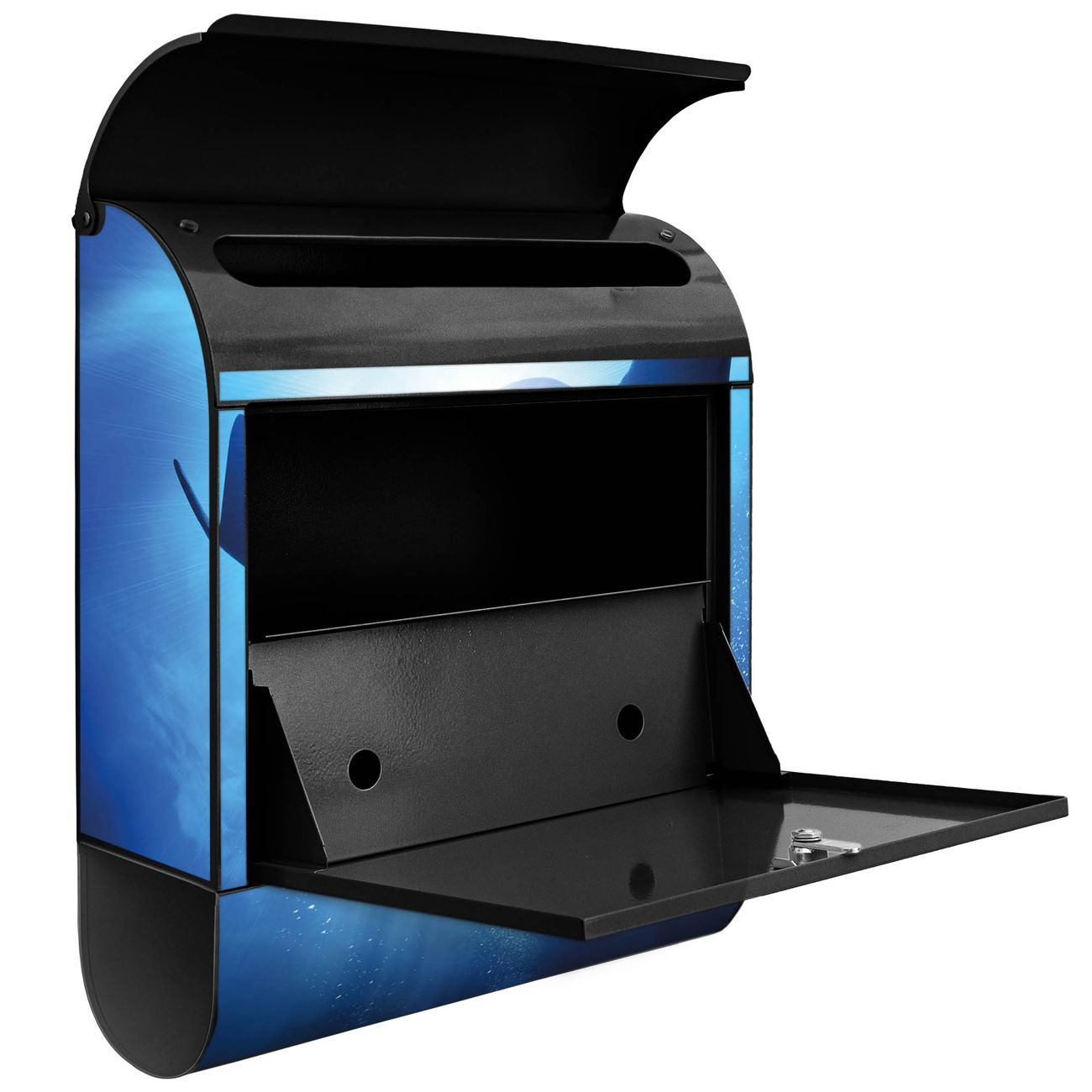 Der banjado Standbriefkasten mit Motiv Motiv Hai kombiniert großzügigen Stauraum mit modernem Design. Durch das geräumige Fach finden auch große A4-Sendungen problemlos Platz. Die integrierte Zeitungsrolle sorgt dafür, dass Tageszeitungen und Magazine separat und griffbereit untergebracht sind. Der pulverbeschichtete Standfuß ist farblich passend zum Briefkasten gestaltet und sorgt für ein stimmiges Gesamtbild. Mit dem individuellen Motiv setzen Sie einen optischen Akzent, der sowohl praktisch als auch dekorativ ist.
