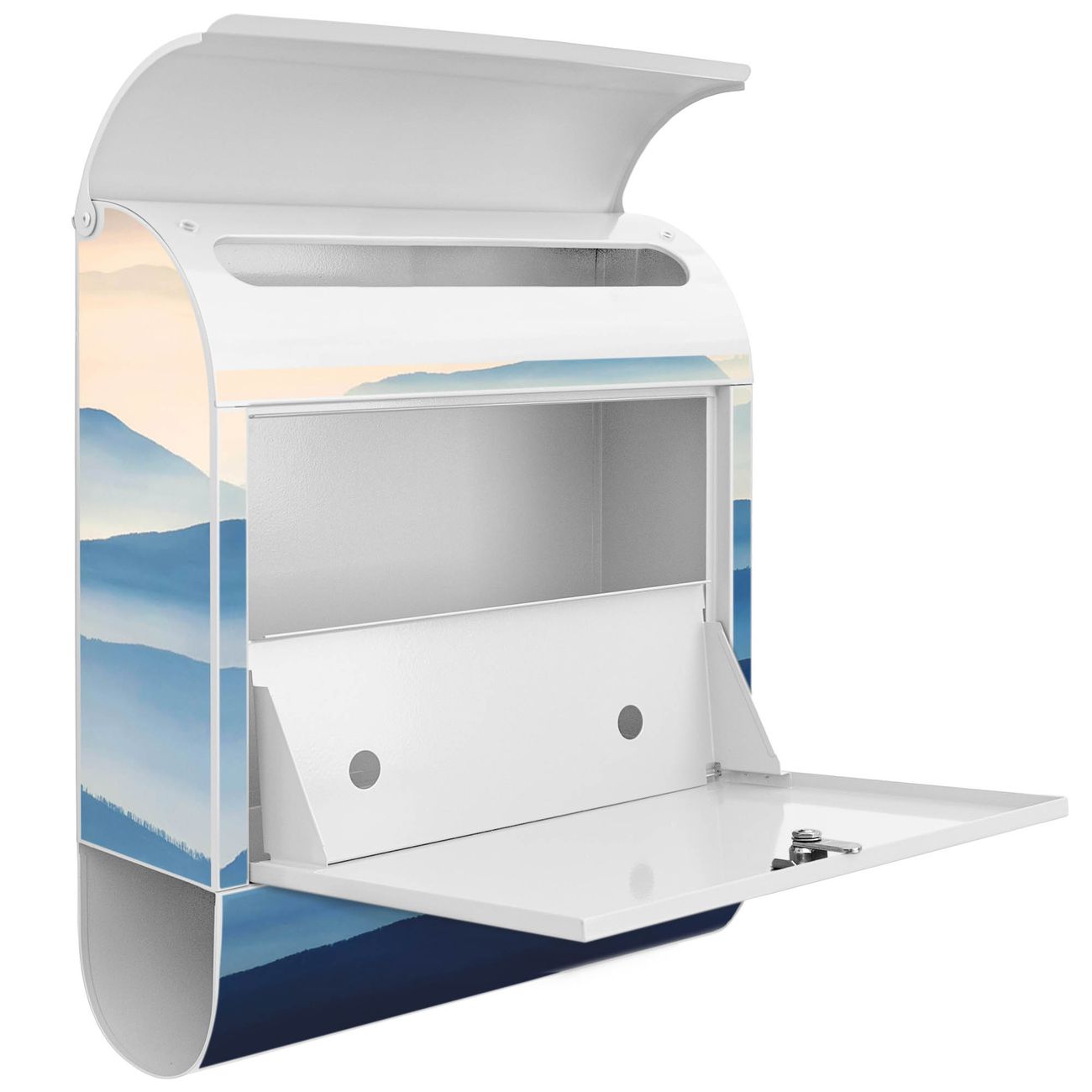 Der banjado Standbriefkasten mit Motiv Motiv Hinter den Bergen kombiniert großzügigen Stauraum mit modernem Design. Durch das geräumige Fach finden auch große A4-Sendungen problemlos Platz. Die integrierte Zeitungsrolle sorgt dafür, dass Tageszeitungen und Magazine separat und griffbereit untergebracht sind. Der pulverbeschichtete Standfuß ist farblich passend zum Briefkasten gestaltet und sorgt für ein stimmiges Gesamtbild. Mit dem individuellen Motiv setzen Sie einen optischen Akzent, der sowohl praktisch als auch dekorativ ist.