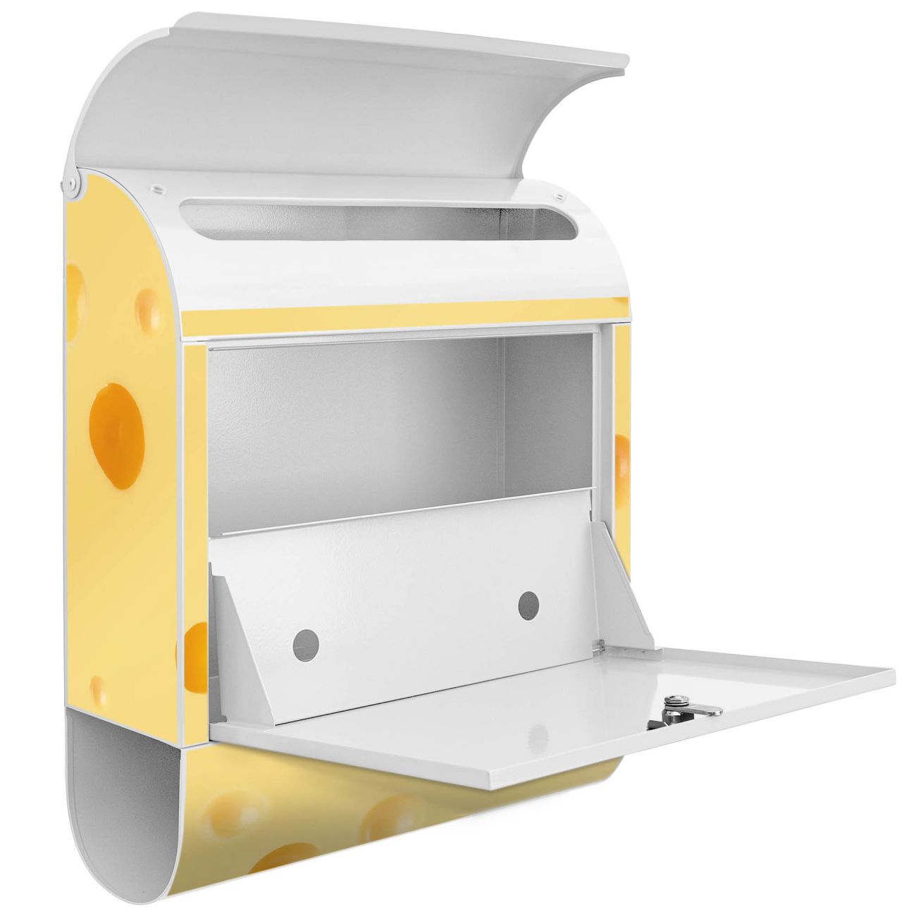 Der banjado Standbriefkasten mit Motiv Motiv Käse kombiniert großzügigen Stauraum mit modernem Design. Durch das geräumige Fach finden auch große A4-Sendungen problemlos Platz. Die integrierte Zeitungsrolle sorgt dafür, dass Tageszeitungen und Magazine separat und griffbereit untergebracht sind. Der pulverbeschichtete Standfuß ist farblich passend zum Briefkasten gestaltet und sorgt für ein stimmiges Gesamtbild. Mit dem individuellen Motiv setzen Sie einen optischen Akzent, der sowohl praktisch als auch dekorativ ist.