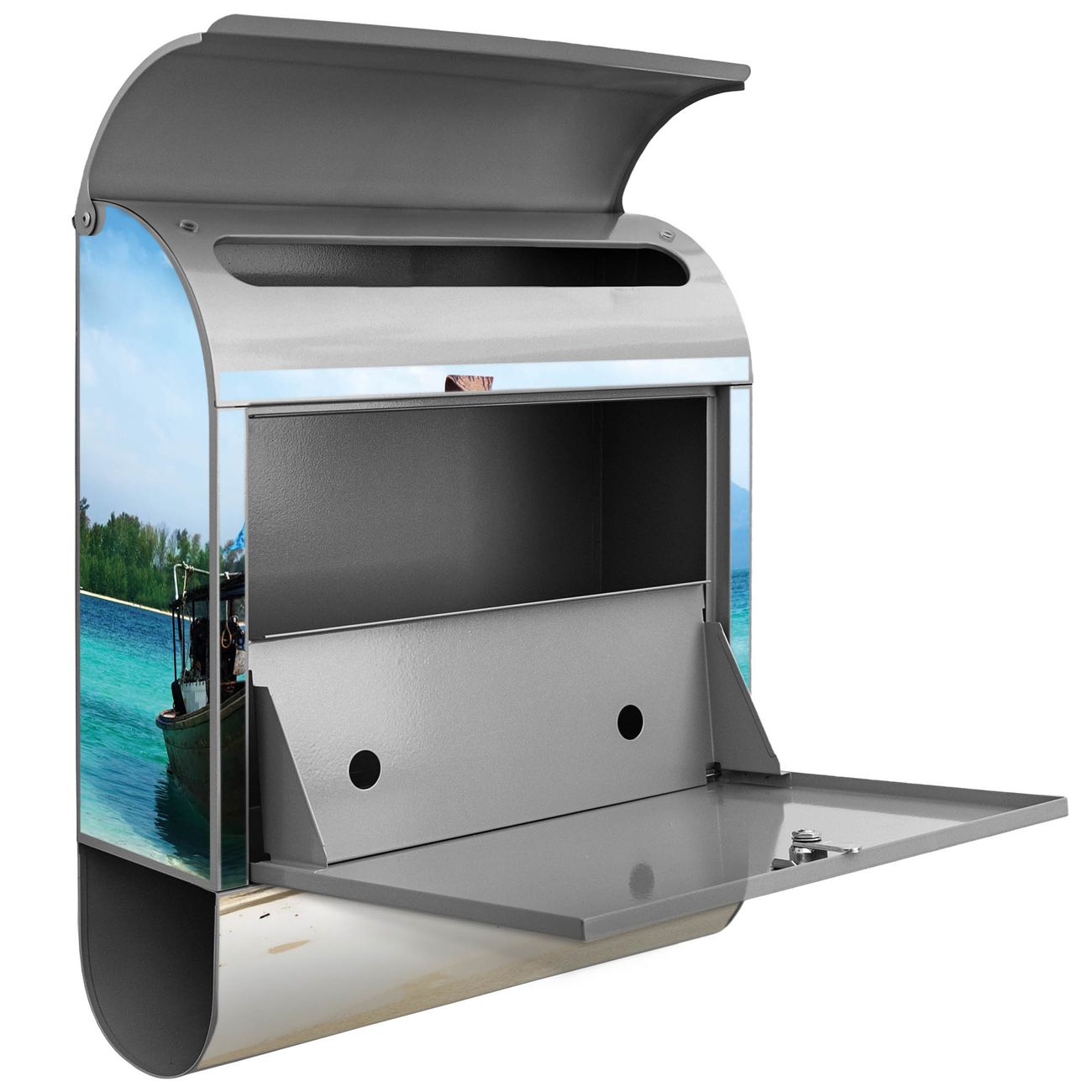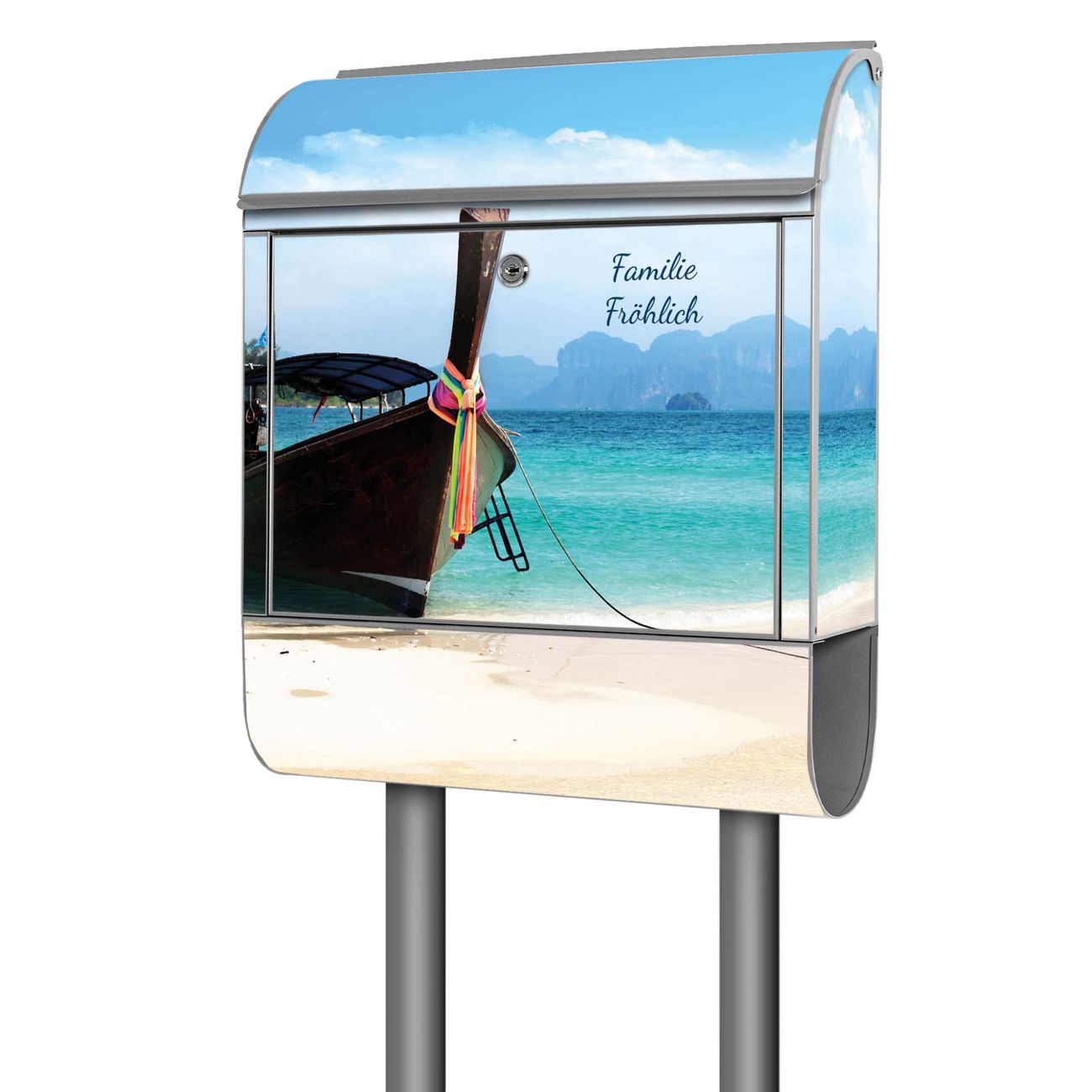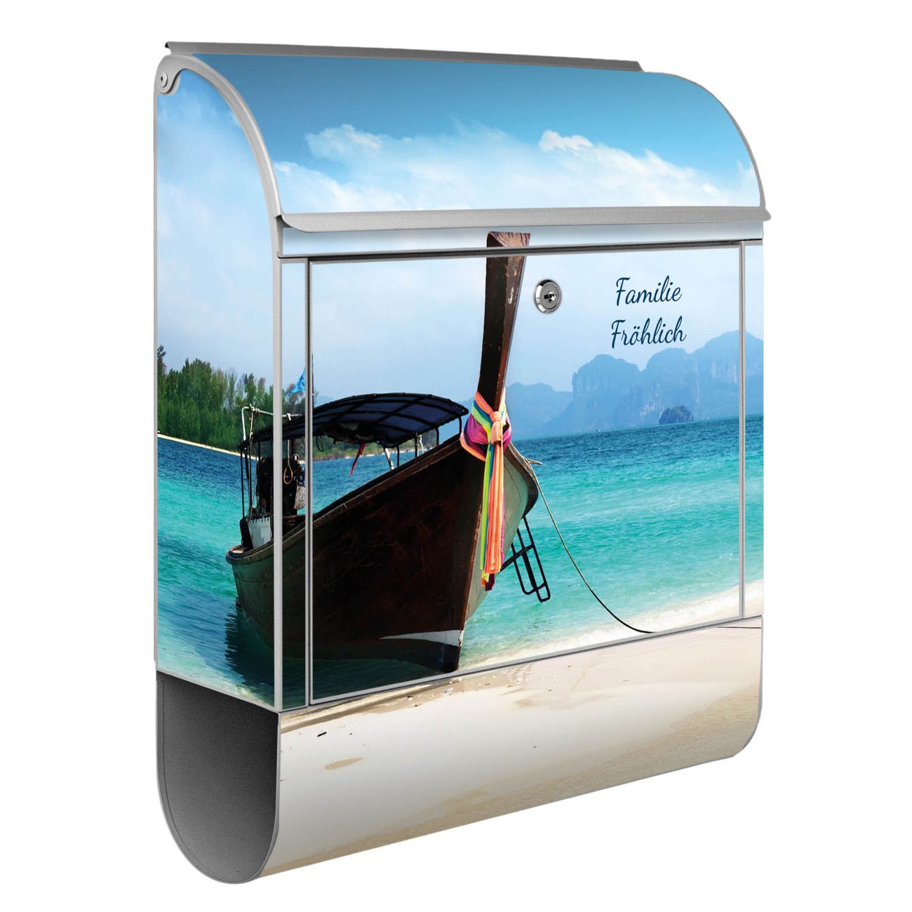 Der banjado Standbriefkasten mit Motiv Motiv Koh Poda kombiniert großzügigen Stauraum mit modernem Design. Durch das geräumige Fach finden auch große A4-Sendungen problemlos Platz. Die integrierte Zeitungsrolle sorgt dafür, dass Tageszeitungen und Magazine separat und griffbereit untergebracht sind. Der pulverbeschichtete Standfuß ist farblich passend zum Briefkasten gestaltet und sorgt für ein stimmiges Gesamtbild. Mit dem individuellen Motiv setzen Sie einen optischen Akzent, der sowohl praktisch als auch dekorativ ist.
