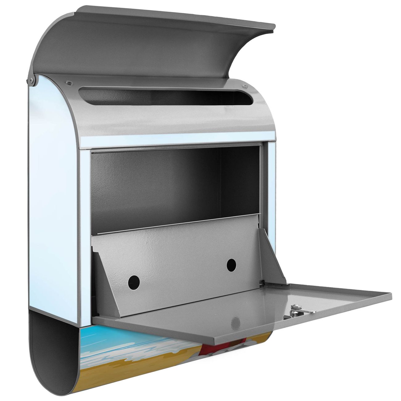 Der banjado Standbriefkasten mit Motiv Motiv Leuchtturm Illustration kombiniert großzügigen Stauraum mit modernem Design. Durch das geräumige Fach finden auch große A4-Sendungen problemlos Platz. Die integrierte Zeitungsrolle sorgt dafür, dass Tageszeitungen und Magazine separat und griffbereit untergebracht sind. Der pulverbeschichtete Standfuß ist farblich passend zum Briefkasten gestaltet und sorgt für ein stimmiges Gesamtbild. Mit dem individuellen Motiv setzen Sie einen optischen Akzent, der sowohl praktisch als auch dekorativ ist.