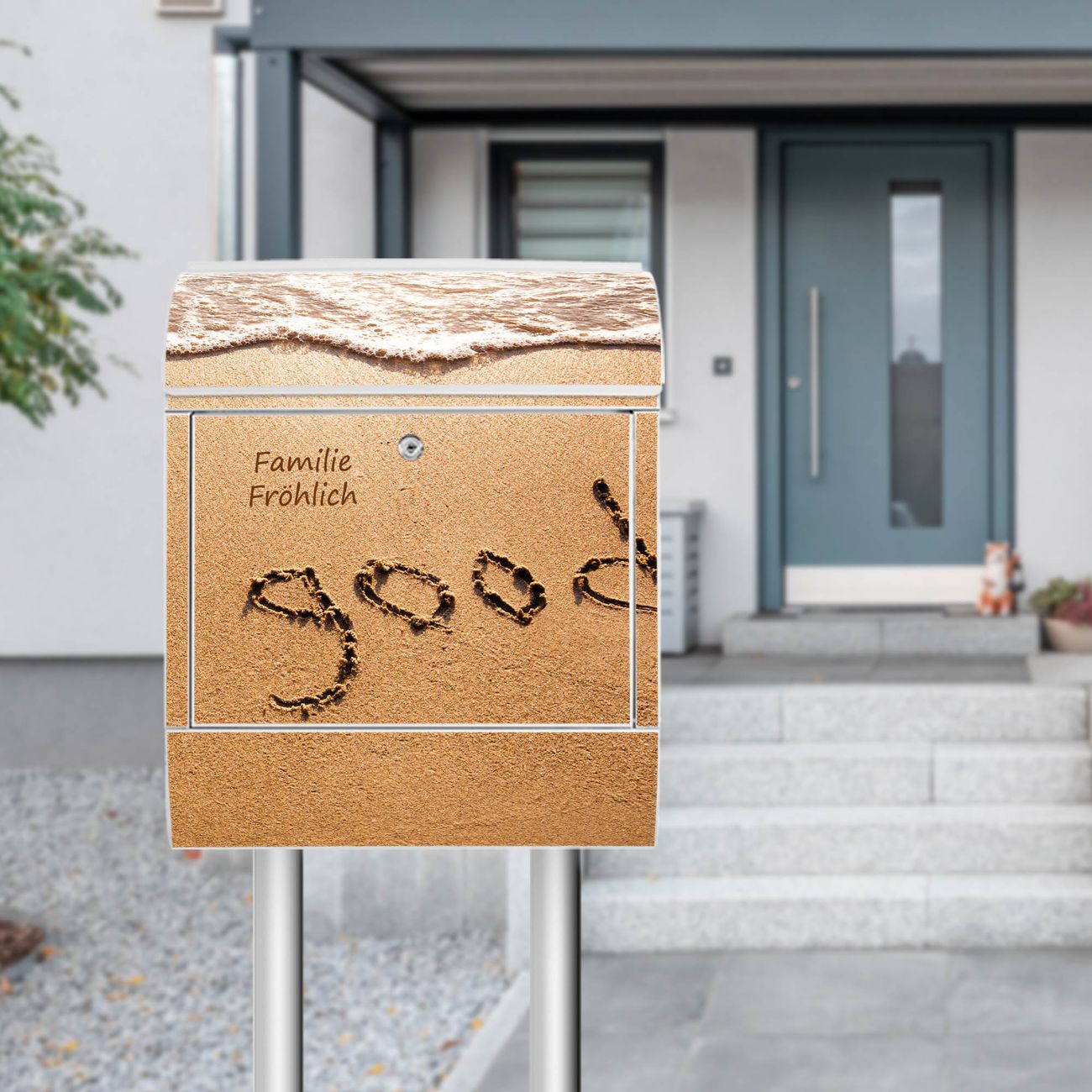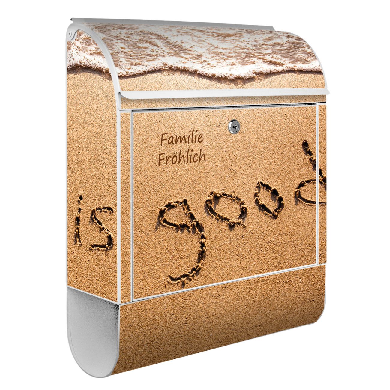 Der banjado Standbriefkasten mit Motiv Motiv Life Is Good kombiniert großzügigen Stauraum mit modernem Design. Durch das geräumige Fach finden auch große A4-Sendungen problemlos Platz. Die integrierte Zeitungsrolle sorgt dafür, dass Tageszeitungen und Magazine separat und griffbereit untergebracht sind. Der pulverbeschichtete Standfuß ist farblich passend zum Briefkasten gestaltet und sorgt für ein stimmiges Gesamtbild. Mit dem individuellen Motiv setzen Sie einen optischen Akzent, der sowohl praktisch als auch dekorativ ist.