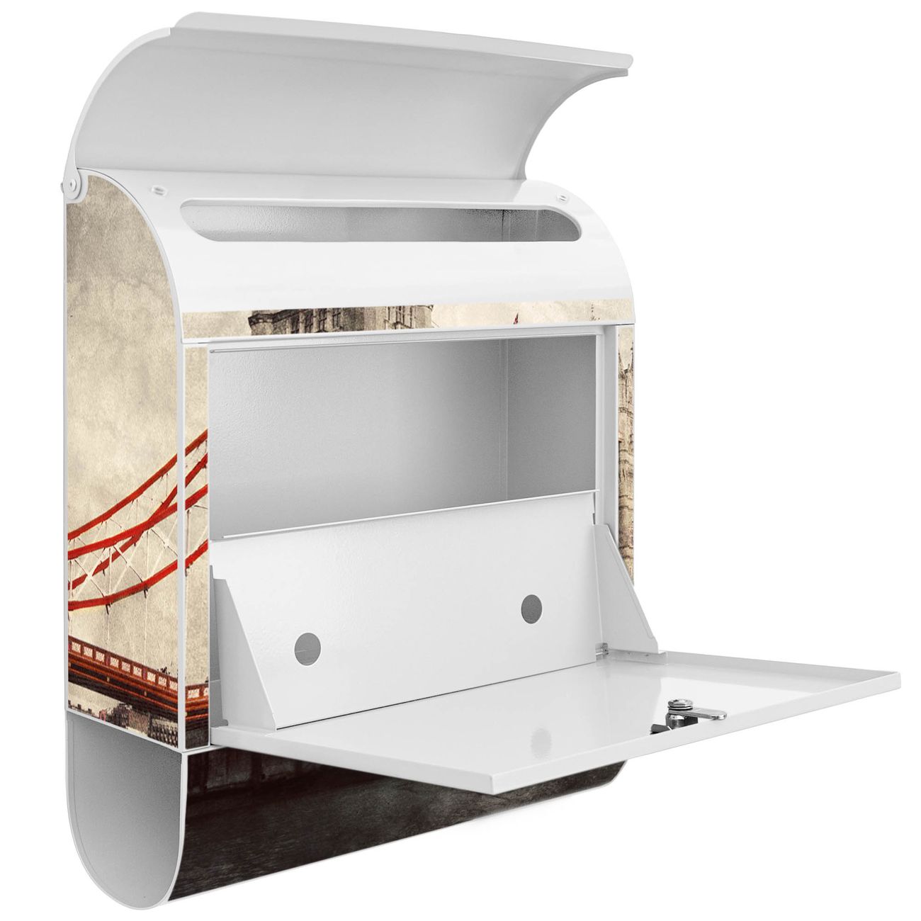 Der banjado Standbriefkasten mit Motiv Motiv London Bridge kombiniert großzügigen Stauraum mit modernem Design. Durch das geräumige Fach finden auch große A4-Sendungen problemlos Platz. Die integrierte Zeitungsrolle sorgt dafür, dass Tageszeitungen und Magazine separat und griffbereit untergebracht sind. Der pulverbeschichtete Standfuß ist farblich passend zum Briefkasten gestaltet und sorgt für ein stimmiges Gesamtbild. Mit dem individuellen Motiv setzen Sie einen optischen Akzent, der sowohl praktisch als auch dekorativ ist.