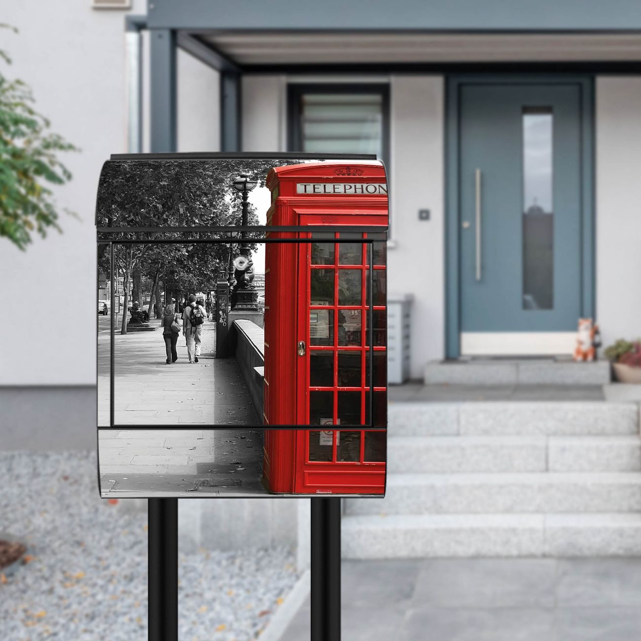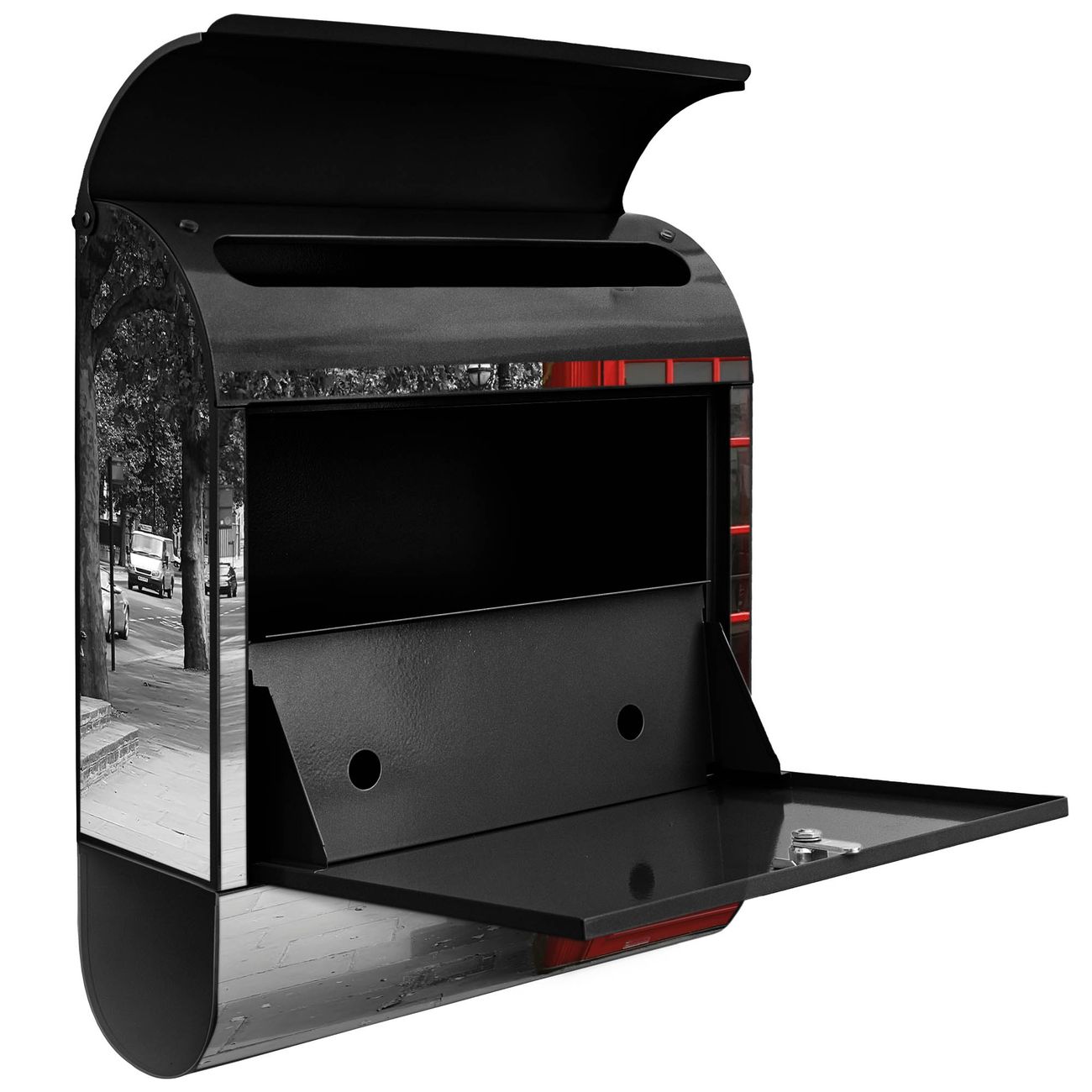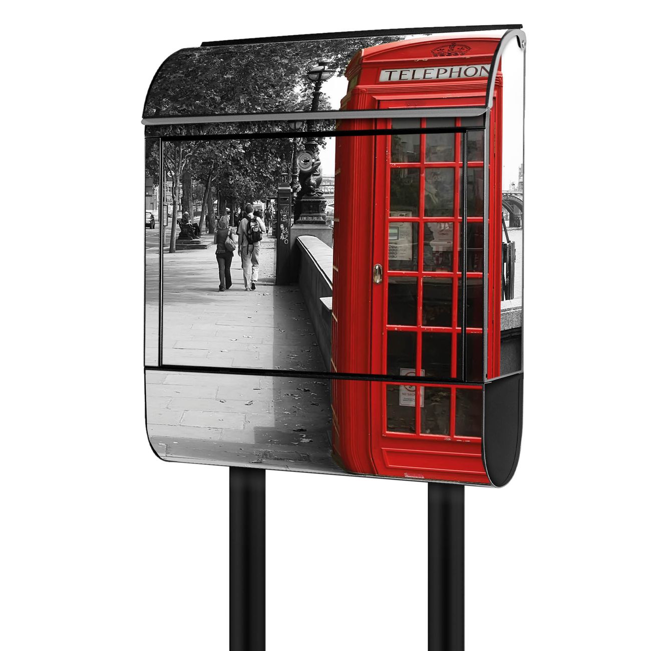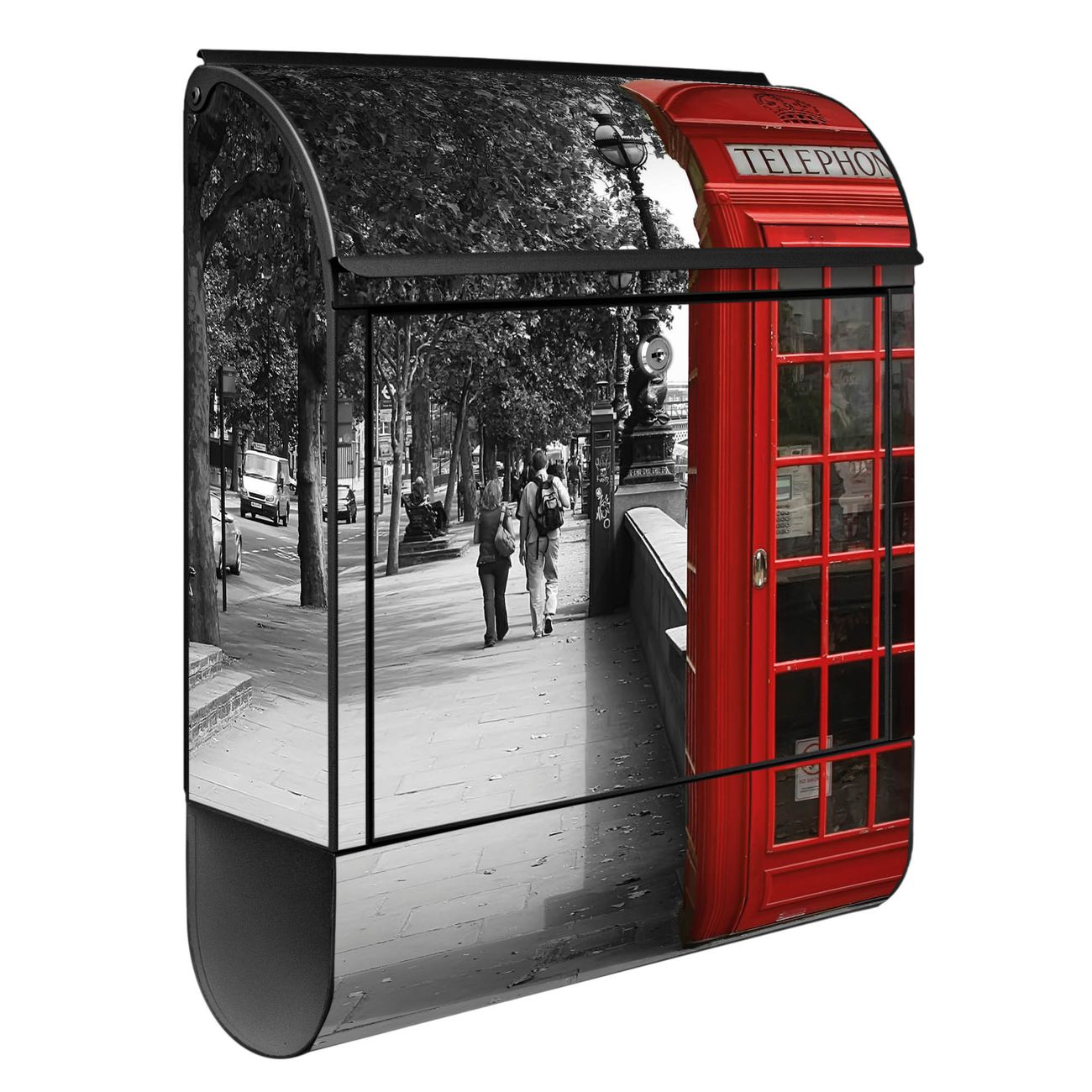 Der banjado Standbriefkasten mit Motiv Motiv London Red Telephone kombiniert großzügigen Stauraum mit modernem Design. Durch das geräumige Fach finden auch große A4-Sendungen problemlos Platz. Die integrierte Zeitungsrolle sorgt dafür, dass Tageszeitungen und Magazine separat und griffbereit untergebracht sind. Der pulverbeschichtete Standfuß ist farblich passend zum Briefkasten gestaltet und sorgt für ein stimmiges Gesamtbild. Mit dem individuellen Motiv setzen Sie einen optischen Akzent, der sowohl praktisch als auch dekorativ ist.