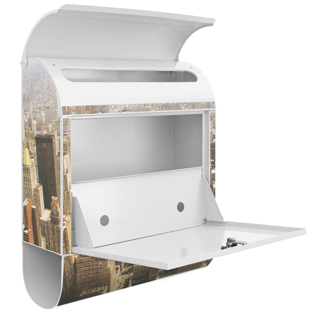 Der banjado Standbriefkasten mit Motiv Motiv Manhattan 1 kombiniert großzügigen Stauraum mit modernem Design. Durch das geräumige Fach finden auch große A4-Sendungen problemlos Platz. Die integrierte Zeitungsrolle sorgt dafür, dass Tageszeitungen und Magazine separat und griffbereit untergebracht sind. Der pulverbeschichtete Standfuß ist farblich passend zum Briefkasten gestaltet und sorgt für ein stimmiges Gesamtbild. Mit dem individuellen Motiv setzen Sie einen optischen Akzent, der sowohl praktisch als auch dekorativ ist.