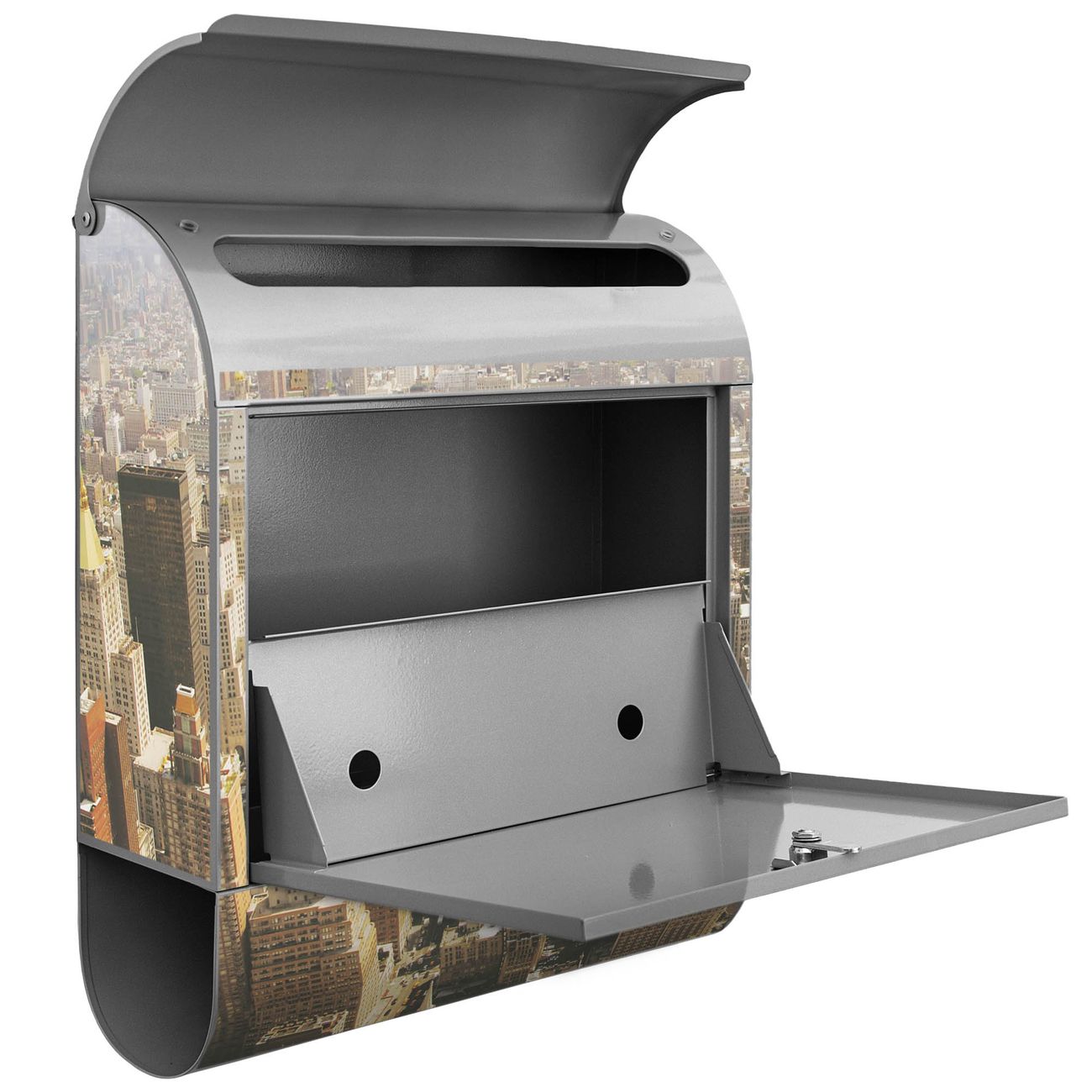 Der banjado Standbriefkasten mit Motiv Motiv Manhattan 1 kombiniert großzügigen Stauraum mit modernem Design. Durch das geräumige Fach finden auch große A4-Sendungen problemlos Platz. Die integrierte Zeitungsrolle sorgt dafür, dass Tageszeitungen und Magazine separat und griffbereit untergebracht sind. Der pulverbeschichtete Standfuß ist farblich passend zum Briefkasten gestaltet und sorgt für ein stimmiges Gesamtbild. Mit dem individuellen Motiv setzen Sie einen optischen Akzent, der sowohl praktisch als auch dekorativ ist.