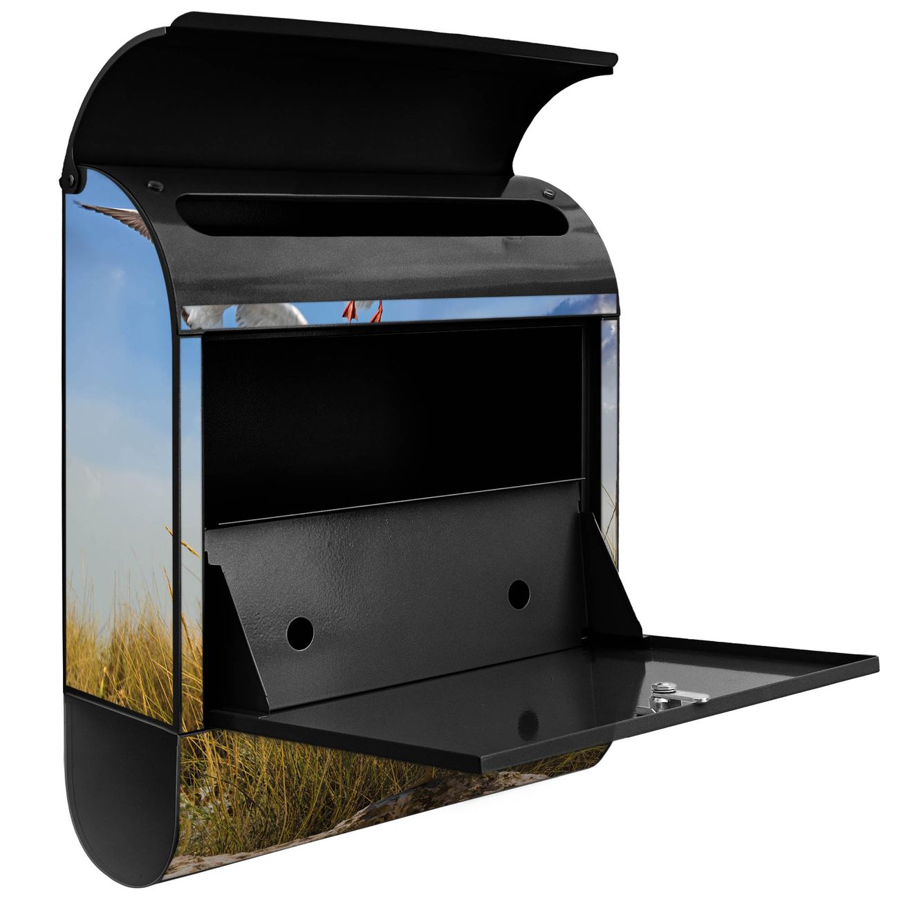 Der banjado Standbriefkasten mit Motiv Motiv Möwen kombiniert großzügigen Stauraum mit modernem Design. Durch das geräumige Fach finden auch große A4-Sendungen problemlos Platz. Die integrierte Zeitungsrolle sorgt dafür, dass Tageszeitungen und Magazine separat und griffbereit untergebracht sind. Der pulverbeschichtete Standfuß ist farblich passend zum Briefkasten gestaltet und sorgt für ein stimmiges Gesamtbild. Mit dem individuellen Motiv setzen Sie einen optischen Akzent, der sowohl praktisch als auch dekorativ ist.