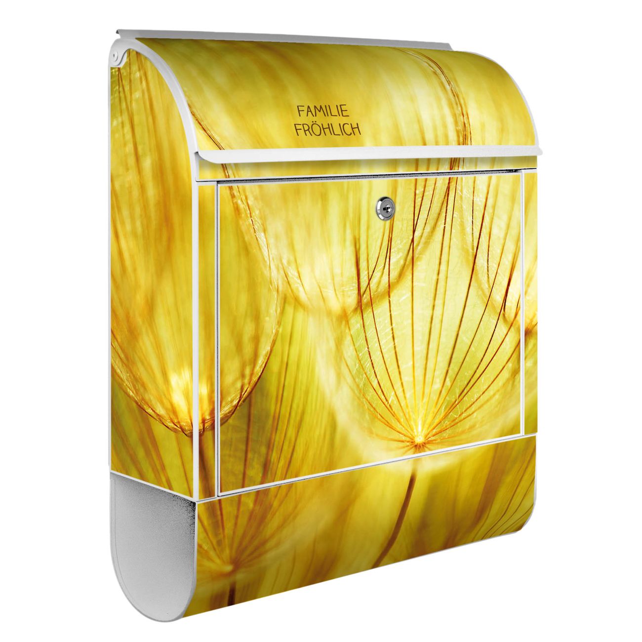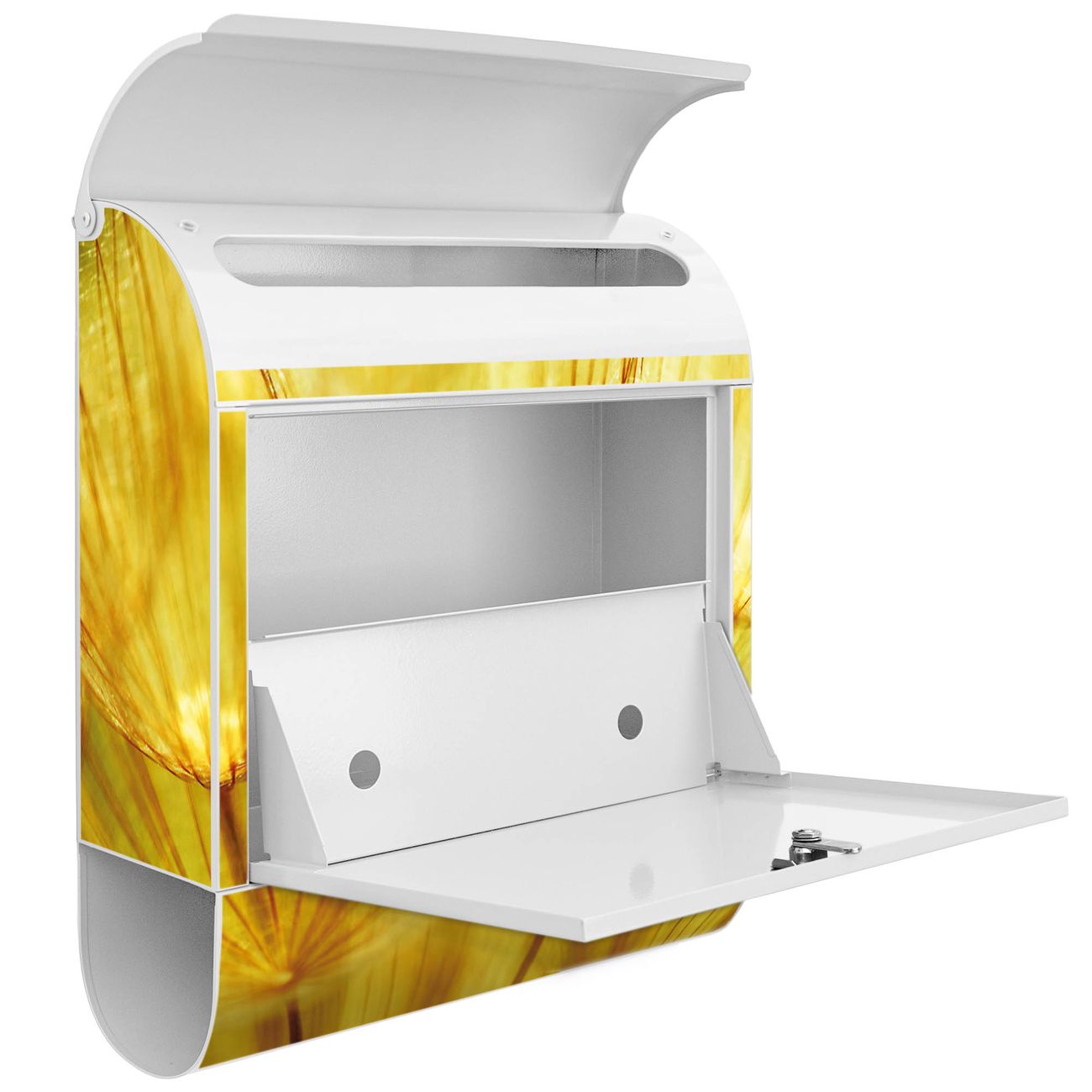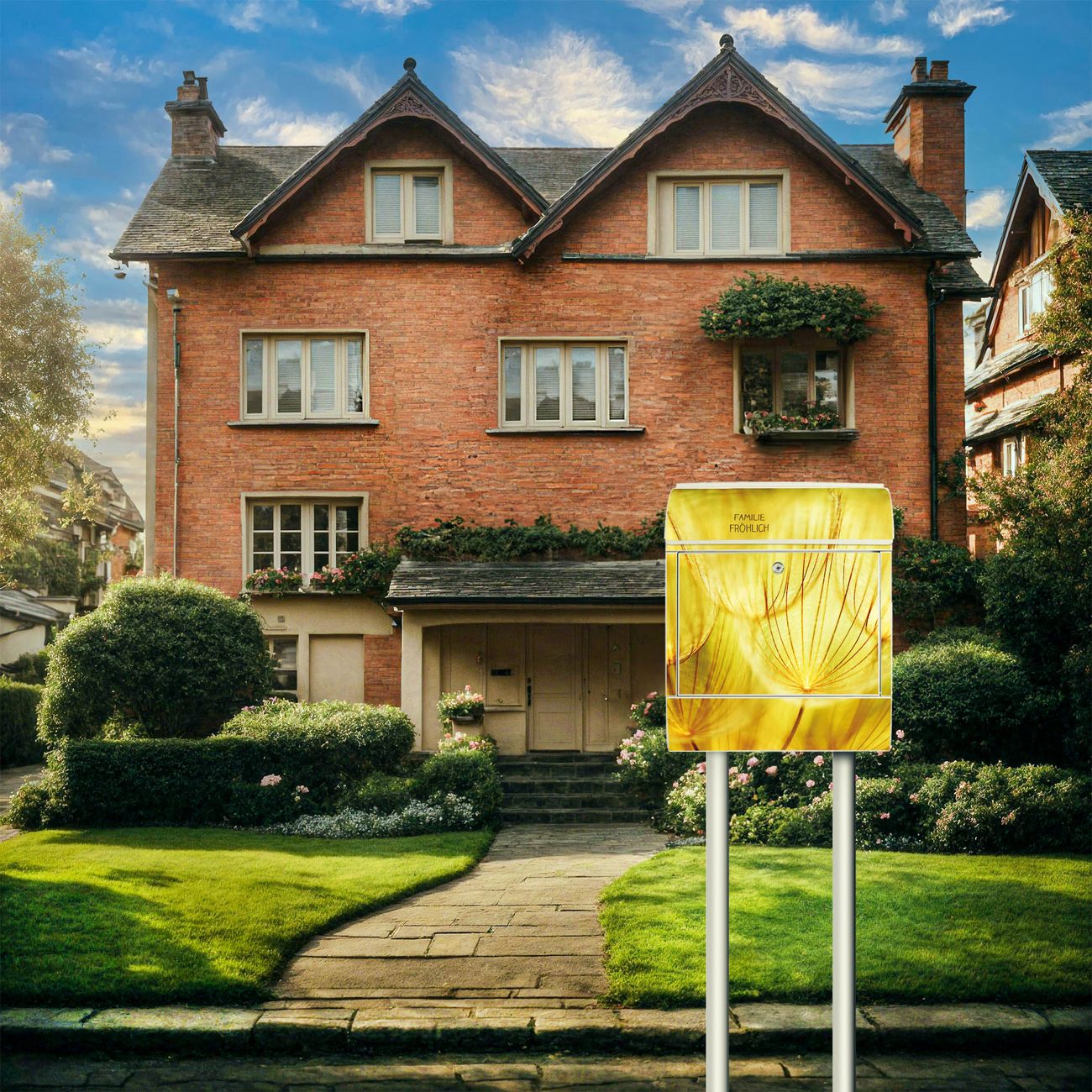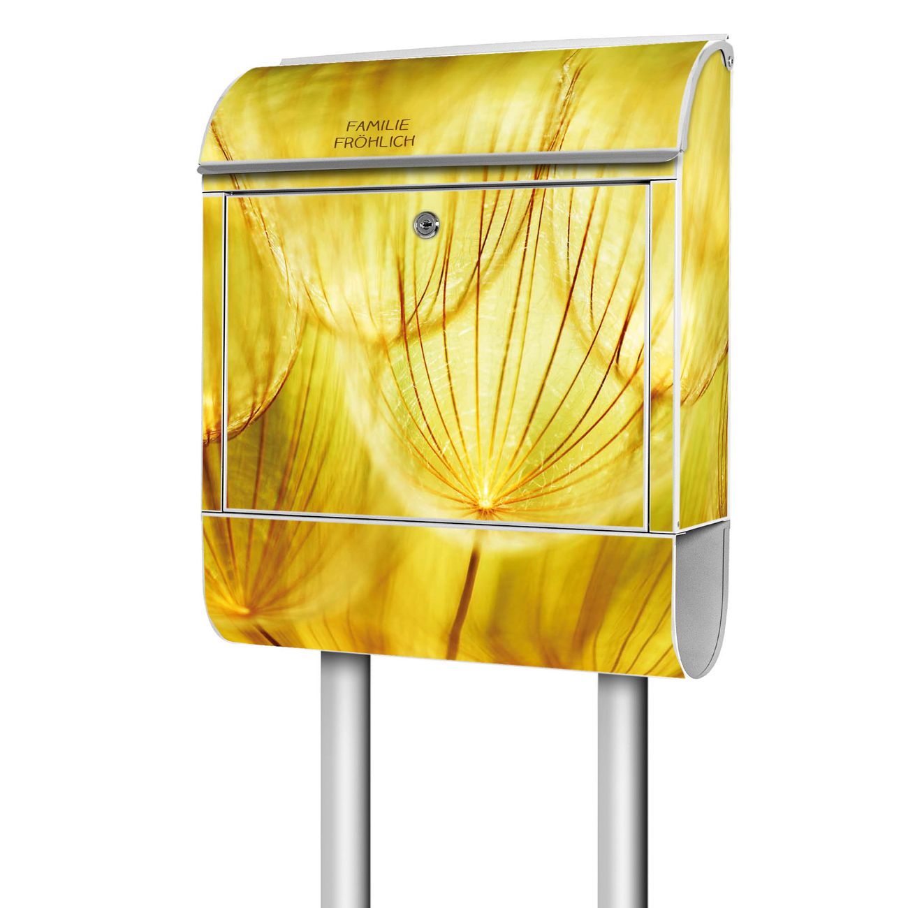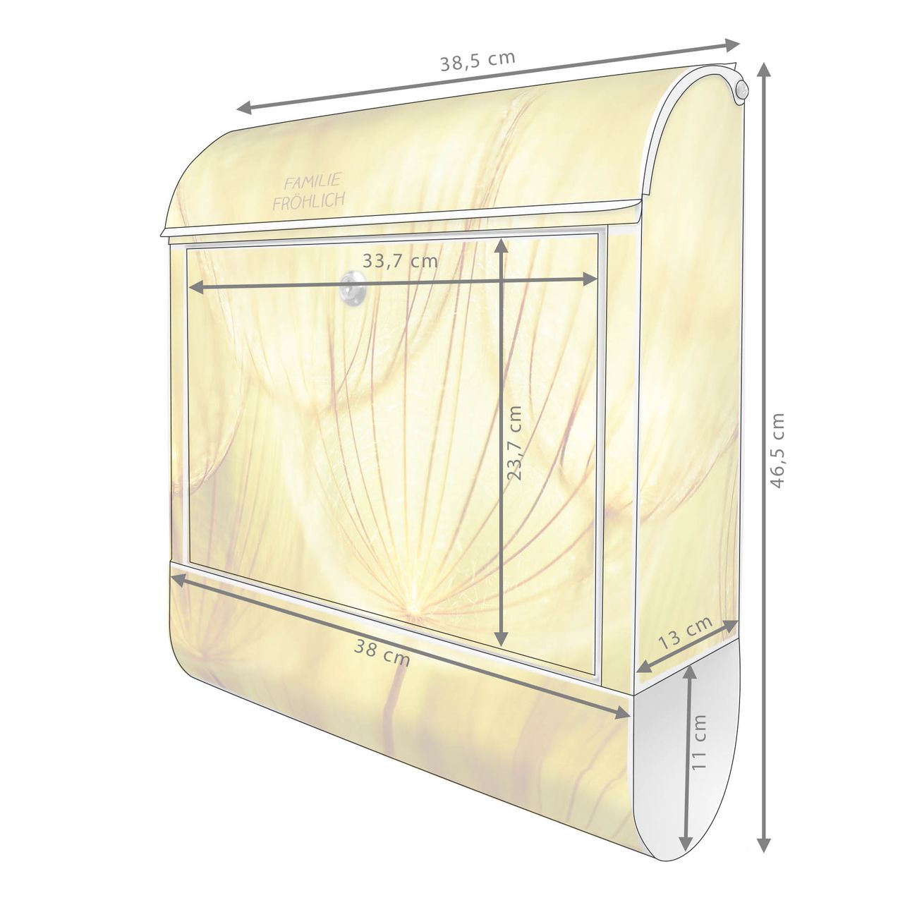 Der banjado Standbriefkasten mit Motiv Motiv Pusteblumen Gold kombiniert großzügigen Stauraum mit modernem Design. Durch das geräumige Fach finden auch große A4-Sendungen problemlos Platz. Die integrierte Zeitungsrolle sorgt dafür, dass Tageszeitungen und Magazine separat und griffbereit untergebracht sind. Der pulverbeschichtete Standfuß ist farblich passend zum Briefkasten gestaltet und sorgt für ein stimmiges Gesamtbild. Mit dem individuellen Motiv setzen Sie einen optischen Akzent, der sowohl praktisch als auch dekorativ ist.