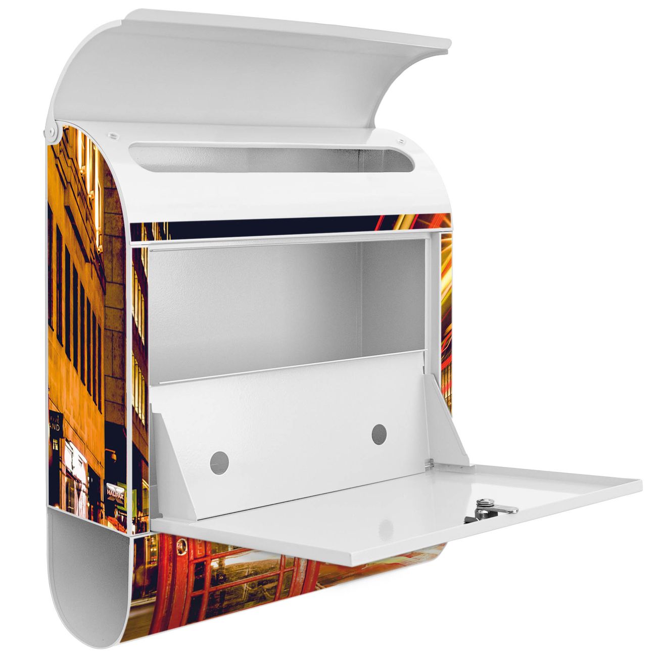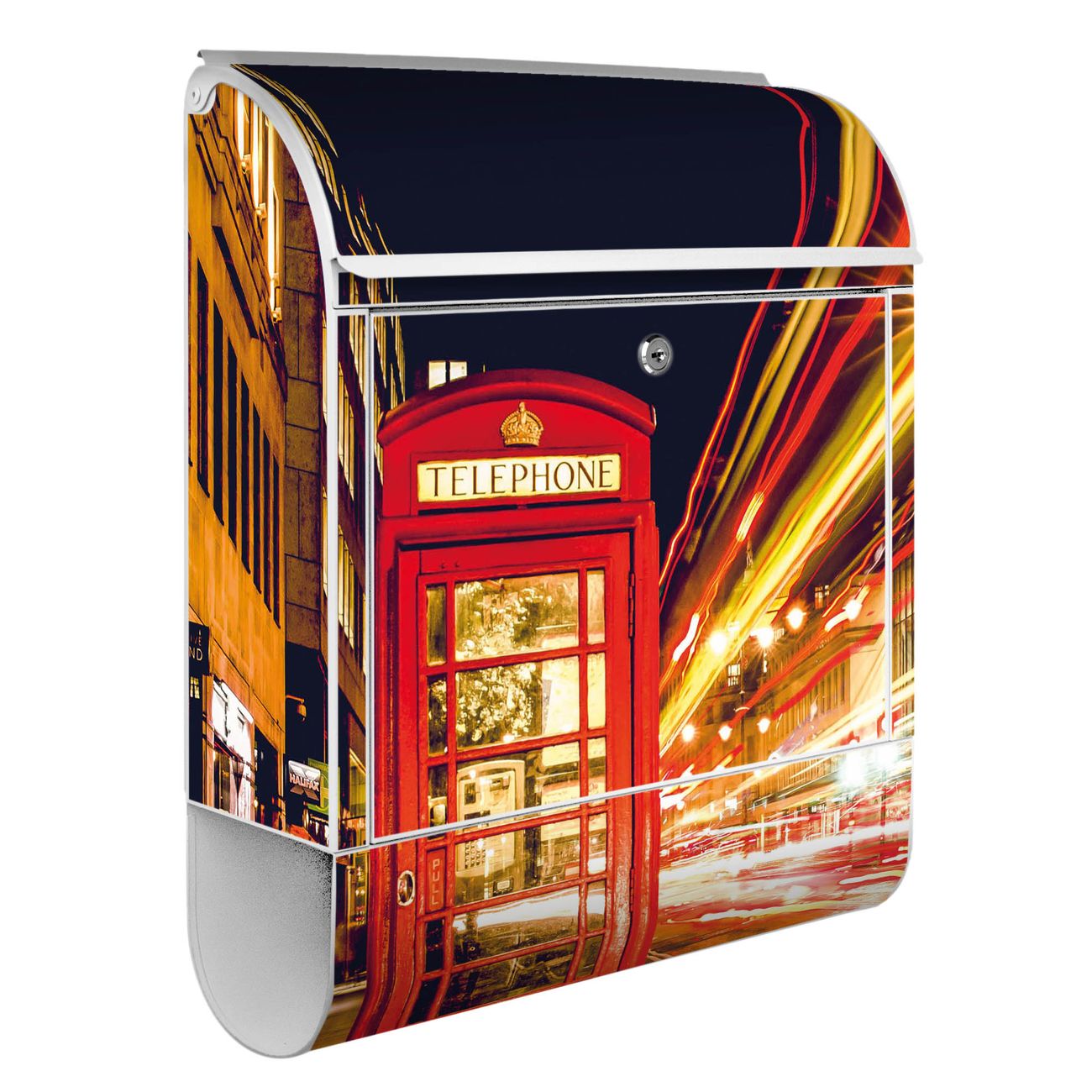 Der banjado Standbriefkasten mit Motiv Motiv Red Telephone Trafic kombiniert großzügigen Stauraum mit modernem Design. Durch das geräumige Fach finden auch große A4-Sendungen problemlos Platz. Die integrierte Zeitungsrolle sorgt dafür, dass Tageszeitungen und Magazine separat und griffbereit untergebracht sind. Der pulverbeschichtete Standfuß ist farblich passend zum Briefkasten gestaltet und sorgt für ein stimmiges Gesamtbild. Mit dem individuellen Motiv setzen Sie einen optischen Akzent, der sowohl praktisch als auch dekorativ ist.