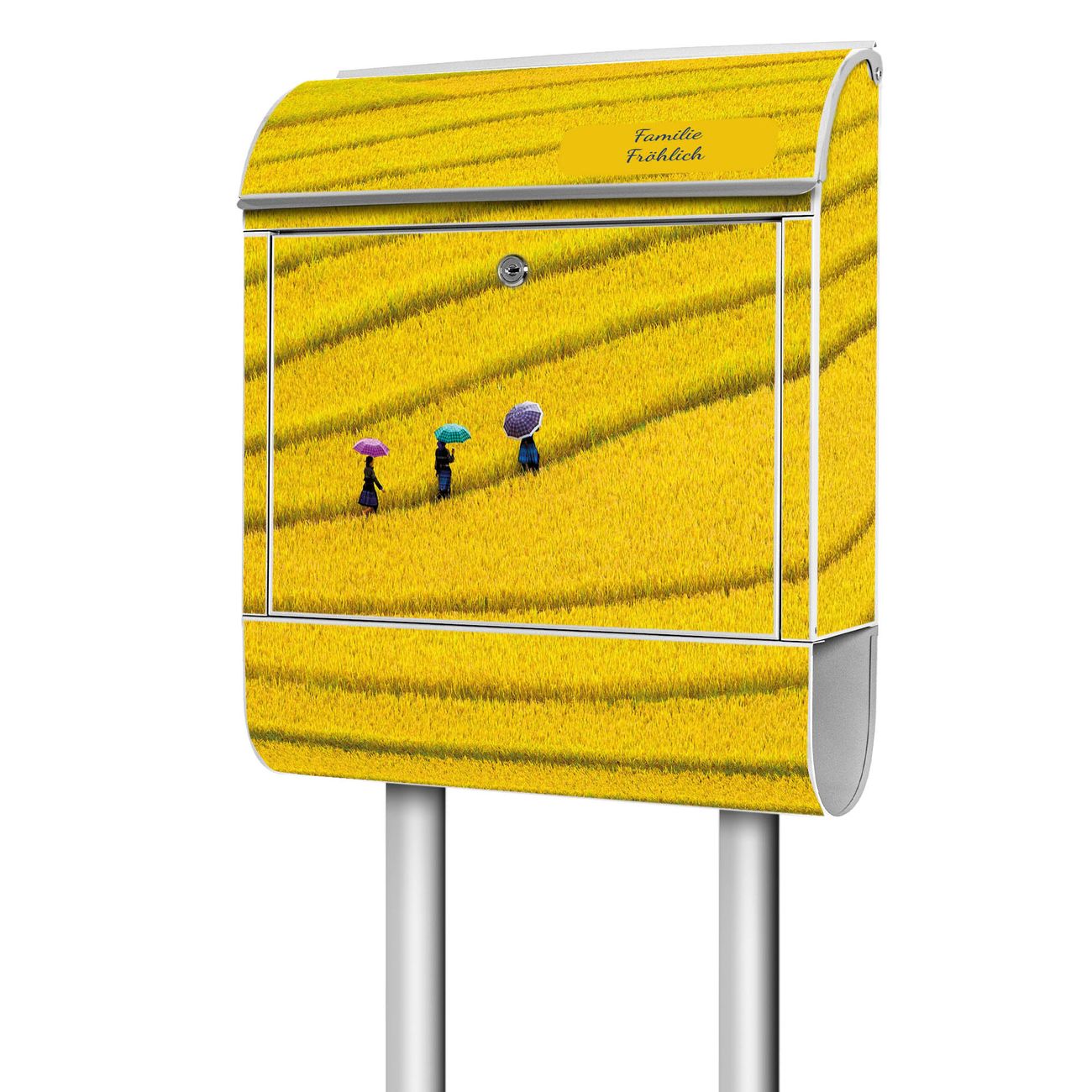 Der Standbriefkasten besteht aus pulverbeschichtetem Stahl und ist insgesamt ca. 161,5 x 47 x 16 cm groß. Das Motiv wird auf eine wetter- und UV-beständige Folie aufgebracht und mit einem robusten Schutzlaminat versiegelt. Damit bleibt die Farbbrillanz auch bei Sonne und Regen lange erhalten. Für einen sicheren Halt empfehlen wir, den Standbriefkasten mindestens 15 cm einzubetonieren. Jeder Briefkasten wird in Sachsen in einer kleinen Manufaktur von Hand veredelt - Sie erhalten ein Stück langlebige Handarbeit, das Funktionalität und Design vereint.