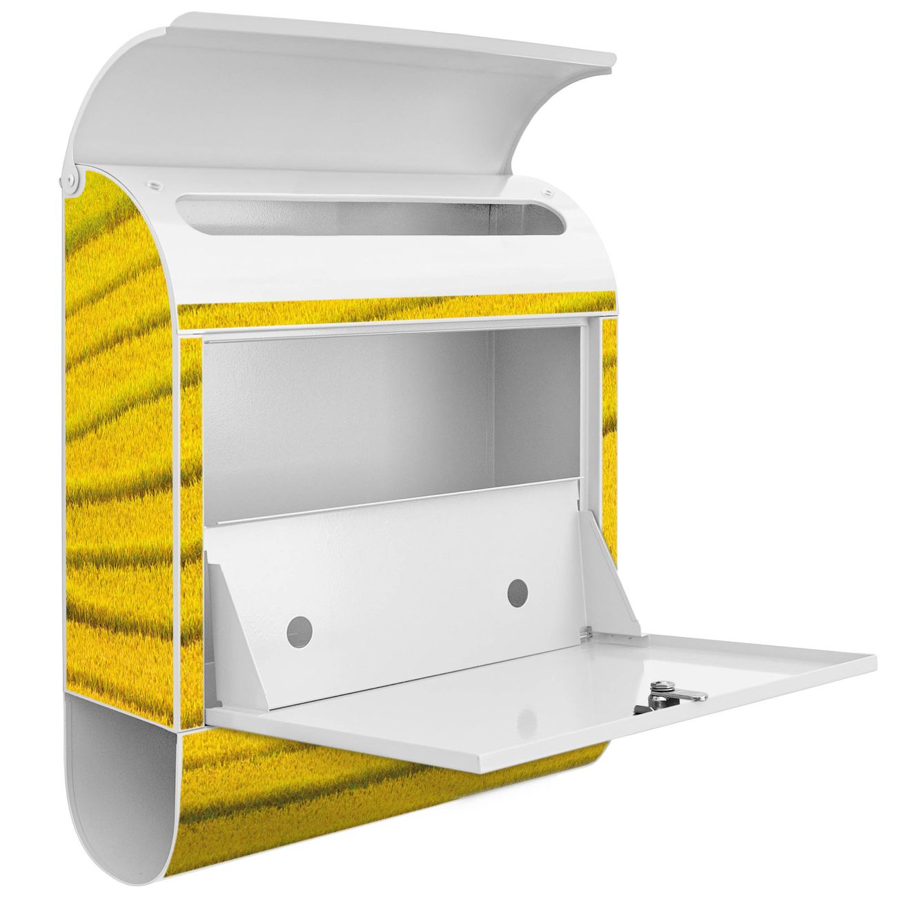 Der banjado Standbriefkasten mit Motiv Motiv Reisfeld Vietnam kombiniert großzügigen Stauraum mit modernem Design. Durch das geräumige Fach finden auch große A4-Sendungen problemlos Platz. Die integrierte Zeitungsrolle sorgt dafür, dass Tageszeitungen und Magazine separat und griffbereit untergebracht sind. Der pulverbeschichtete Standfuß ist farblich passend zum Briefkasten gestaltet und sorgt für ein stimmiges Gesamtbild. Mit dem individuellen Motiv setzen Sie einen optischen Akzent, der sowohl praktisch als auch dekorativ ist.