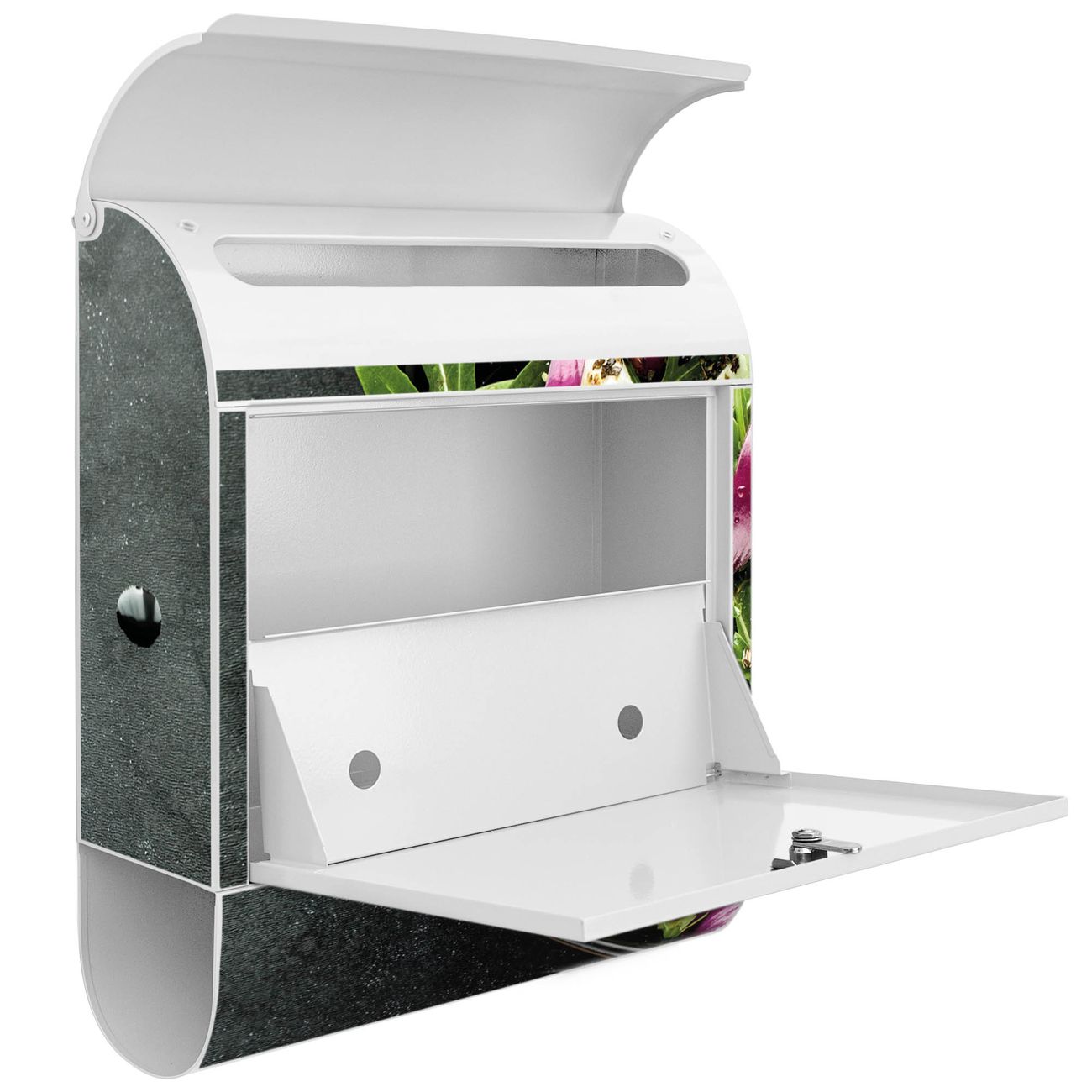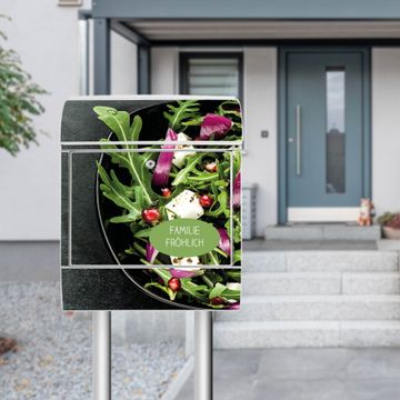 Der banjado Standbriefkasten mit Motiv Motiv Salat kombiniert großzügigen Stauraum mit modernem Design. Durch das geräumige Fach finden auch große A4-Sendungen problemlos Platz. Die integrierte Zeitungsrolle sorgt dafür, dass Tageszeitungen und Magazine separat und griffbereit untergebracht sind. Der pulverbeschichtete Standfuß ist farblich passend zum Briefkasten gestaltet und sorgt für ein stimmiges Gesamtbild. Mit dem individuellen Motiv setzen Sie einen optischen Akzent, der sowohl praktisch als auch dekorativ ist.