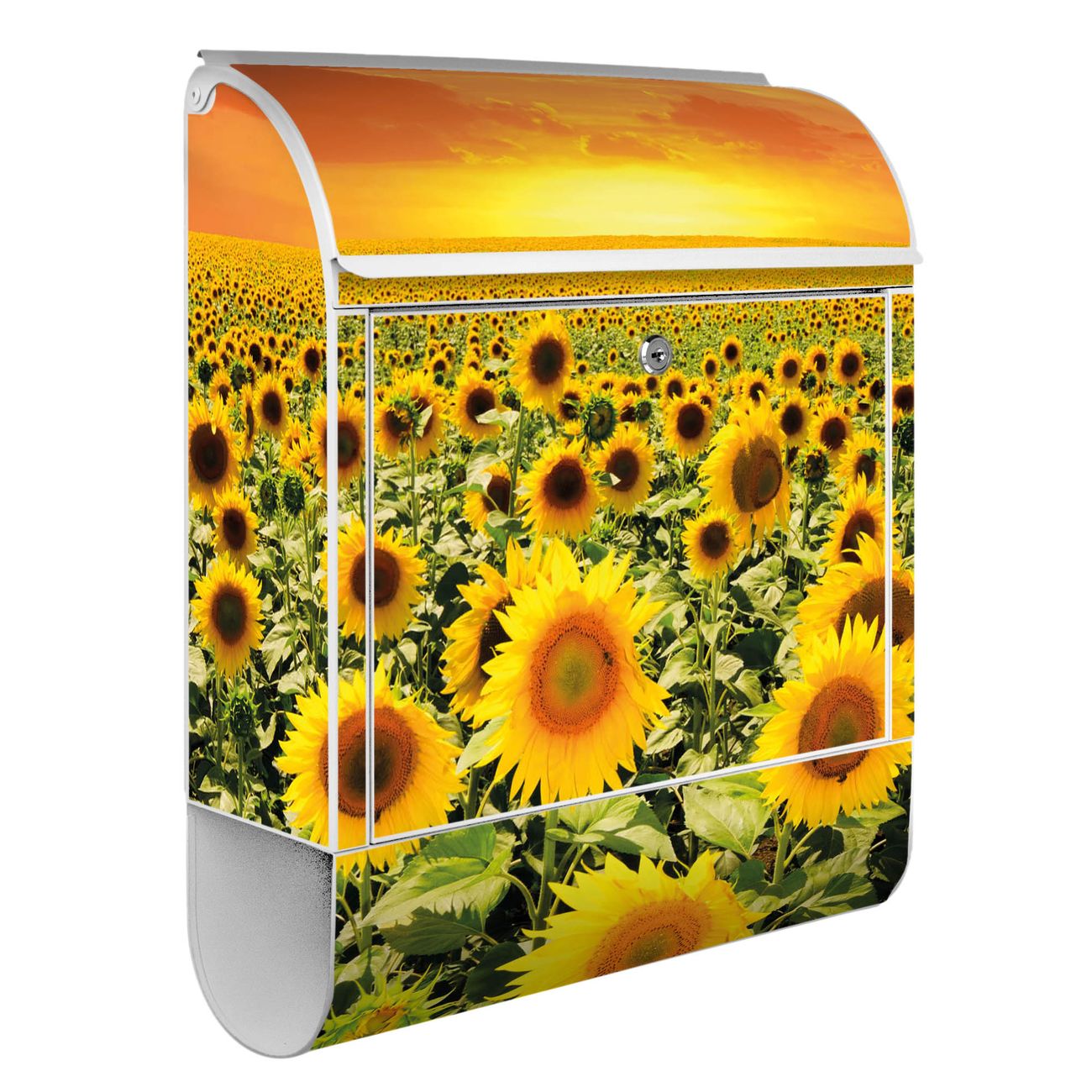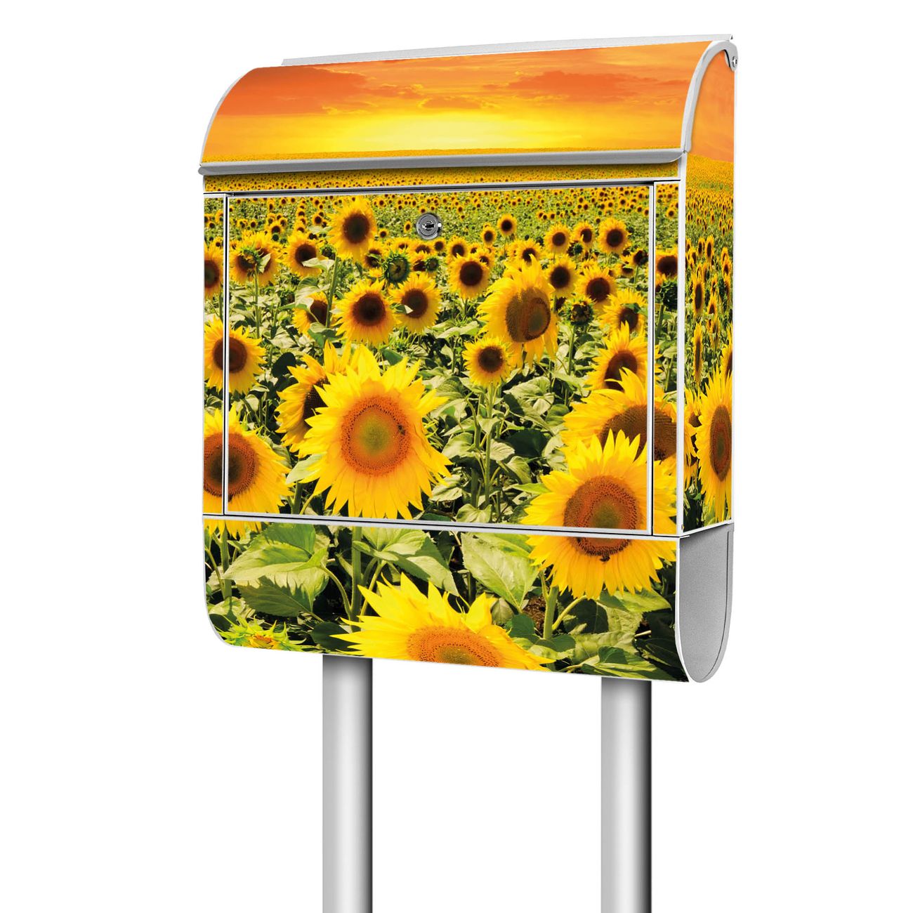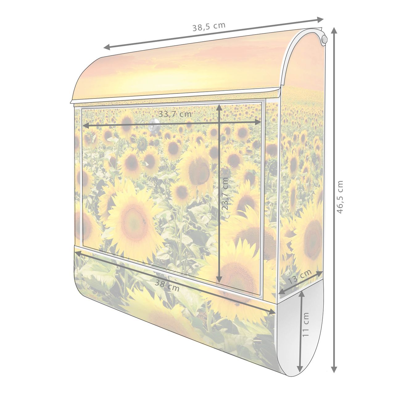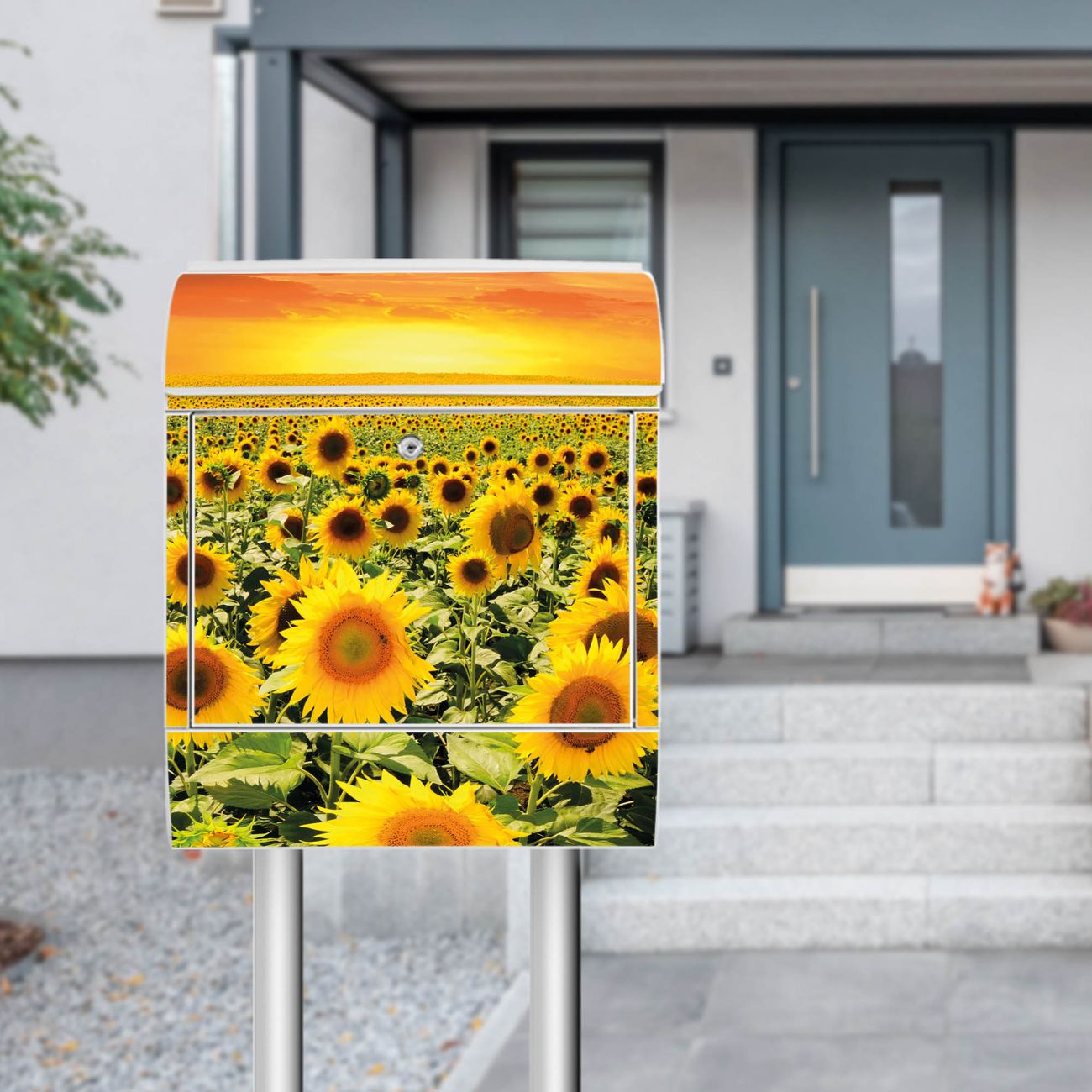 Der banjado Standbriefkasten mit Motiv Motiv Sonnenblumenmeer kombiniert großzügigen Stauraum mit modernem Design. Durch das geräumige Fach finden auch große A4-Sendungen problemlos Platz. Die integrierte Zeitungsrolle sorgt dafür, dass Tageszeitungen und Magazine separat und griffbereit untergebracht sind. Der pulverbeschichtete Standfuß ist farblich passend zum Briefkasten gestaltet und sorgt für ein stimmiges Gesamtbild. Mit dem individuellen Motiv setzen Sie einen optischen Akzent, der sowohl praktisch als auch dekorativ ist.