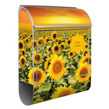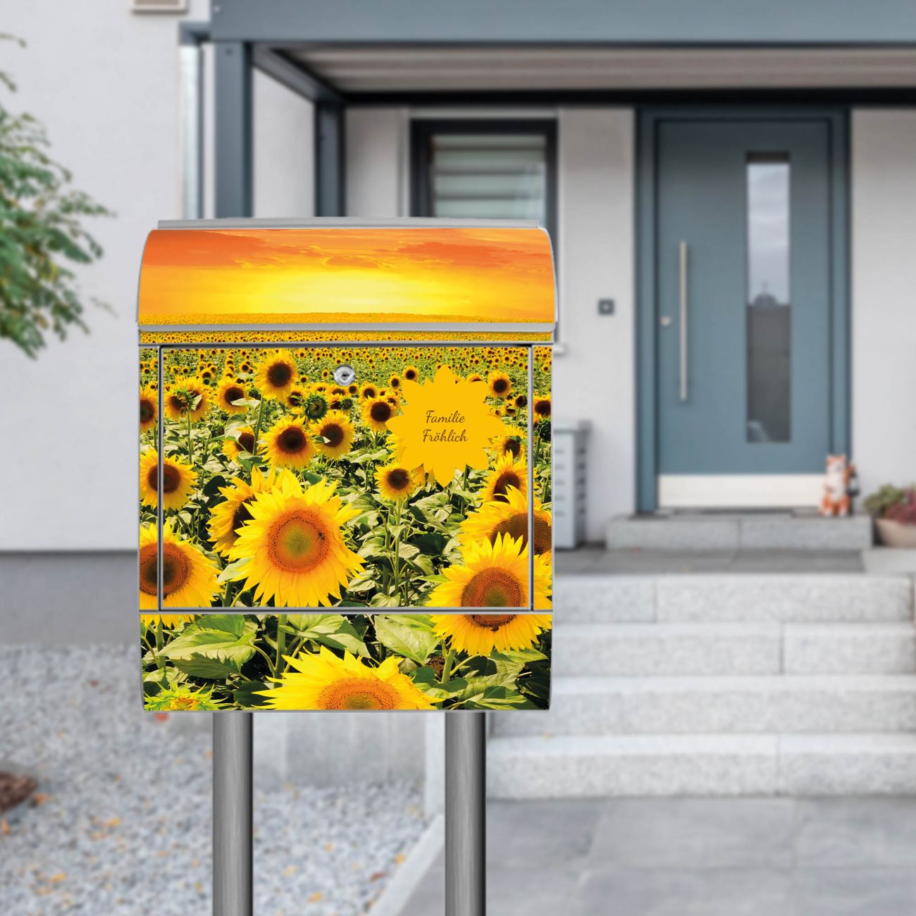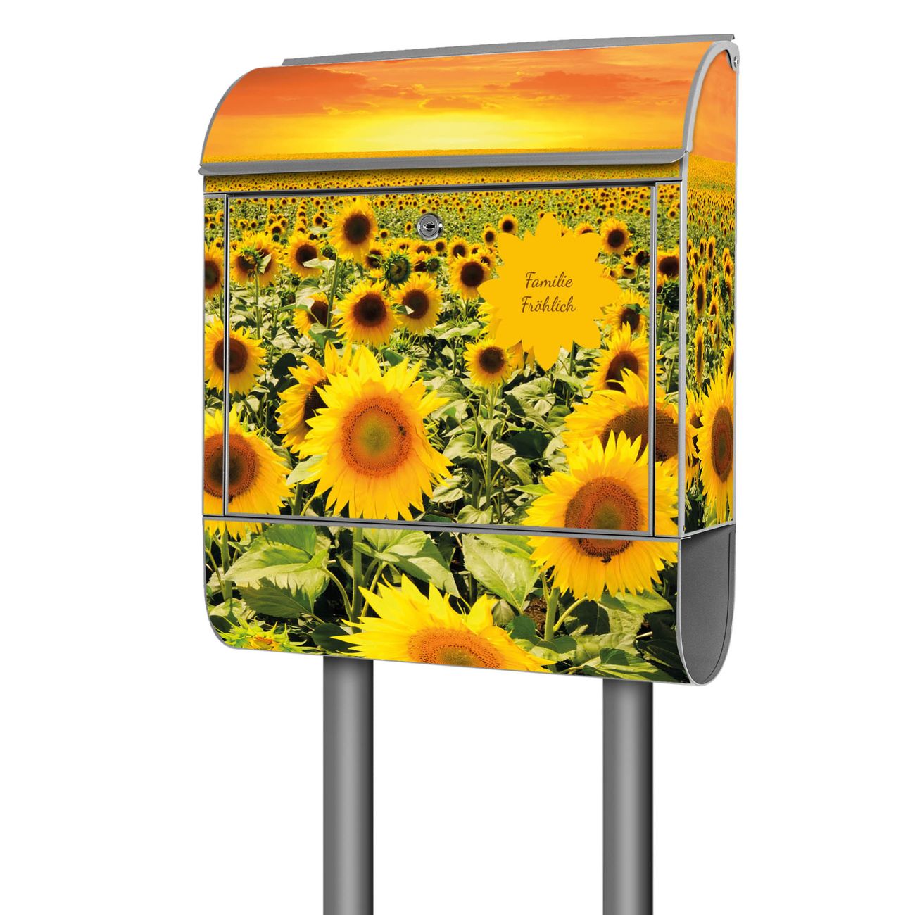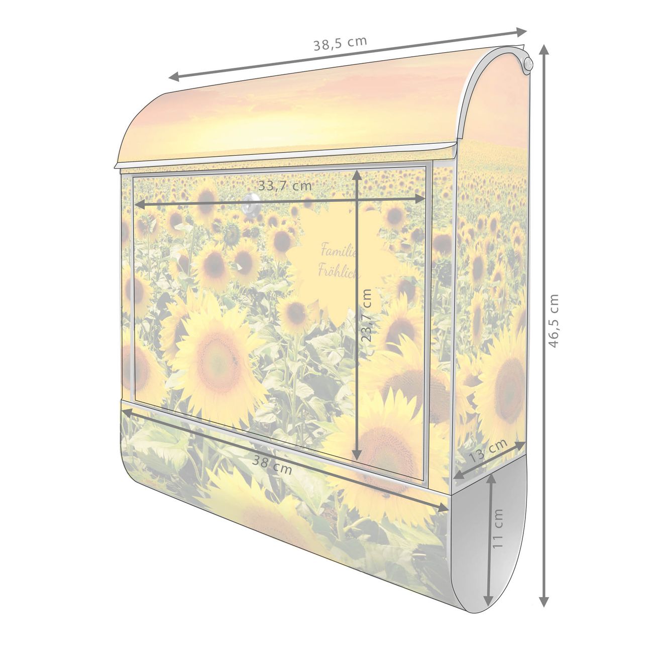 Der banjado Standbriefkasten mit Motiv Motiv Sonnenblumenmeer kombiniert großzügigen Stauraum mit modernem Design. Durch das geräumige Fach finden auch große A4-Sendungen problemlos Platz. Die integrierte Zeitungsrolle sorgt dafür, dass Tageszeitungen und Magazine separat und griffbereit untergebracht sind. Der pulverbeschichtete Standfuß ist farblich passend zum Briefkasten gestaltet und sorgt für ein stimmiges Gesamtbild. Mit dem individuellen Motiv setzen Sie einen optischen Akzent, der sowohl praktisch als auch dekorativ ist.