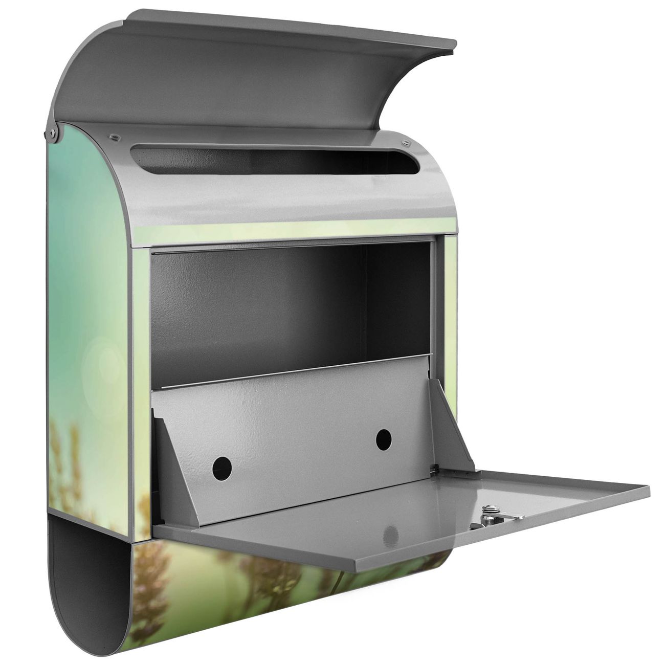 Der banjado Standbriefkasten mit Motiv Motiv Sonnenlavendel kombiniert großzügigen Stauraum mit modernem Design. Durch das geräumige Fach finden auch große A4-Sendungen problemlos Platz. Die integrierte Zeitungsrolle sorgt dafür, dass Tageszeitungen und Magazine separat und griffbereit untergebracht sind. Der pulverbeschichtete Standfuß ist farblich passend zum Briefkasten gestaltet und sorgt für ein stimmiges Gesamtbild. Mit dem individuellen Motiv setzen Sie einen optischen Akzent, der sowohl praktisch als auch dekorativ ist.