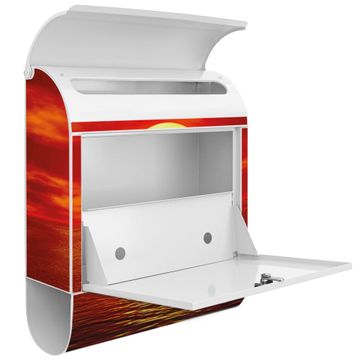 Der banjado Standbriefkasten mit Motiv Motiv Sonnenuntergang kombiniert großzügigen Stauraum mit modernem Design. Durch das geräumige Fach finden auch große A4-Sendungen problemlos Platz. Die integrierte Zeitungsrolle sorgt dafür, dass Tageszeitungen und Magazine separat und griffbereit untergebracht sind. Der pulverbeschichtete Standfuß ist farblich passend zum Briefkasten gestaltet und sorgt für ein stimmiges Gesamtbild. Mit dem individuellen Motiv setzen Sie einen optischen Akzent, der sowohl praktisch als auch dekorativ ist.