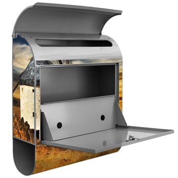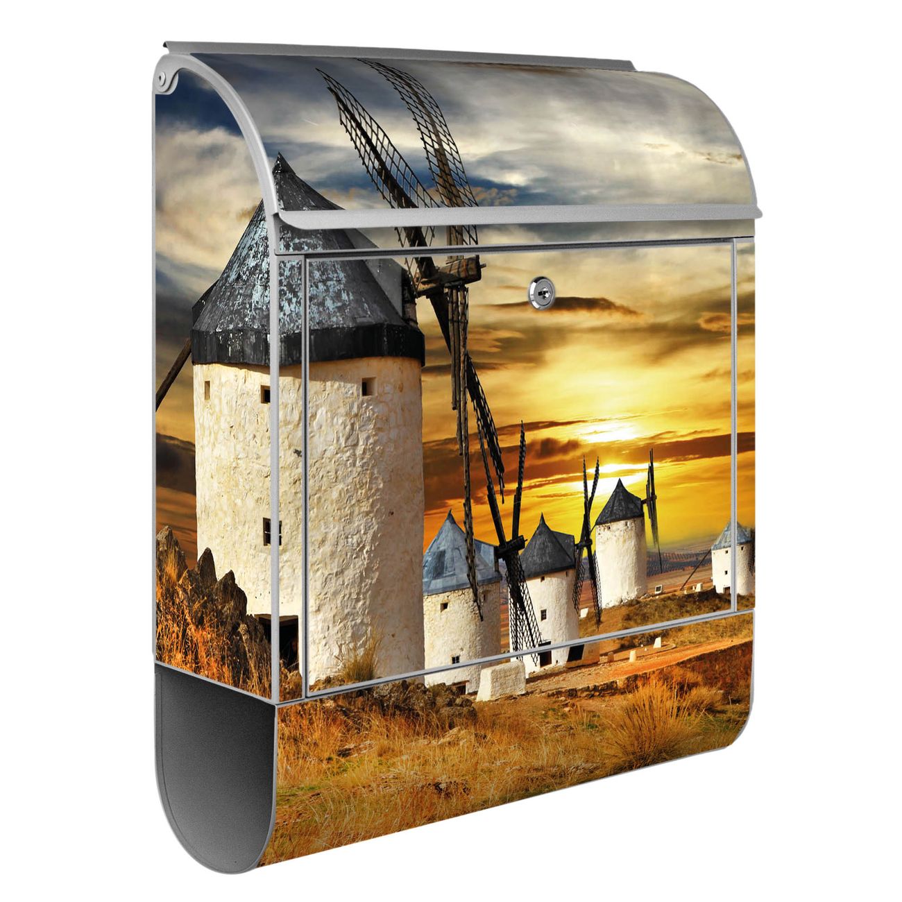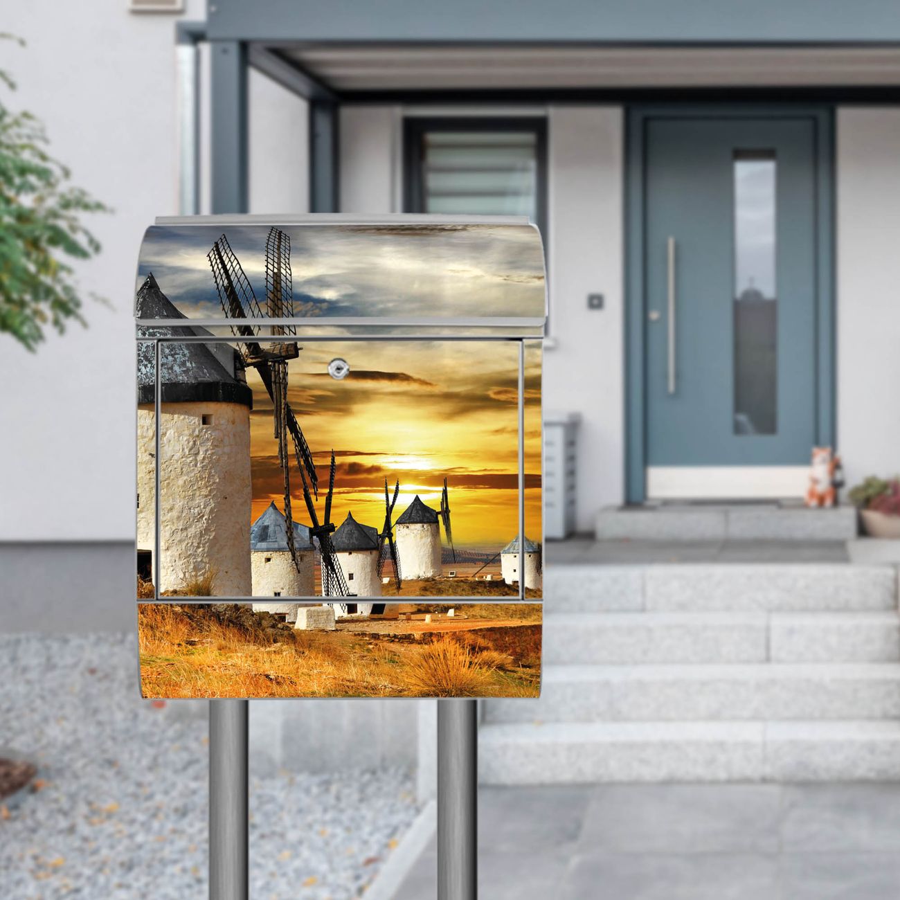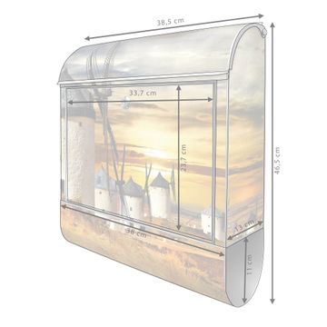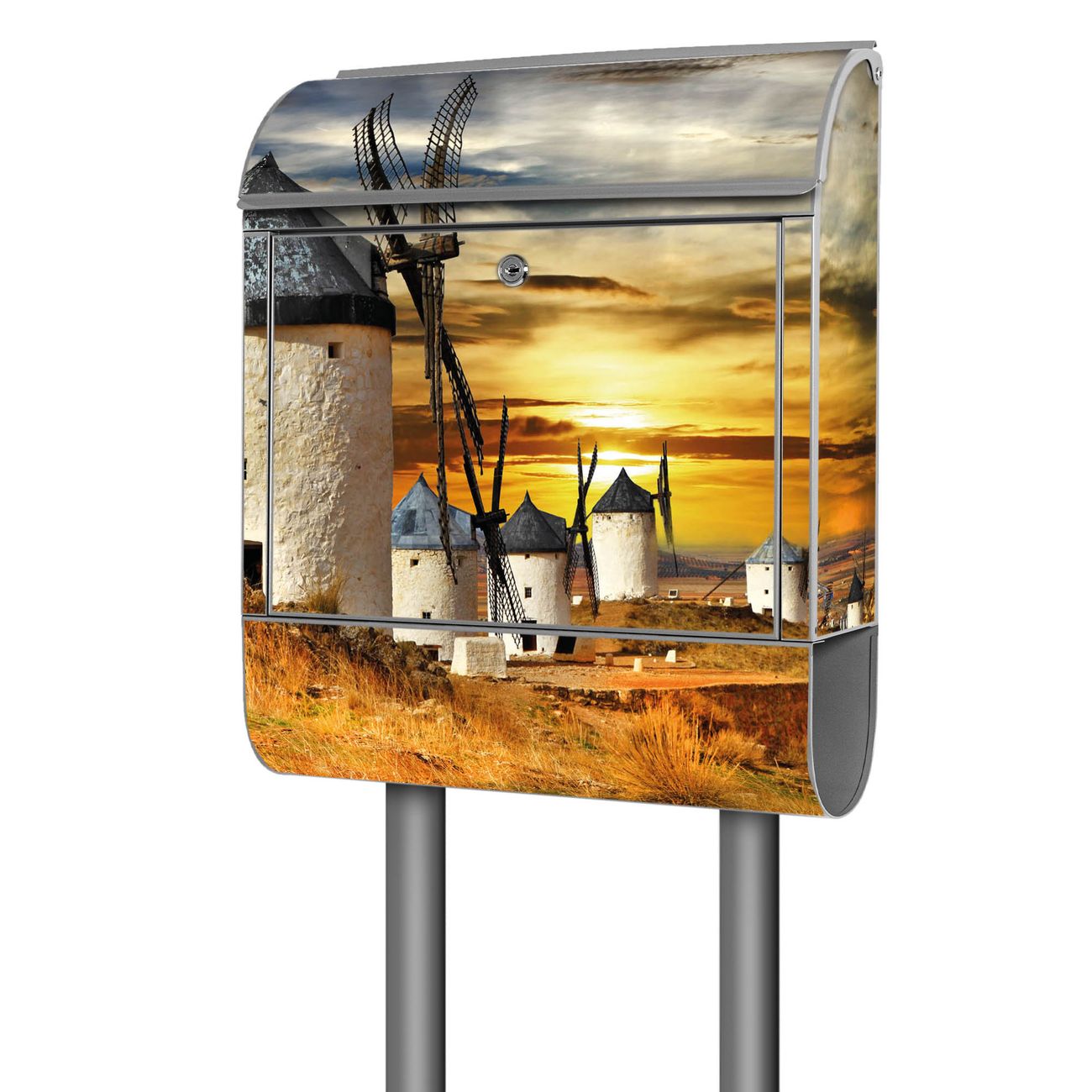 Der banjado Standbriefkasten mit Motiv Motiv Spanische Windmühlen kombiniert großzügigen Stauraum mit modernem Design. Durch das geräumige Fach finden auch große A4-Sendungen problemlos Platz. Die integrierte Zeitungsrolle sorgt dafür, dass Tageszeitungen und Magazine separat und griffbereit untergebracht sind. Der pulverbeschichtete Standfuß ist farblich passend zum Briefkasten gestaltet und sorgt für ein stimmiges Gesamtbild. Mit dem individuellen Motiv setzen Sie einen optischen Akzent, der sowohl praktisch als auch dekorativ ist.