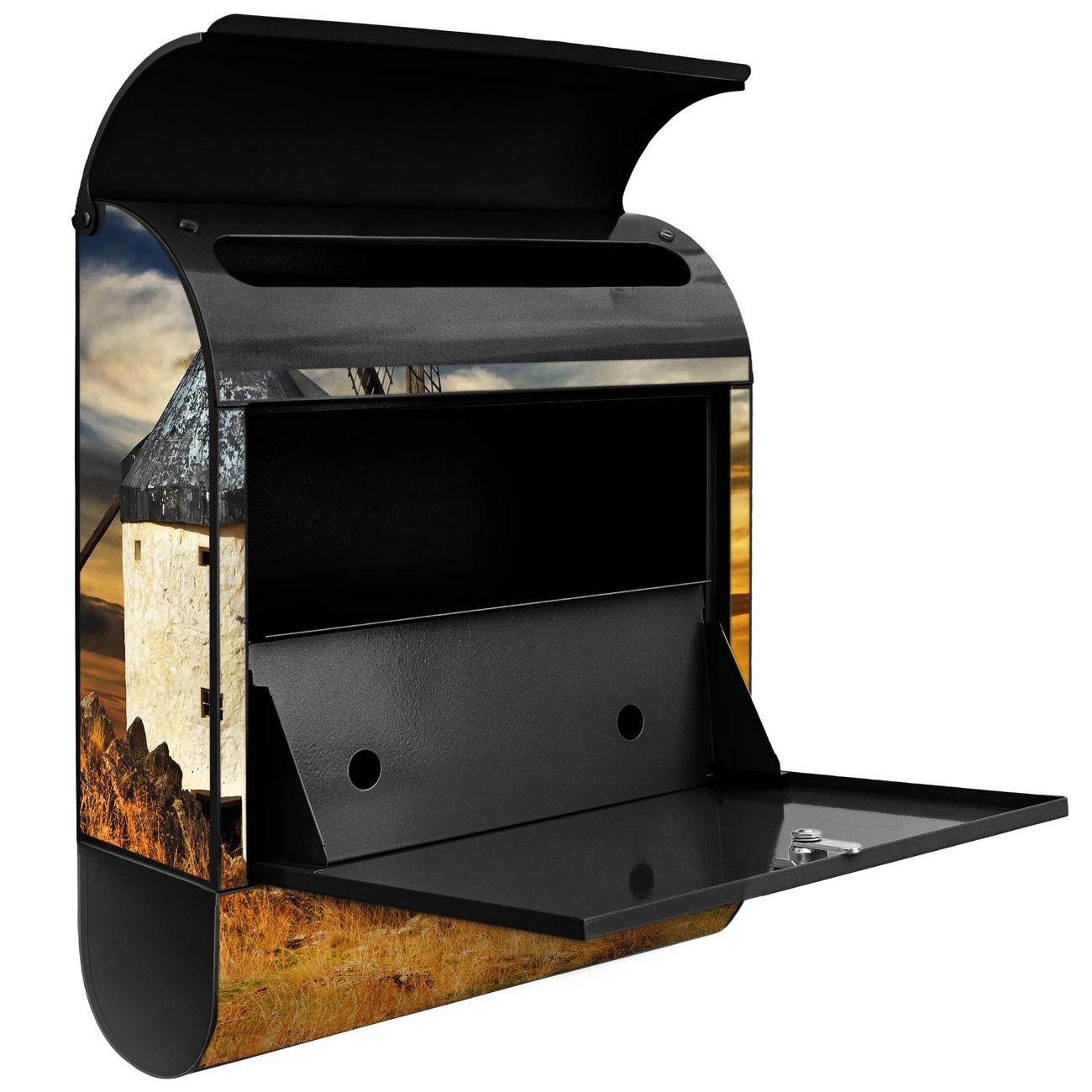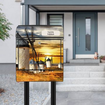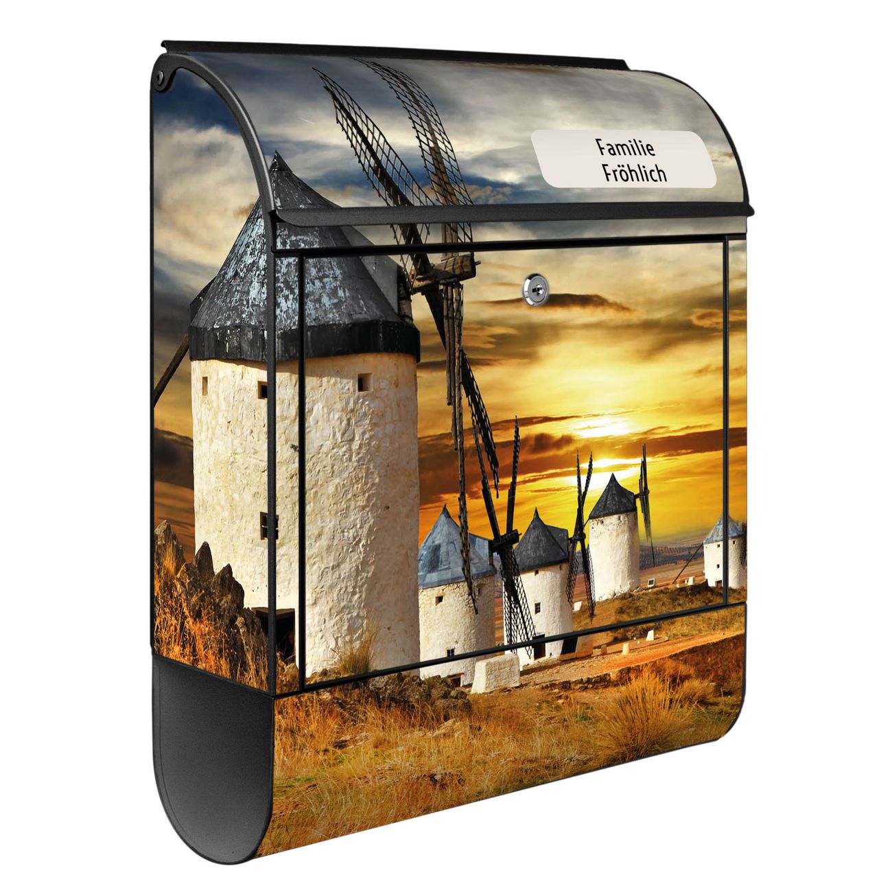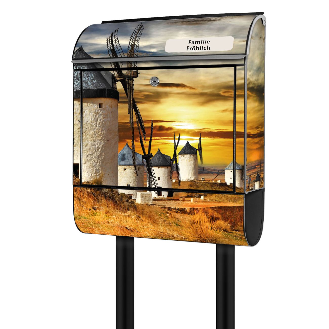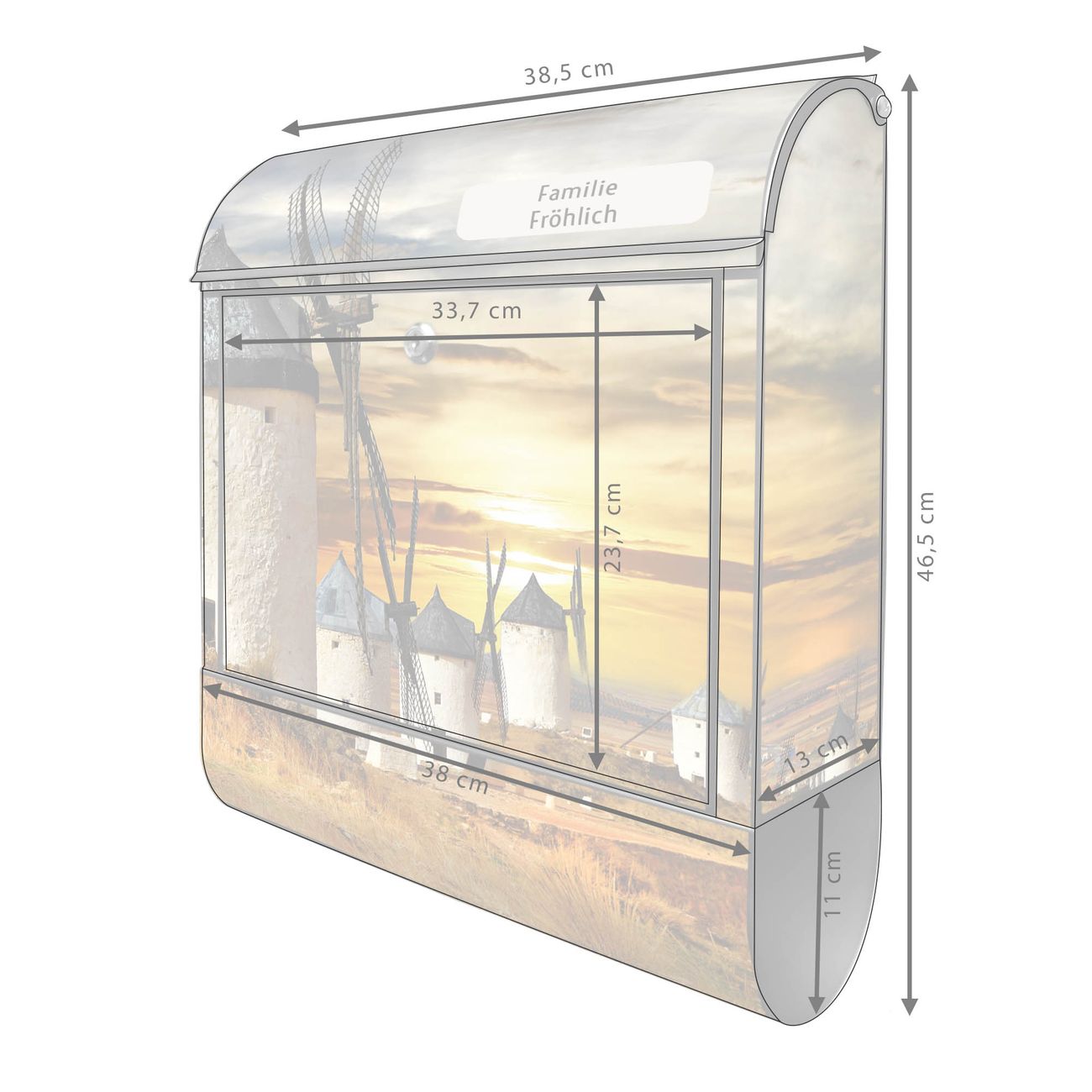 Der banjado Standbriefkasten mit Motiv Motiv Spanische Windmühlen kombiniert großzügigen Stauraum mit modernem Design. Durch das geräumige Fach finden auch große A4-Sendungen problemlos Platz. Die integrierte Zeitungsrolle sorgt dafür, dass Tageszeitungen und Magazine separat und griffbereit untergebracht sind. Der pulverbeschichtete Standfuß ist farblich passend zum Briefkasten gestaltet und sorgt für ein stimmiges Gesamtbild. Mit dem individuellen Motiv setzen Sie einen optischen Akzent, der sowohl praktisch als auch dekorativ ist.