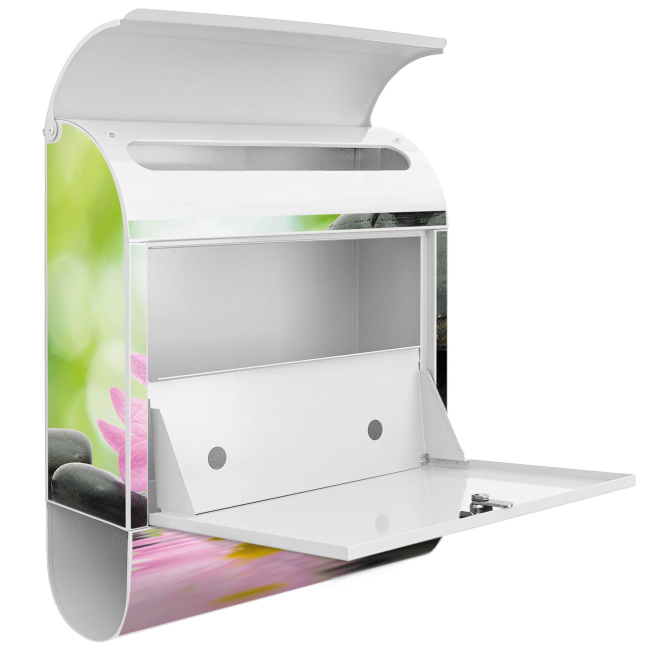 Der banjado Standbriefkasten mit Motiv Motiv Steine & Relax 2 kombiniert großzügigen Stauraum mit modernem Design. Durch das geräumige Fach finden auch große A4-Sendungen problemlos Platz. Die integrierte Zeitungsrolle sorgt dafür, dass Tageszeitungen und Magazine separat und griffbereit untergebracht sind. Der pulverbeschichtete Standfuß ist farblich passend zum Briefkasten gestaltet und sorgt für ein stimmiges Gesamtbild. Mit dem individuellen Motiv setzen Sie einen optischen Akzent, der sowohl praktisch als auch dekorativ ist.