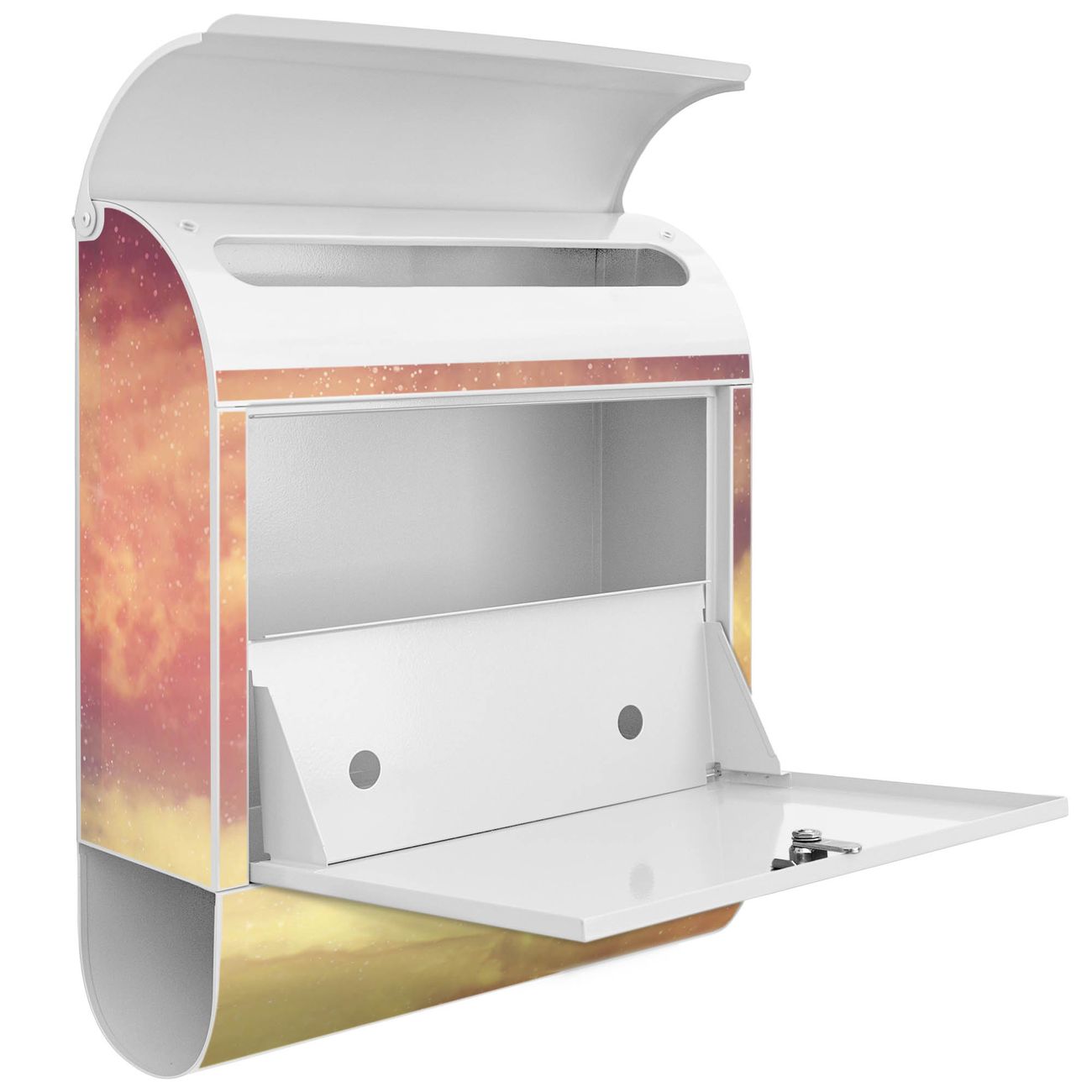 Der banjado Standbriefkasten mit Motiv Motiv Sternenhimmel kombiniert großzügigen Stauraum mit modernem Design. Durch das geräumige Fach finden auch große A4-Sendungen problemlos Platz. Die integrierte Zeitungsrolle sorgt dafür, dass Tageszeitungen und Magazine separat und griffbereit untergebracht sind. Der pulverbeschichtete Standfuß ist farblich passend zum Briefkasten gestaltet und sorgt für ein stimmiges Gesamtbild. Mit dem individuellen Motiv setzen Sie einen optischen Akzent, der sowohl praktisch als auch dekorativ ist.