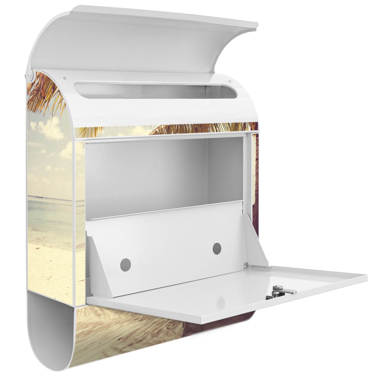 Der banjado Standbriefkasten mit Motiv Motiv Südseestrand kombiniert großzügigen Stauraum mit modernem Design. Durch das geräumige Fach finden auch große A4-Sendungen problemlos Platz. Die integrierte Zeitungsrolle sorgt dafür, dass Tageszeitungen und Magazine separat und griffbereit untergebracht sind. Der pulverbeschichtete Standfuß ist farblich passend zum Briefkasten gestaltet und sorgt für ein stimmiges Gesamtbild. Mit dem individuellen Motiv setzen Sie einen optischen Akzent, der sowohl praktisch als auch dekorativ ist.