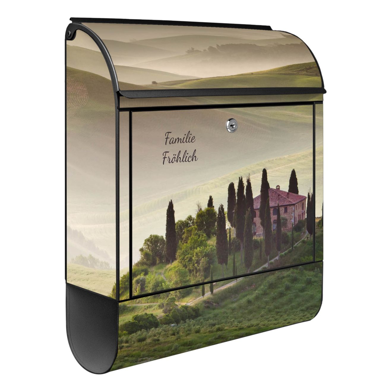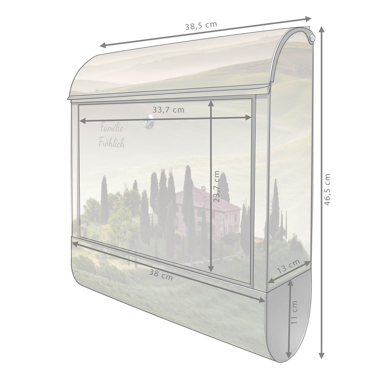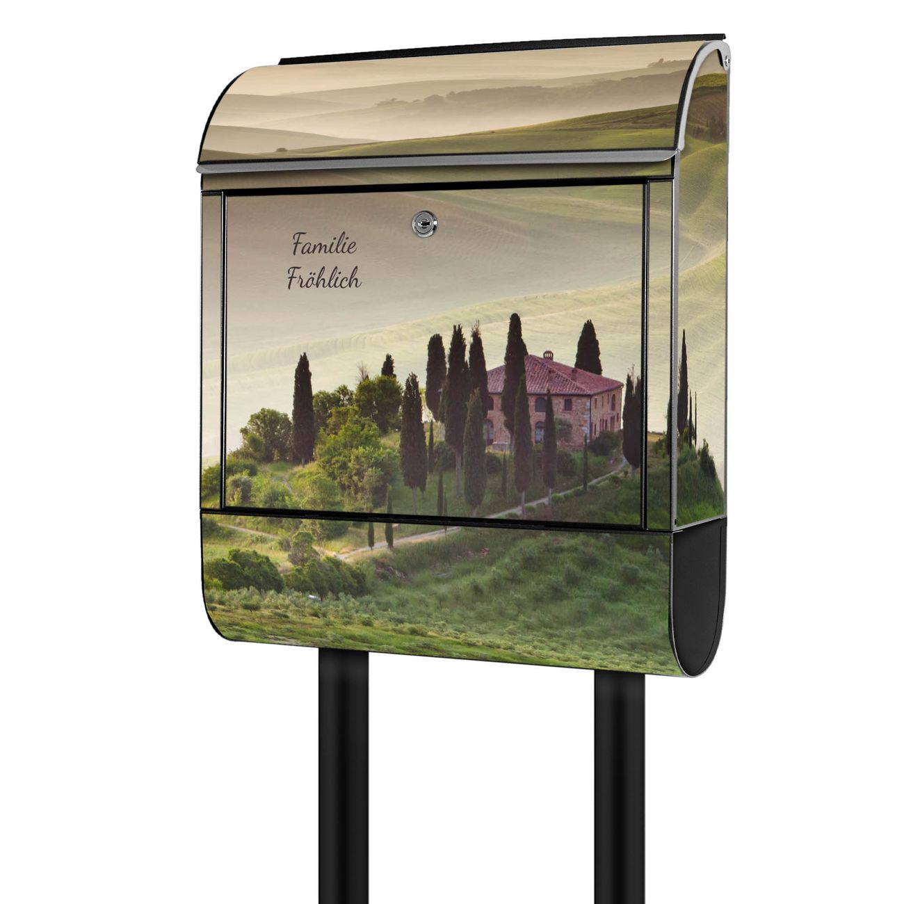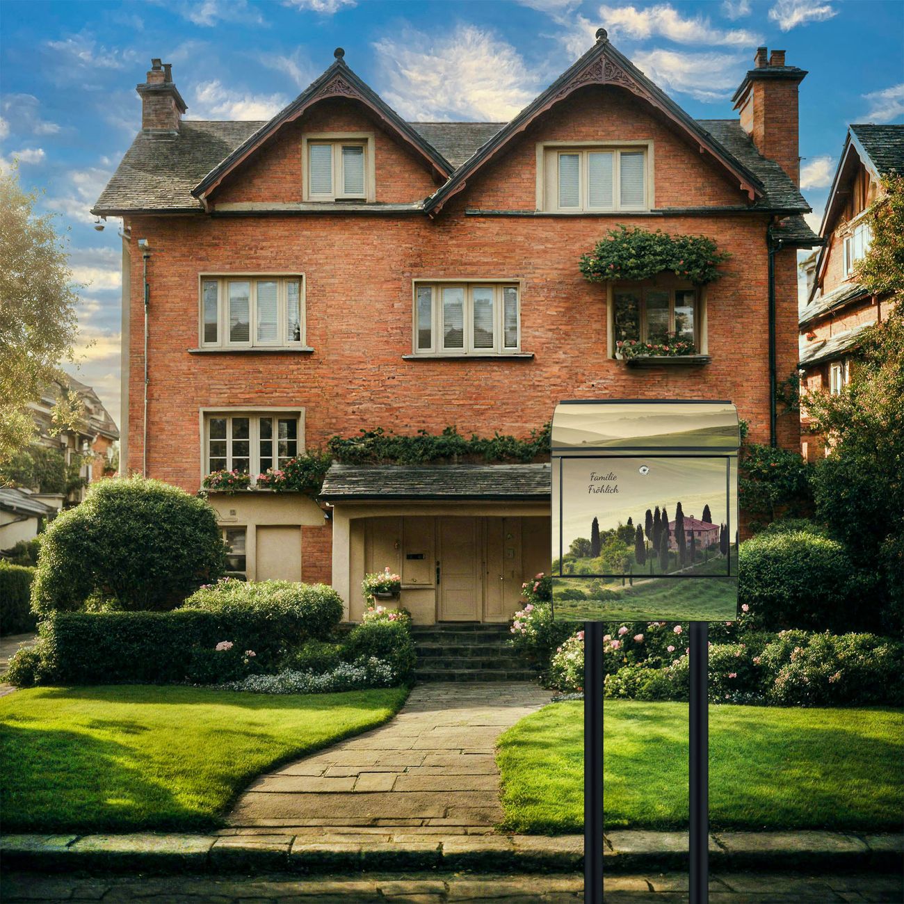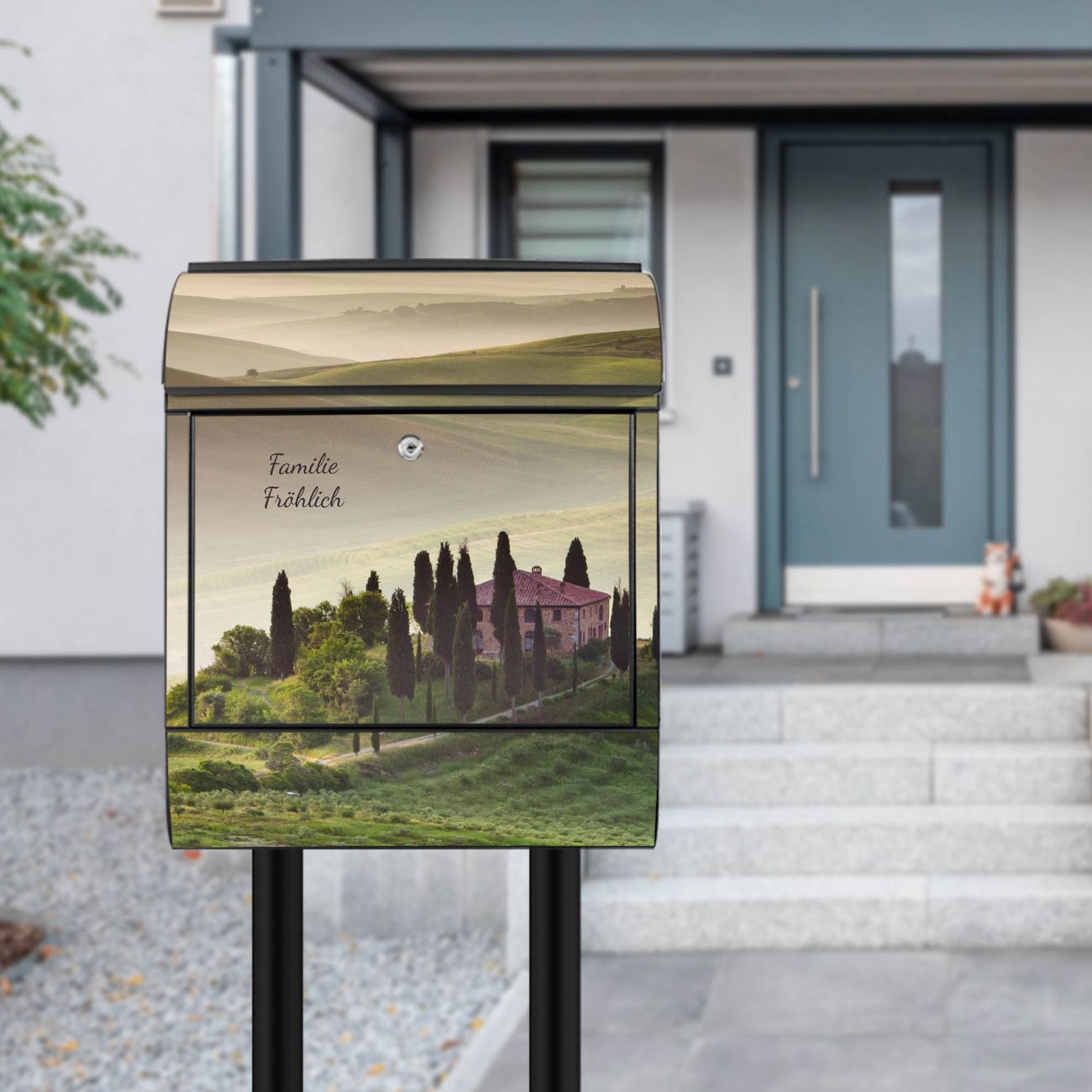 Der banjado Standbriefkasten mit Motiv Motiv Toscana kombiniert großzügigen Stauraum mit modernem Design. Durch das geräumige Fach finden auch große A4-Sendungen problemlos Platz. Die integrierte Zeitungsrolle sorgt dafür, dass Tageszeitungen und Magazine separat und griffbereit untergebracht sind. Der pulverbeschichtete Standfuß ist farblich passend zum Briefkasten gestaltet und sorgt für ein stimmiges Gesamtbild. Mit dem individuellen Motiv setzen Sie einen optischen Akzent, der sowohl praktisch als auch dekorativ ist.