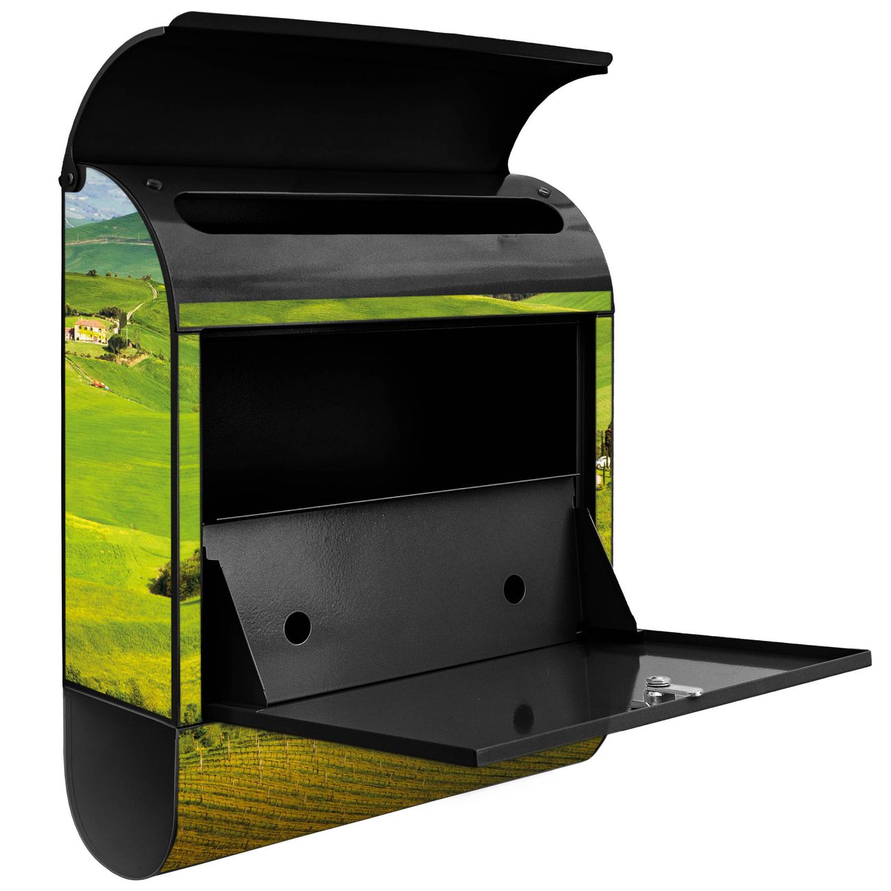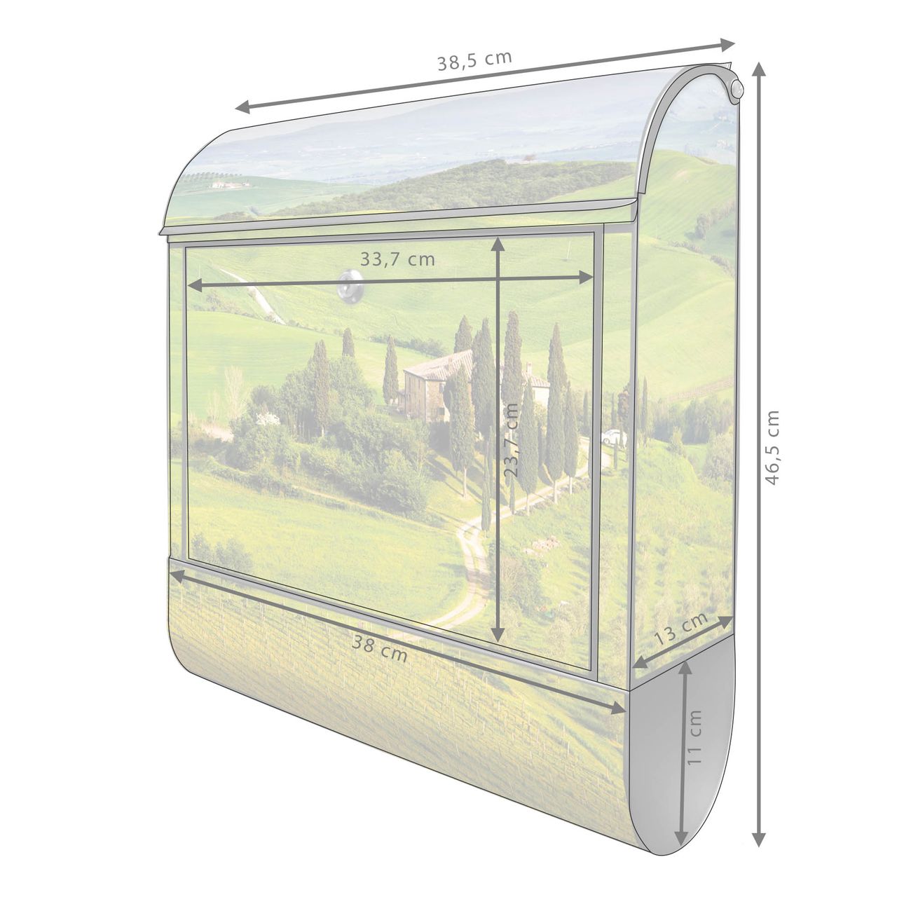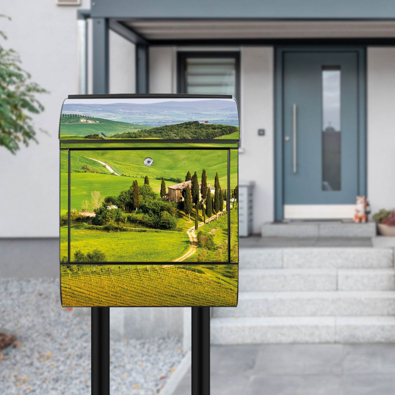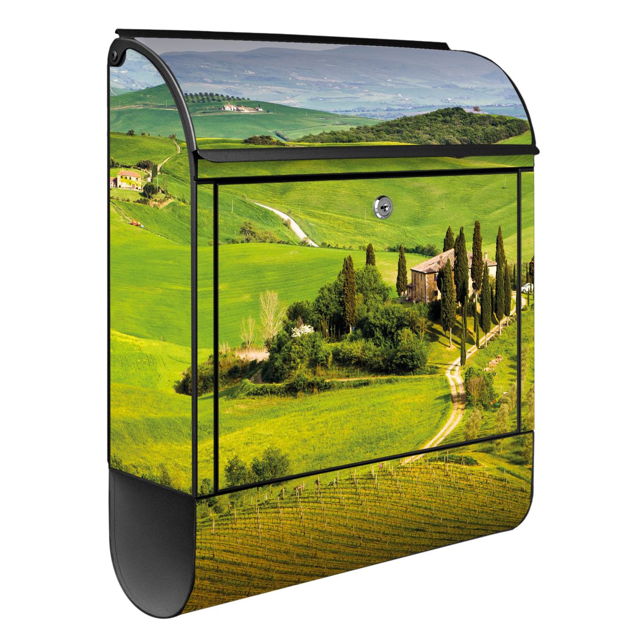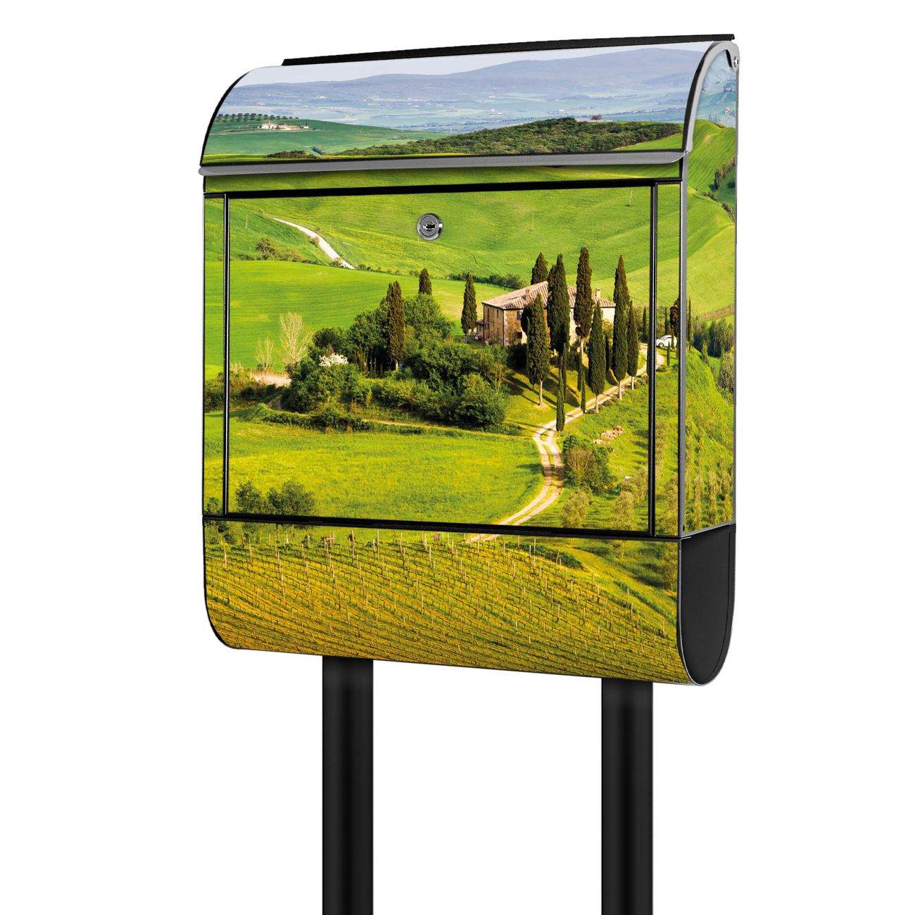 Der banjado Standbriefkasten mit Motiv Motiv Toskana kombiniert großzügigen Stauraum mit modernem Design. Durch das geräumige Fach finden auch große A4-Sendungen problemlos Platz. Die integrierte Zeitungsrolle sorgt dafür, dass Tageszeitungen und Magazine separat und griffbereit untergebracht sind. Der pulverbeschichtete Standfuß ist farblich passend zum Briefkasten gestaltet und sorgt für ein stimmiges Gesamtbild. Mit dem individuellen Motiv setzen Sie einen optischen Akzent, der sowohl praktisch als auch dekorativ ist.