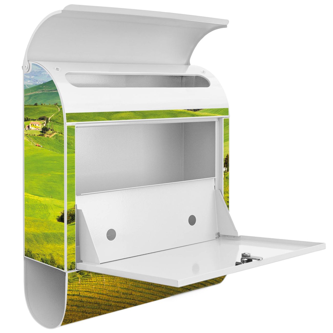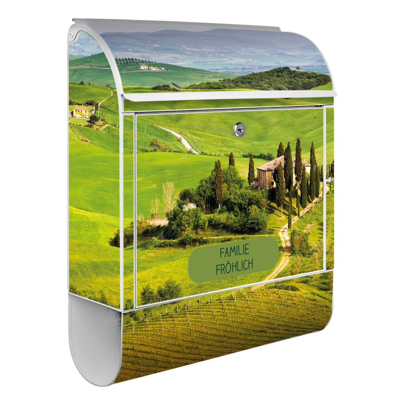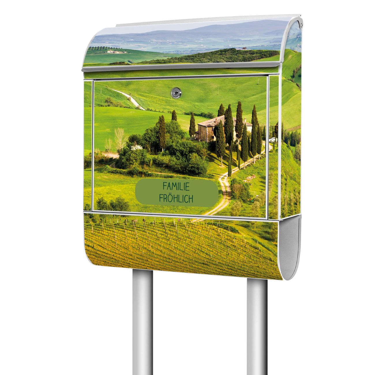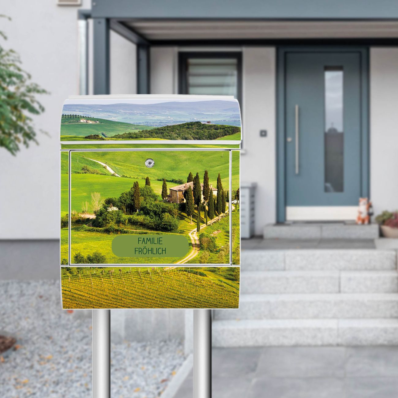 Der banjado Standbriefkasten mit Motiv Motiv Toskana kombiniert großzügigen Stauraum mit modernem Design. Durch das geräumige Fach finden auch große A4-Sendungen problemlos Platz. Die integrierte Zeitungsrolle sorgt dafür, dass Tageszeitungen und Magazine separat und griffbereit untergebracht sind. Der pulverbeschichtete Standfuß ist farblich passend zum Briefkasten gestaltet und sorgt für ein stimmiges Gesamtbild. Mit dem individuellen Motiv setzen Sie einen optischen Akzent, der sowohl praktisch als auch dekorativ ist.
