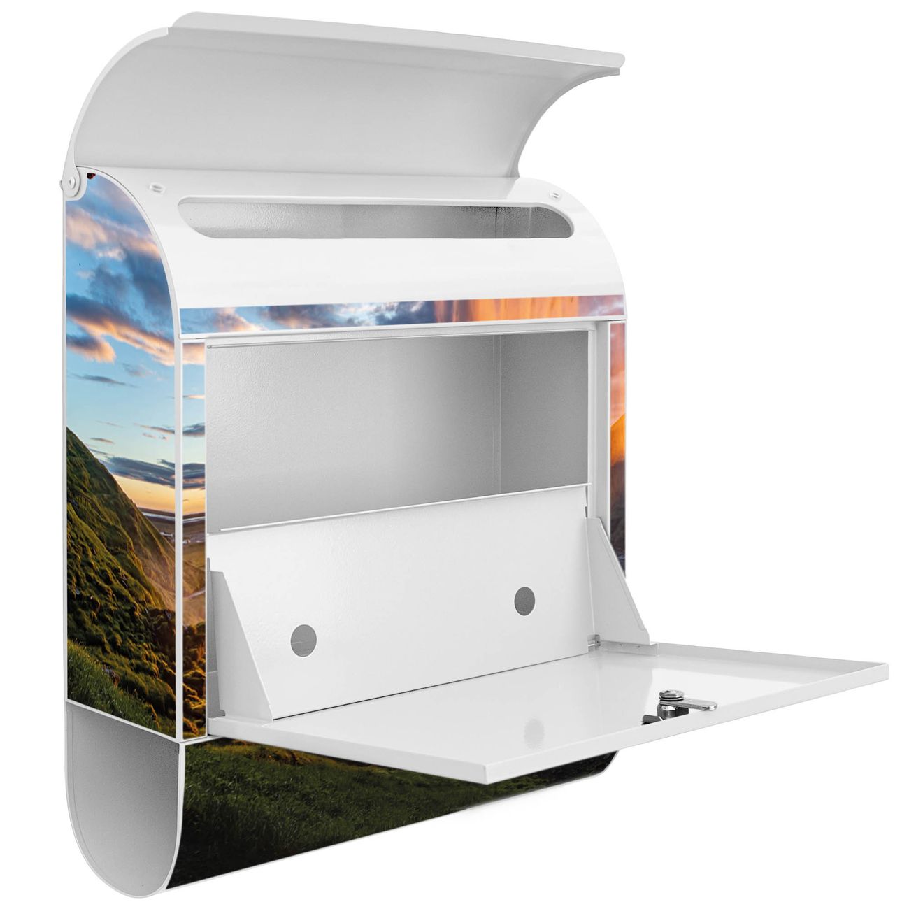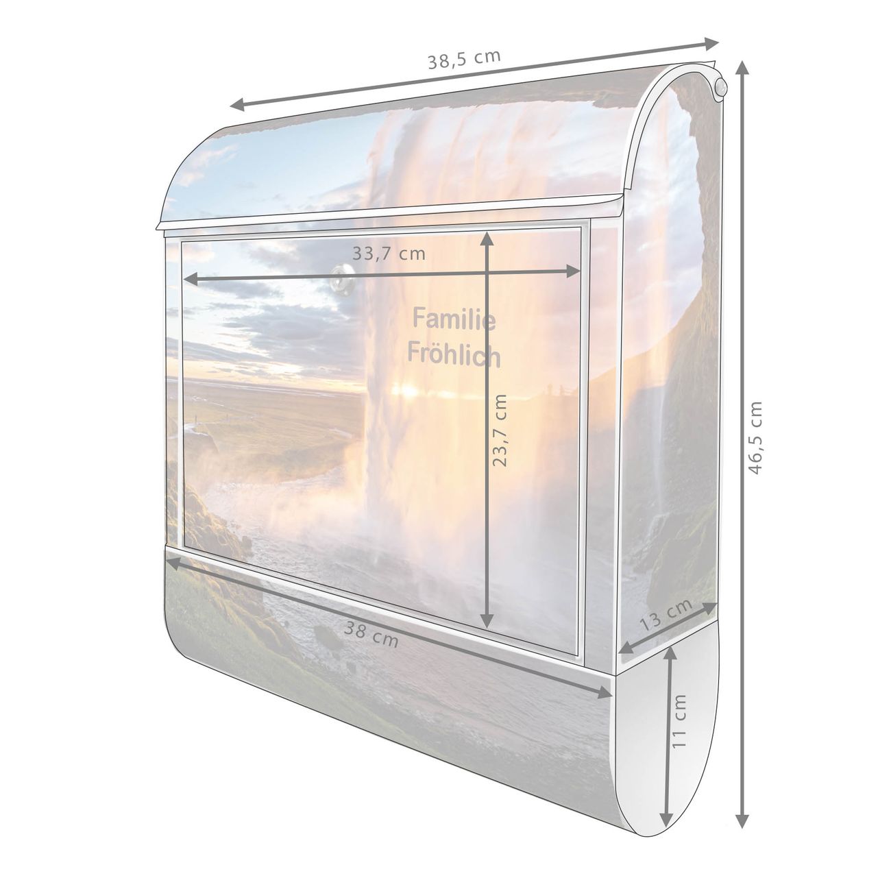 Der banjado Standbriefkasten mit Motiv Motiv Wasserfall im Sonnenlicht kombiniert großzügigen Stauraum mit modernem Design. Durch das geräumige Fach finden auch große A4-Sendungen problemlos Platz. Die integrierte Zeitungsrolle sorgt dafür, dass Tageszeitungen und Magazine separat und griffbereit untergebracht sind. Der pulverbeschichtete Standfuß ist farblich passend zum Briefkasten gestaltet und sorgt für ein stimmiges Gesamtbild. Mit dem individuellen Motiv setzen Sie einen optischen Akzent, der sowohl praktisch als auch dekorativ ist.