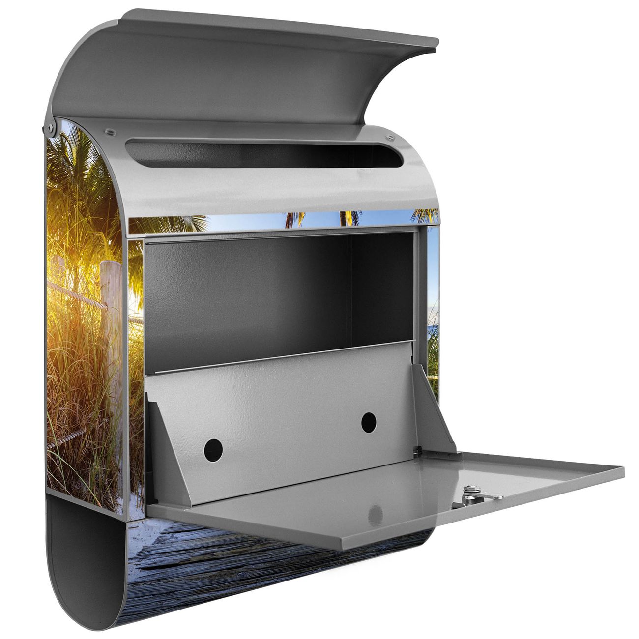 Der banjado Standbriefkasten mit Motiv Motiv Weg zum Strand kombiniert großzügigen Stauraum mit modernem Design. Durch das geräumige Fach finden auch große A4-Sendungen problemlos Platz. Die integrierte Zeitungsrolle sorgt dafür, dass Tageszeitungen und Magazine separat und griffbereit untergebracht sind. Der pulverbeschichtete Standfuß ist farblich passend zum Briefkasten gestaltet und sorgt für ein stimmiges Gesamtbild. Mit dem individuellen Motiv setzen Sie einen optischen Akzent, der sowohl praktisch als auch dekorativ ist.