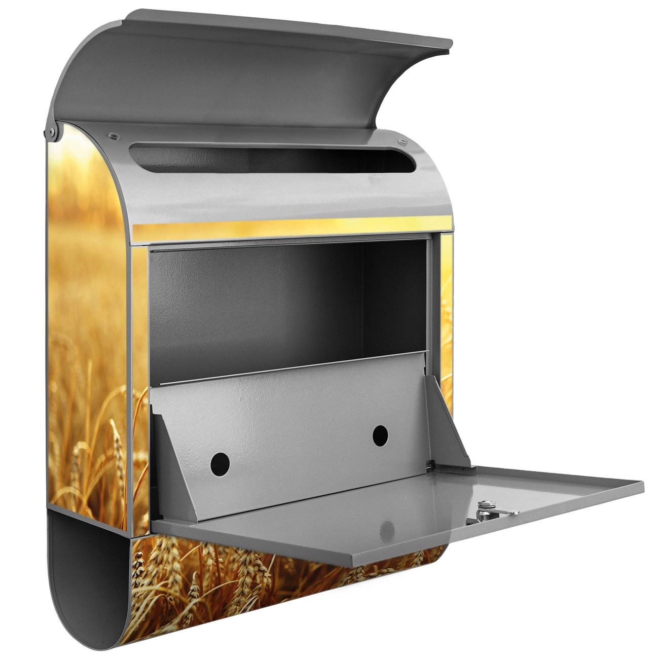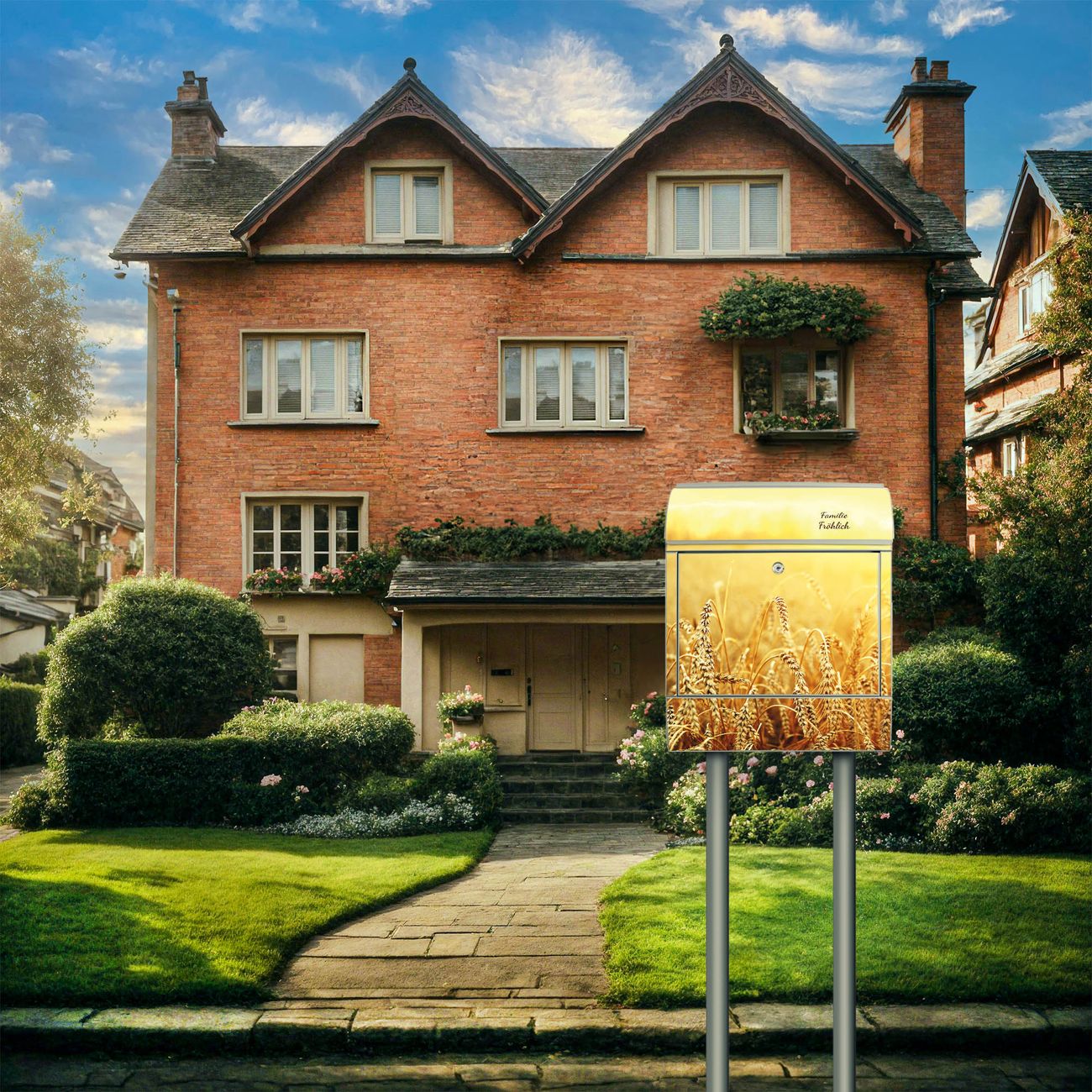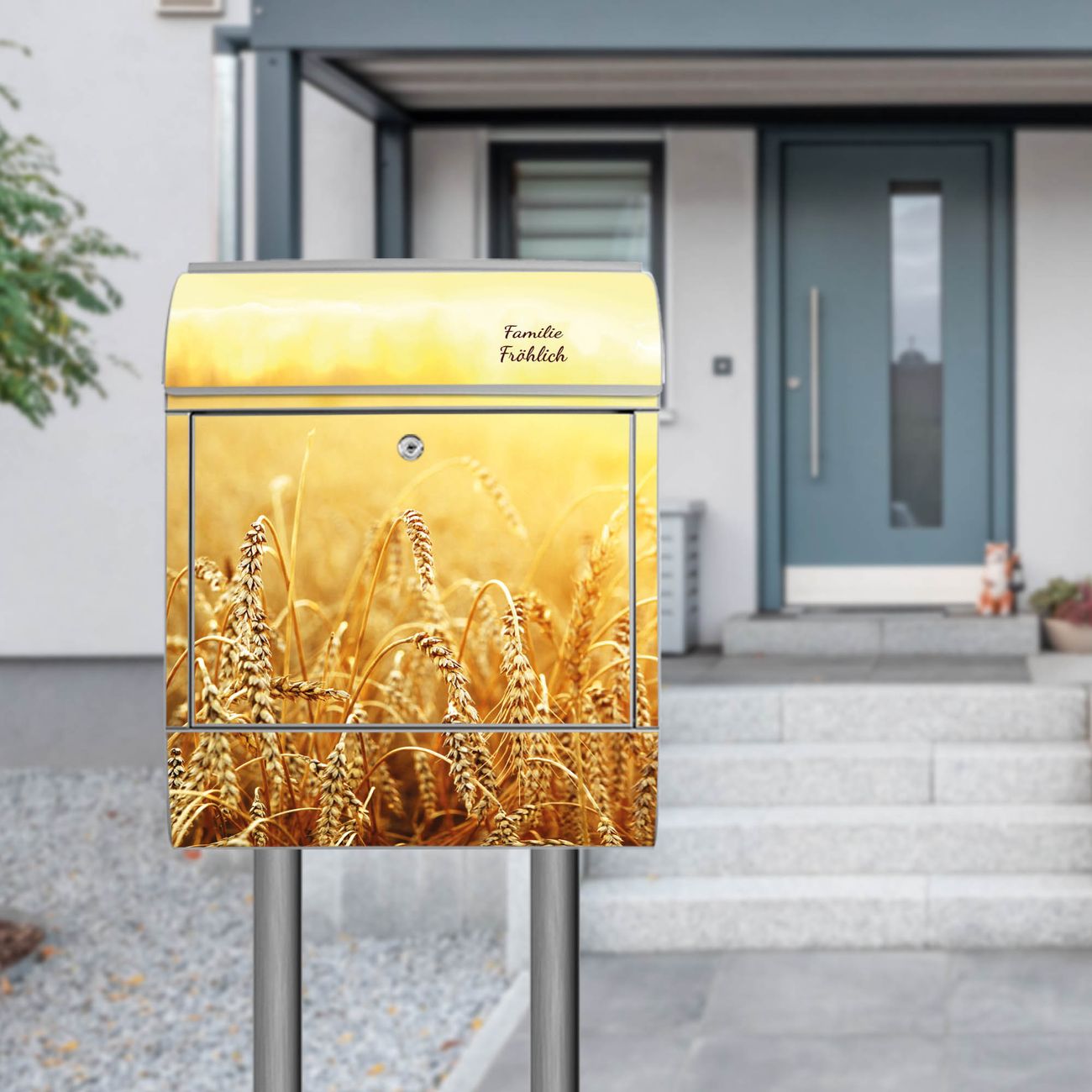 Der banjado Standbriefkasten mit Motiv Motiv Weizenfeld kombiniert großzügigen Stauraum mit modernem Design. Durch das geräumige Fach finden auch große A4-Sendungen problemlos Platz. Die integrierte Zeitungsrolle sorgt dafür, dass Tageszeitungen und Magazine separat und griffbereit untergebracht sind. Der pulverbeschichtete Standfuß ist farblich passend zum Briefkasten gestaltet und sorgt für ein stimmiges Gesamtbild. Mit dem individuellen Motiv setzen Sie einen optischen Akzent, der sowohl praktisch als auch dekorativ ist.