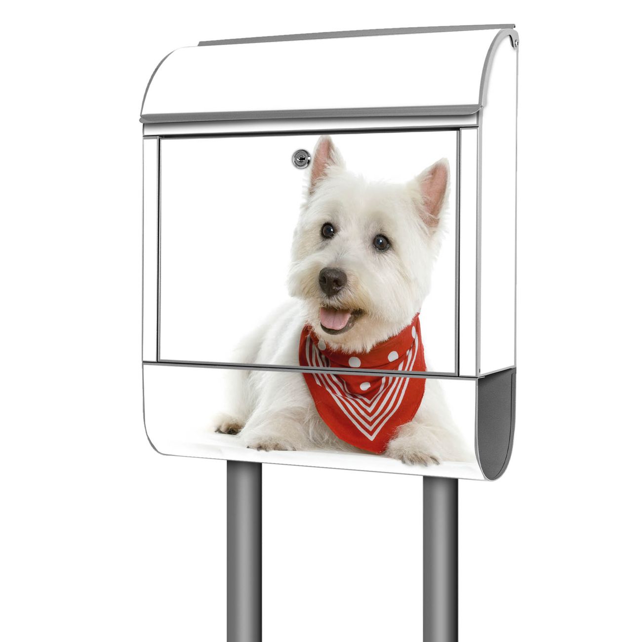 Der banjado Standbriefkasten mit Motiv Motiv Westie kombiniert großzügigen Stauraum mit modernem Design. Durch das geräumige Fach finden auch große A4-Sendungen problemlos Platz. Die integrierte Zeitungsrolle sorgt dafür, dass Tageszeitungen und Magazine separat und griffbereit untergebracht sind. Der pulverbeschichtete Standfuß ist farblich passend zum Briefkasten gestaltet und sorgt für ein stimmiges Gesamtbild. Mit dem individuellen Motiv setzen Sie einen optischen Akzent, der sowohl praktisch als auch dekorativ ist.