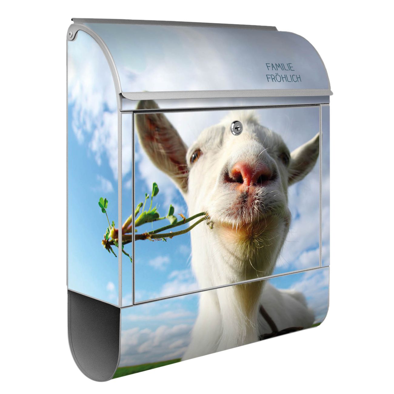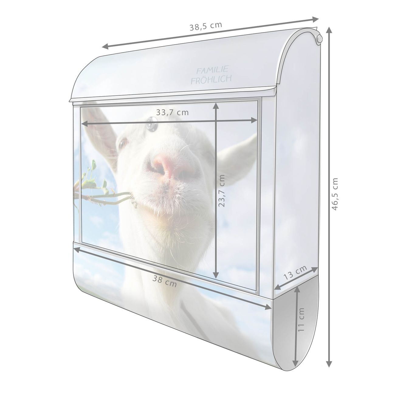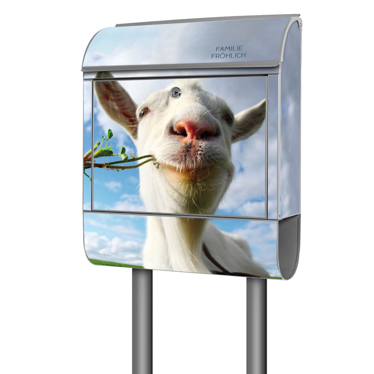 Der banjado Standbriefkasten mit Motiv Motiv Ziege 2 kombiniert großzügigen Stauraum mit modernem Design. Durch das geräumige Fach finden auch große A4-Sendungen problemlos Platz. Die integrierte Zeitungsrolle sorgt dafür, dass Tageszeitungen und Magazine separat und griffbereit untergebracht sind. Der pulverbeschichtete Standfuß ist farblich passend zum Briefkasten gestaltet und sorgt für ein stimmiges Gesamtbild. Mit dem individuellen Motiv setzen Sie einen optischen Akzent, der sowohl praktisch als auch dekorativ ist.
