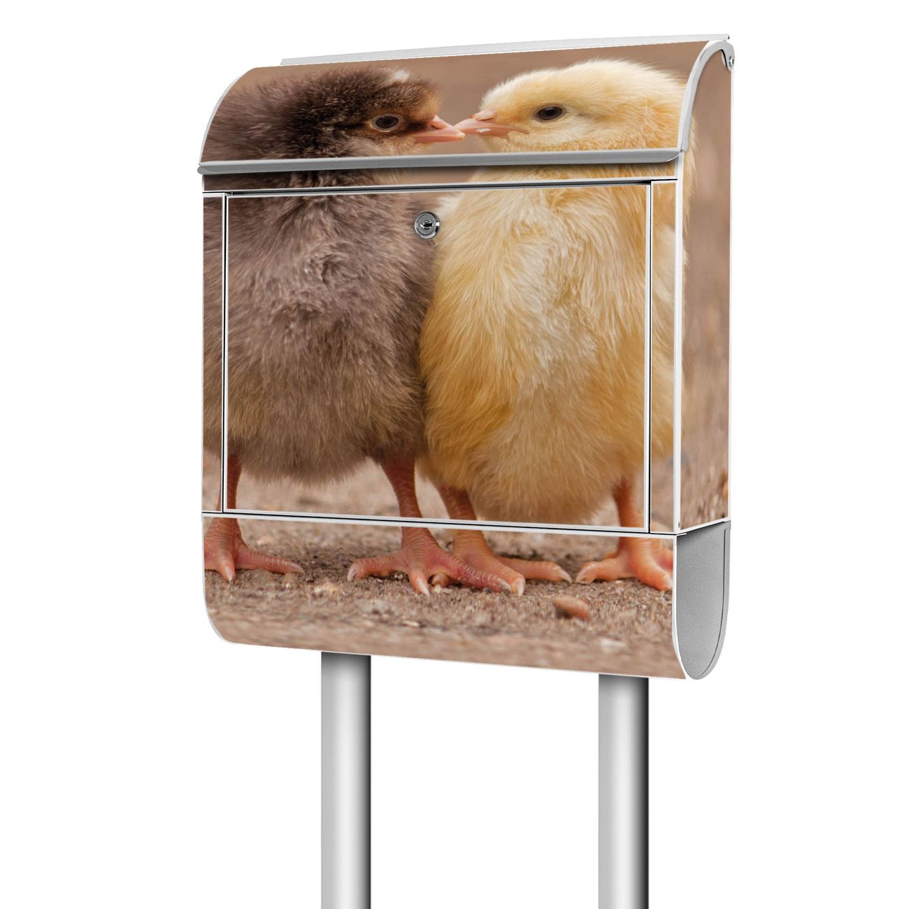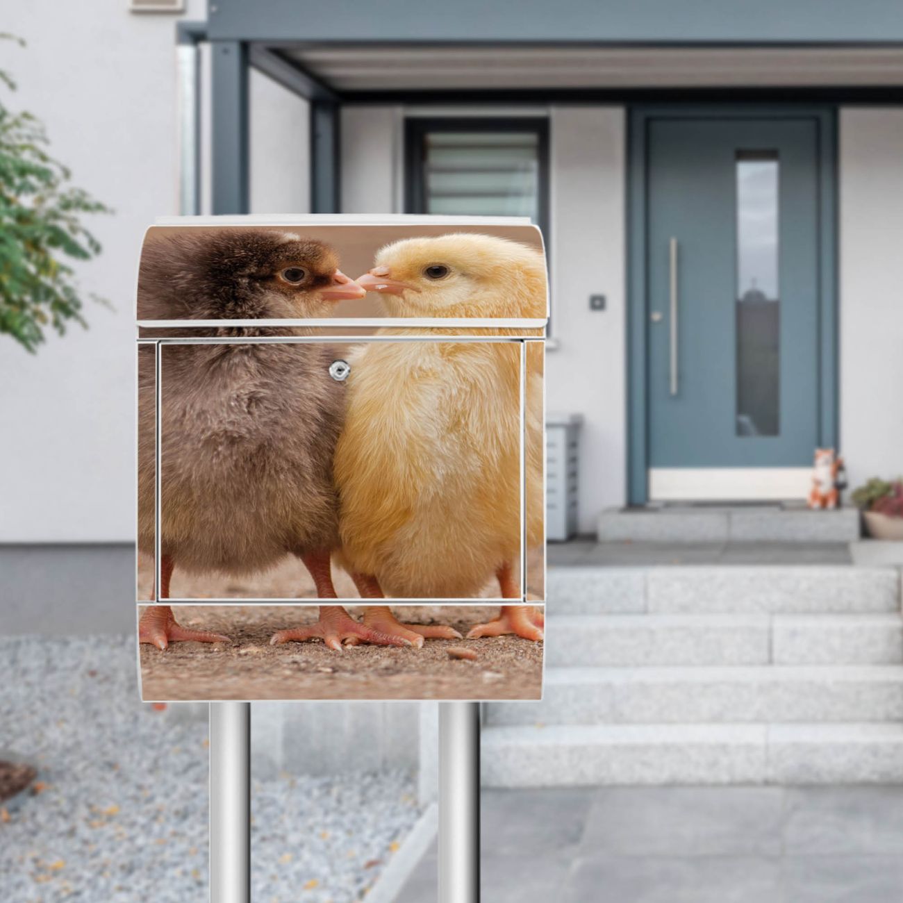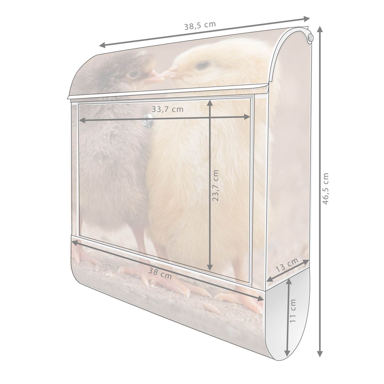 Der banjado Standbriefkasten mit Motiv Motiv Zwei Küken kombiniert großzügigen Stauraum mit modernem Design. Durch das geräumige Fach finden auch große A4-Sendungen problemlos Platz. Die integrierte Zeitungsrolle sorgt dafür, dass Tageszeitungen und Magazine separat und griffbereit untergebracht sind. Der pulverbeschichtete Standfuß ist farblich passend zum Briefkasten gestaltet und sorgt für ein stimmiges Gesamtbild. Mit dem individuellen Motiv setzen Sie einen optischen Akzent, der sowohl praktisch als auch dekorativ ist.