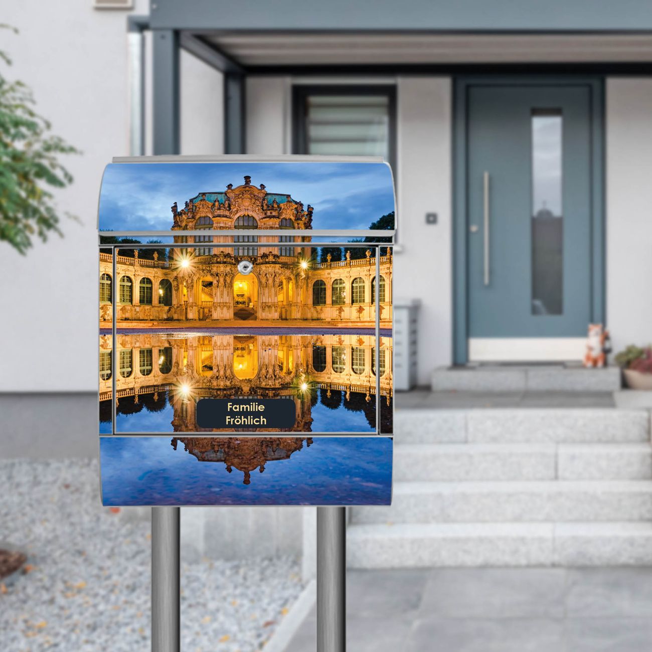 Der banjado Standbriefkasten mit Motiv Motiv Zwinger Dresden kombiniert großzügigen Stauraum mit modernem Design. Durch das geräumige Fach finden auch große A4-Sendungen problemlos Platz. Die integrierte Zeitungsrolle sorgt dafür, dass Tageszeitungen und Magazine separat und griffbereit untergebracht sind. Der pulverbeschichtete Standfuß ist farblich passend zum Briefkasten gestaltet und sorgt für ein stimmiges Gesamtbild. Mit dem individuellen Motiv setzen Sie einen optischen Akzent, der sowohl praktisch als auch dekorativ ist.