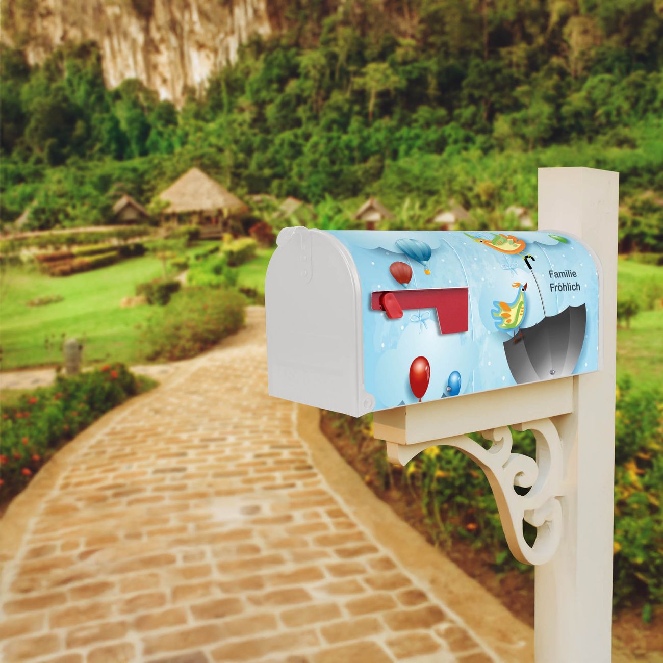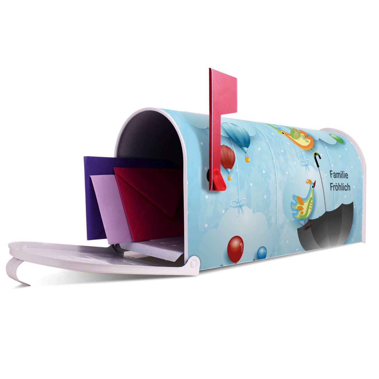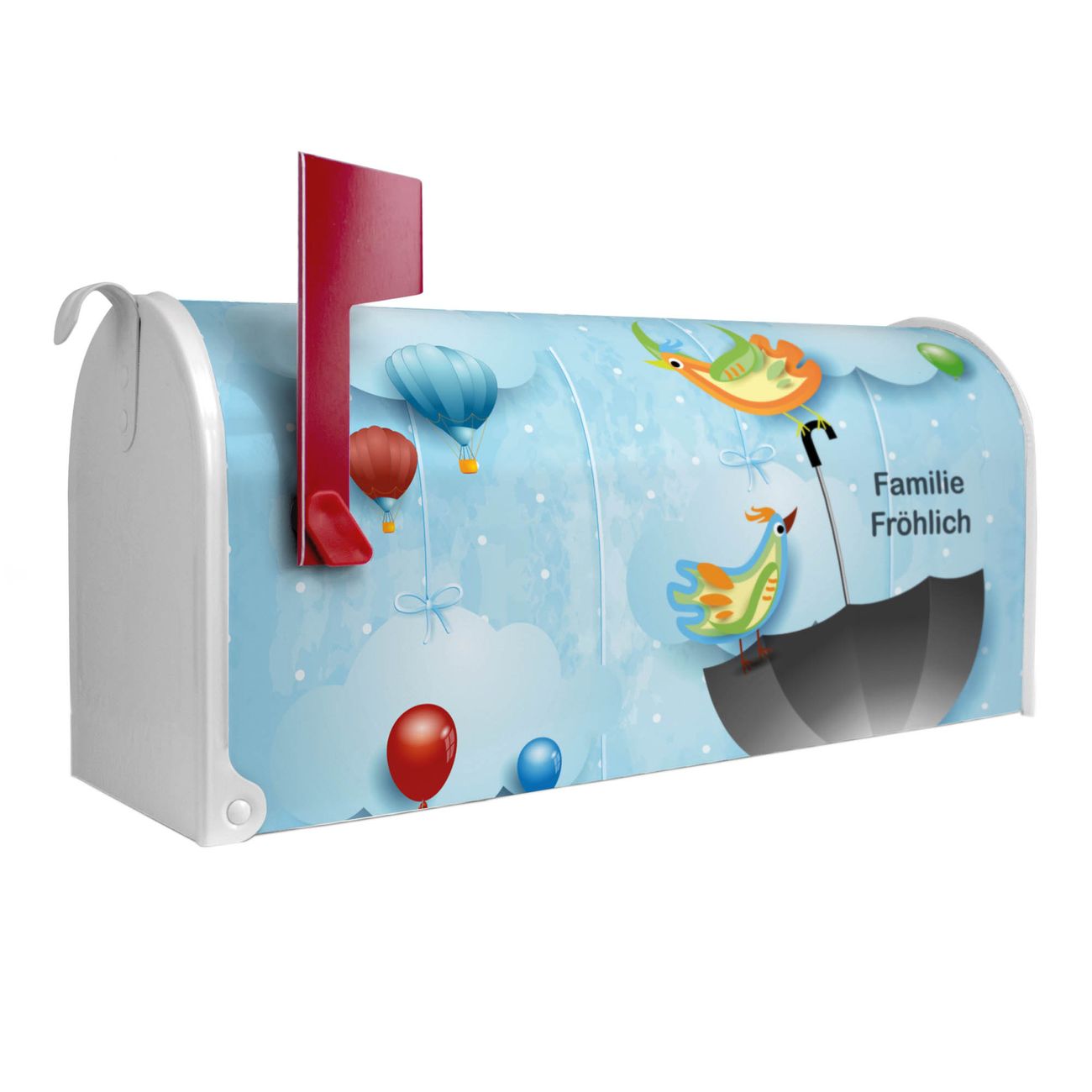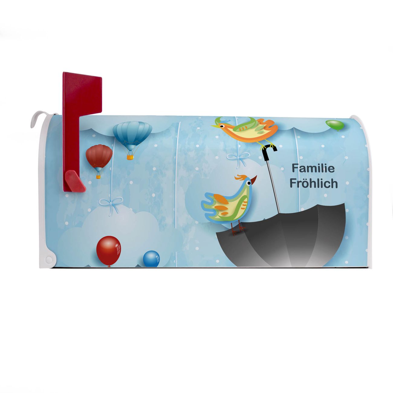 Unser amerikanischer Briefkasten mit dem Motiv fliegender Regenschirm hat ein sehr ansprechendes und ausgefallenes Design, ist in der Grundfarbe weiß, grün oder schwarz erhältlich. Damit entlocken Sie Ihren Nachbarn und dem Postboten immer wieder ein Lächeln. Die Mailbox ist ein Original Import aus Mississippi USA und wird von unserer kleinen Manufaktur in Sachsen von Hand veredelt. Die US-Mailbox bietet ausreichend Platz auch für große Sendungen, eine Fahne die Ihnen Post anzeigt, wetterfestes und äußerst stabiles Material - so macht Post empfangen Freude.