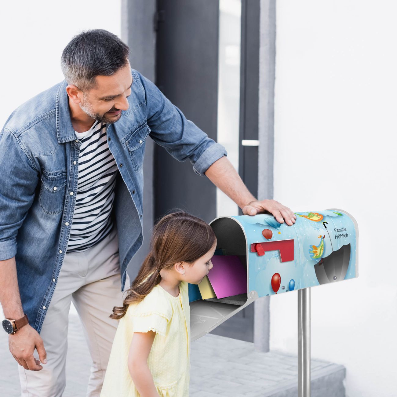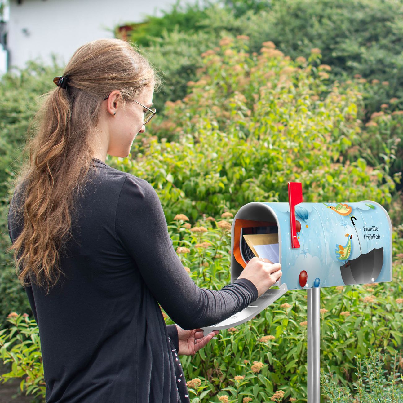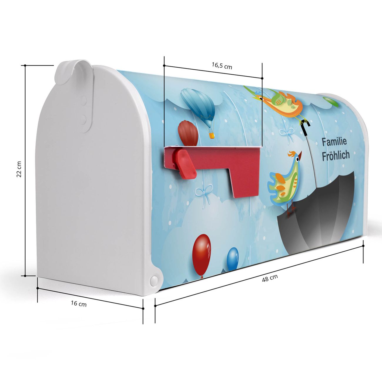 Der amerikanische Briefkasten von banjado mit fliegender Regenschirm Motiv bietet Ihnen ausreichend Fassungsvermögen, um große A4 Sendungen und Zeitschriften zu empfangen. Die typisch amerikanische rote Fahne zeigt Ihnen an, wenn Sie Post erhalten haben. Die US-Mailbox besteht aus verzinktem Stahlblech welches lackiert wurde und ist 48 x 22 x 16 CM (BxHxT) groß. Die Folie mit Motiv fliegender Regenschirm besteht aus einer wetter- und UV-resistenten Folie, die mit einem Schutzlaminat überzogen ist, sodass die US Mailbox zusätzlich vor Kratzern geschützt ist. An der Unterkante sind 4 Löcher je Seite um die Mailbox, typisch amerikanisch, an einem Holzpfahl oder einem Zaun zu befestigen. Auf Wunsch können Sie bei uns den passenden Standfuß oder die passende Wandhalterung kaufen um die US-Mailbox sicher zu befestigen. Wir bieten Ihnen ebenfalls Namensschilder, bereits beschriftet oder frei zu beschriften, und verschiedene selbst gestaltete Bitte-Keine-Werbung-Aufkleber.