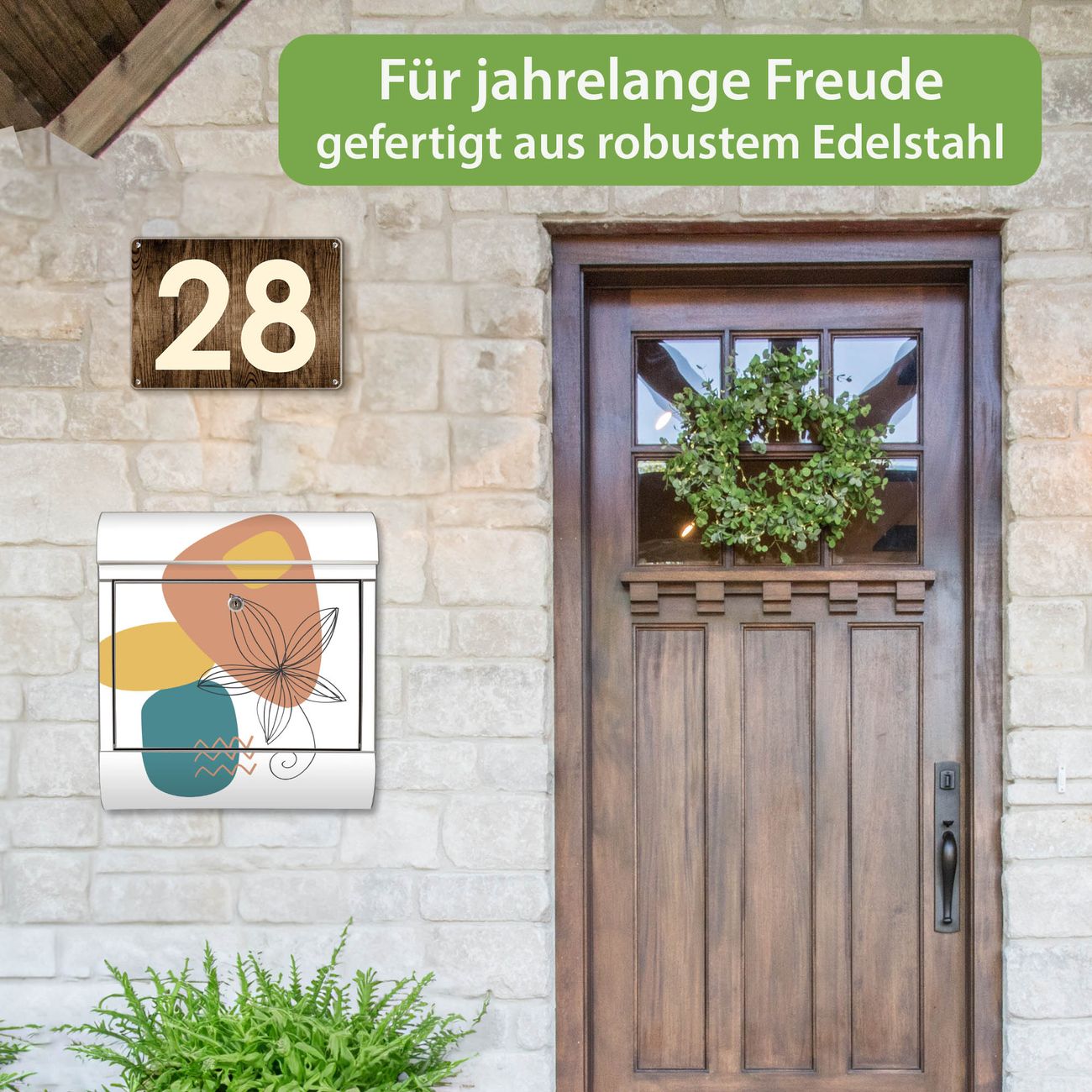 FUNKTION: Der banjado Edelstahl Briefkasten mit Motiv Motiv Abstrakte Blumen Lineart bietet Ihnen mit seinem Fassungsvermögen genügend Platz auch für große A4 Sendungen. Das integrierte Zeitungsfach eignet sich hervorragend um unkompliziert die Tageszeitung zu fassen. Auf Wunsch können Sie bei uns den passenden Ständer kaufen und so aus dem Wandbriefkasten einen Standbriefkasten machen. DESIGN: Der Motivbriefkasten hat ein sehr ansprechendes und ausgefallenes Design, damit entlocken Sie Ihren Nachbarn und dem Postboten ein Lächeln. Heben Sie Sich ab von der tristen grauen Masse ohne auf Funktionalität zu verzichten. DETAILS: Der Design Briefkasten mit Motiv Motiv Abstrakte Blumen Lineart besteht aus hochwertigem 18/0 Edelstahl. Das Motiv besteht aus einer wetter- und UV-resistenten Folie, die mit einem Schutzlaminat überzogen ist. Der Briefkasten wird mit Montagematerial und zwei Schlüsseln geliefert. NUTZEN: Sie können diesen Briefkasten sowohl als Wandbriefkasten montieren oder einen passenden Ständer auswählen und als Standbriefkasten einbetonieren. Die Größe bietet genügend Platz für Sendungen aller Art, das hochwertige Edelstahl ist rostfrei und die Motivfolie absolut wetterfest. SCHUTZ: Um Ihre Post optimal vor Witterungseinflüssen wie Starkregen zu schützen, empfehlen wir, den Briefkasten geschützt anzubringen. BANJADO: Ihr Briefkasten wird in Sachsen in einer kleinen Manufaktur von Hand veredelt. Die Motivfolie ist lösungsmittelfrei und schutzlaminiert, dies sorgt für einen langen Halt. Wir legen großen Wert auf die Verbindung von Funktionalität und Design. Sie erhalten Handarbeit aus Sachsen.