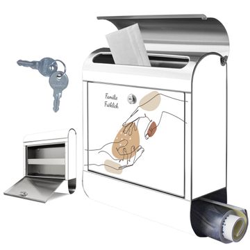 FUNKTION: Der banjado Edelstahl Briefkasten mit Motiv Motiv Berührende Verbindung Lineart bietet Ihnen mit seinem Fassungsvermögen genügend Platz auch für große A4 Sendungen. Das integrierte Zeitungsfach eignet sich hervorragend um unkompliziert die Tageszeitung zu fassen. Auf Wunsch können Sie bei uns den passenden Ständer kaufen und so aus dem Wandbriefkasten einen Standbriefkasten machen. DESIGN: Der Motivbriefkasten hat ein sehr ansprechendes und ausgefallenes Design, damit entlocken Sie Ihren Nachbarn und dem Postboten ein Lächeln. Heben Sie Sich ab von der tristen grauen Masse ohne auf Funktionalität zu verzichten. DETAILS: Der Design Briefkasten mit Motiv Motiv Berührende Verbindung Lineart besteht aus hochwertigem 18/0 Edelstahl. Das Motiv besteht aus einer wetter- und UV-resistenten Folie, die mit einem Schutzlaminat überzogen ist. Der Briefkasten wird mit Montagematerial und zwei Schlüsseln geliefert. NUTZEN: Sie können diesen Briefkasten sowohl als Wandbriefkasten montieren oder einen passenden Ständer auswählen und als Standbriefkasten einbetonieren. Die Größe bietet genügend Platz für Sendungen aller Art, das hochwertige Edelstahl ist rostfrei und die Motivfolie absolut wetterfest. SCHUTZ: Um Ihre Post optimal vor Witterungseinflüssen wie Starkregen zu schützen, empfehlen wir, den Briefkasten geschützt anzubringen. BANJADO: Ihr Briefkasten wird in Sachsen in einer kleinen Manufaktur von Hand veredelt. Die Motivfolie ist lösungsmittelfrei und schutzlaminiert, dies sorgt für einen langen Halt. Wir legen großen Wert auf die Verbindung von Funktionalität und Design. Sie erhalten Handarbeit aus Sachsen.
