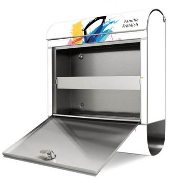 FUNKTION: Der banjado Edelstahl Briefkasten mit Motiv Motiv Bunter Notenschlüssel bietet Ihnen mit seinem Fassungsvermögen genügend Platz auch für große A4 Sendungen. Das integrierte Zeitungsfach eignet sich hervorragend um unkompliziert die Tageszeitung zu fassen. Auf Wunsch können Sie bei uns den passenden Ständer kaufen und so aus dem Wandbriefkasten einen Standbriefkasten machen. DESIGN: Der Motivbriefkasten hat ein sehr ansprechendes und ausgefallenes Design, damit entlocken Sie Ihren Nachbarn und dem Postboten ein Lächeln. Heben Sie Sich ab von der tristen grauen Masse ohne auf Funktionalität zu verzichten. DETAILS: Der Design Briefkasten mit Motiv Motiv Bunter Notenschlüssel besteht aus hochwertigem 18/0 Edelstahl. Das Motiv besteht aus einer wetter- und UV-resistenten Folie, die mit einem Schutzlaminat überzogen ist. Der Briefkasten wird mit Montagematerial und zwei Schlüsseln geliefert. NUTZEN: Sie können diesen Briefkasten sowohl als Wandbriefkasten montieren oder einen passenden Ständer auswählen und als Standbriefkasten einbetonieren. Die Größe bietet genügend Platz für Sendungen aller Art, das hochwertige Edelstahl ist rostfrei und die Motivfolie absolut wetterfest. SCHUTZ: Um Ihre Post optimal vor Witterungseinflüssen wie Starkregen zu schützen, empfehlen wir, den Briefkasten geschützt anzubringen. BANJADO: Ihr Briefkasten wird in Sachsen in einer kleinen Manufaktur von Hand veredelt. Die Motivfolie ist lösungsmittelfrei und schutzlaminiert, dies sorgt für einen langen Halt. Wir legen großen Wert auf die Verbindung von Funktionalität und Design. Sie erhalten Handarbeit aus Sachsen.