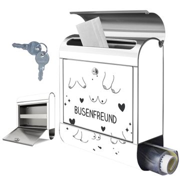 FUNKTION: Der banjado Edelstahl Briefkasten mit Motiv Motiv Busenfreund 2 bietet Ihnen mit seinem Fassungsvermögen genügend Platz auch für große A4 Sendungen. Das integrierte Zeitungsfach eignet sich hervorragend um unkompliziert die Tageszeitung zu fassen. Auf Wunsch können Sie bei uns den passenden Ständer kaufen und so aus dem Wandbriefkasten einen Standbriefkasten machen. DESIGN: Der Motivbriefkasten hat ein sehr ansprechendes und ausgefallenes Design, damit entlocken Sie Ihren Nachbarn und dem Postboten ein Lächeln. Heben Sie Sich ab von der tristen grauen Masse ohne auf Funktionalität zu verzichten. DETAILS: Der Design Briefkasten mit Motiv Motiv Busenfreund 2 besteht aus hochwertigem 18/0 Edelstahl. Das Motiv besteht aus einer wetter- und UV-resistenten Folie, die mit einem Schutzlaminat überzogen ist. Der Briefkasten wird mit Montagematerial und zwei Schlüsseln geliefert. NUTZEN: Sie können diesen Briefkasten sowohl als Wandbriefkasten montieren oder einen passenden Ständer auswählen und als Standbriefkasten einbetonieren. Die Größe bietet genügend Platz für Sendungen aller Art, das hochwertige Edelstahl ist rostfrei und die Motivfolie absolut wetterfest. SCHUTZ: Um Ihre Post optimal vor Witterungseinflüssen wie Starkregen zu schützen, empfehlen wir, den Briefkasten geschützt anzubringen. BANJADO: Ihr Briefkasten wird in Sachsen in einer kleinen Manufaktur von Hand veredelt. Die Motivfolie ist lösungsmittelfrei und schutzlaminiert, dies sorgt für einen langen Halt. Wir legen großen Wert auf die Verbindung von Funktionalität und Design. Sie erhalten Handarbeit aus Sachsen.