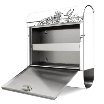 FUNKTION: Der banjado Edelstahl Briefkasten mit Motiv Motiv Floral Skull 2 bietet Ihnen mit seinem Fassungsvermögen genügend Platz auch für große A4 Sendungen. Das integrierte Zeitungsfach eignet sich hervorragend um unkompliziert die Tageszeitung zu fassen. Auf Wunsch können Sie bei uns den passenden Ständer kaufen und so aus dem Wandbriefkasten einen Standbriefkasten machen. DESIGN: Der Motivbriefkasten hat ein sehr ansprechendes und ausgefallenes Design, damit entlocken Sie Ihren Nachbarn und dem Postboten ein Lächeln. Heben Sie Sich ab von der tristen grauen Masse ohne auf Funktionalität zu verzichten. DETAILS: Der Design Briefkasten mit Motiv Motiv Floral Skull 2 besteht aus hochwertigem 18/0 Edelstahl. Das Motiv besteht aus einer wetter- und UV-resistenten Folie, die mit einem Schutzlaminat überzogen ist. Der Briefkasten wird mit Montagematerial und zwei Schlüsseln geliefert. NUTZEN: Sie können diesen Briefkasten sowohl als Wandbriefkasten montieren oder einen passenden Ständer auswählen und als Standbriefkasten einbetonieren. Die Größe bietet genügend Platz für Sendungen aller Art, das hochwertige Edelstahl ist rostfrei und die Motivfolie absolut wetterfest. SCHUTZ: Um Ihre Post optimal vor Witterungseinflüssen wie Starkregen zu schützen, empfehlen wir, den Briefkasten geschützt anzubringen. BANJADO: Ihr Briefkasten wird in Sachsen in einer kleinen Manufaktur von Hand veredelt. Die Motivfolie ist lösungsmittelfrei und schutzlaminiert, dies sorgt für einen langen Halt. Wir legen großen Wert auf die Verbindung von Funktionalität und Design. Sie erhalten Handarbeit aus Sachsen.