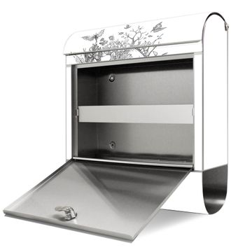 FUNKTION: Der banjado Edelstahl Briefkasten mit Motiv Motiv Floral Skull bietet Ihnen mit seinem Fassungsvermögen genügend Platz auch für große A4 Sendungen. Das integrierte Zeitungsfach eignet sich hervorragend um unkompliziert die Tageszeitung zu fassen. Auf Wunsch können Sie bei uns den passenden Ständer kaufen und so aus dem Wandbriefkasten einen Standbriefkasten machen. DESIGN: Der Motivbriefkasten hat ein sehr ansprechendes und ausgefallenes Design, damit entlocken Sie Ihren Nachbarn und dem Postboten ein Lächeln. Heben Sie Sich ab von der tristen grauen Masse ohne auf Funktionalität zu verzichten. DETAILS: Der Design Briefkasten mit Motiv Motiv Floral Skull besteht aus hochwertigem 18/0 Edelstahl. Das Motiv besteht aus einer wetter- und UV-resistenten Folie, die mit einem Schutzlaminat überzogen ist. Der Briefkasten wird mit Montagematerial und zwei Schlüsseln geliefert. NUTZEN: Sie können diesen Briefkasten sowohl als Wandbriefkasten montieren oder einen passenden Ständer auswählen und als Standbriefkasten einbetonieren. Die Größe bietet genügend Platz für Sendungen aller Art, das hochwertige Edelstahl ist rostfrei und die Motivfolie absolut wetterfest. SCHUTZ: Um Ihre Post optimal vor Witterungseinflüssen wie Starkregen zu schützen, empfehlen wir, den Briefkasten geschützt anzubringen. BANJADO: Ihr Briefkasten wird in Sachsen in einer kleinen Manufaktur von Hand veredelt. Die Motivfolie ist lösungsmittelfrei und schutzlaminiert, dies sorgt für einen langen Halt. Wir legen großen Wert auf die Verbindung von Funktionalität und Design. Sie erhalten Handarbeit aus Sachsen.