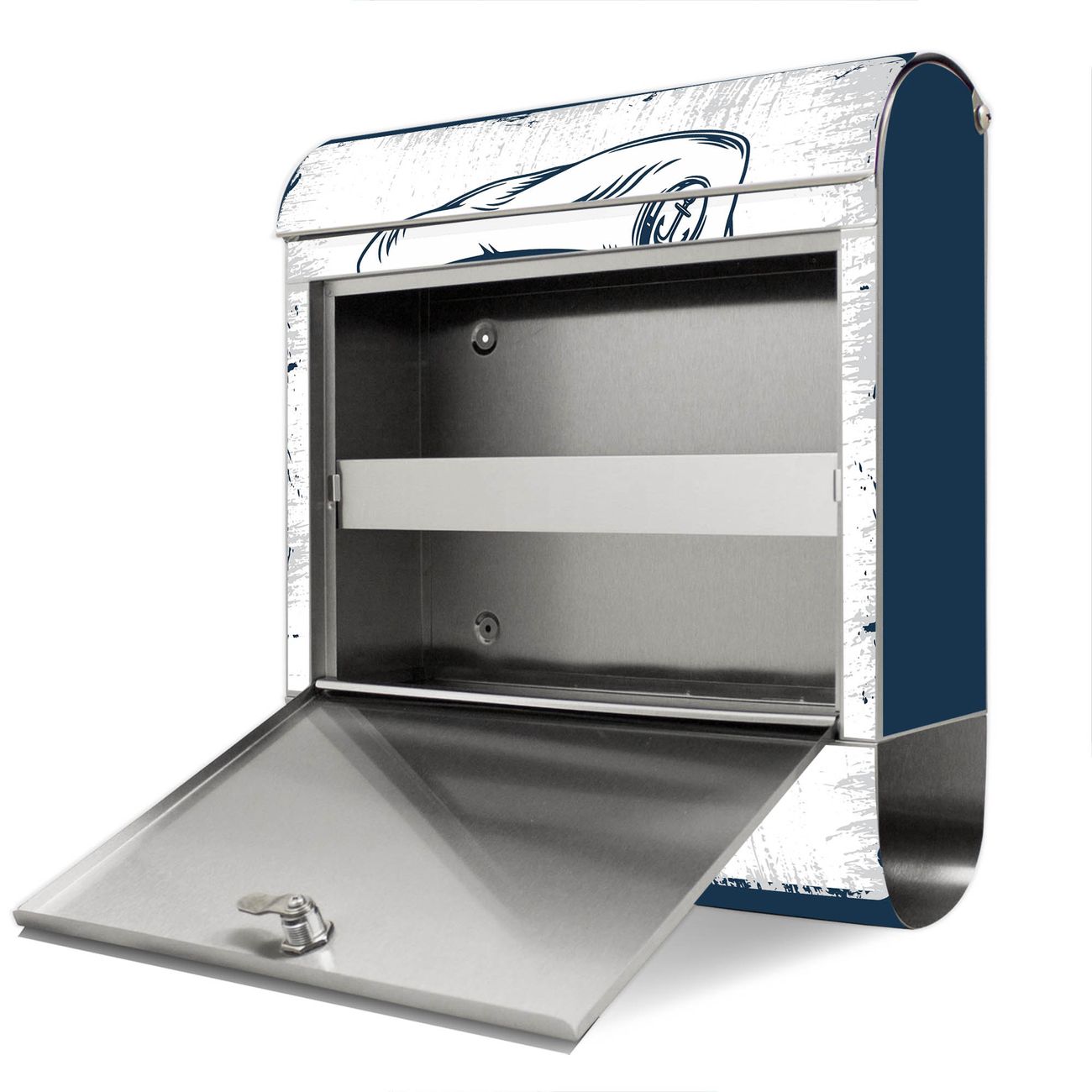FUNKTION: Der banjado Edelstahl Briefkasten mit Motiv Motiv Kapitän Portrait bietet Ihnen mit seinem Fassungsvermögen genügend Platz auch für große A4 Sendungen. Das integrierte Zeitungsfach eignet sich hervorragend um unkompliziert die Tageszeitung zu fassen. Auf Wunsch können Sie bei uns den passenden Ständer kaufen und so aus dem Wandbriefkasten einen Standbriefkasten machen. DESIGN: Der Motivbriefkasten hat ein sehr ansprechendes und ausgefallenes Design, damit entlocken Sie Ihren Nachbarn und dem Postboten ein Lächeln. Heben Sie Sich ab von der tristen grauen Masse ohne auf Funktionalität zu verzichten. DETAILS: Der Design Briefkasten mit Motiv Motiv Kapitän Portrait besteht aus hochwertigem 18/0 Edelstahl. Das Motiv besteht aus einer wetter- und UV-resistenten Folie, die mit einem Schutzlaminat überzogen ist. Der Briefkasten wird mit Montagematerial und zwei Schlüsseln geliefert. NUTZEN: Sie können diesen Briefkasten sowohl als Wandbriefkasten montieren oder einen passenden Ständer auswählen und als Standbriefkasten einbetonieren. Die Größe bietet genügend Platz für Sendungen aller Art, das hochwertige Edelstahl ist rostfrei und die Motivfolie absolut wetterfest. SCHUTZ: Um Ihre Post optimal vor Witterungseinflüssen wie Starkregen zu schützen, empfehlen wir, den Briefkasten geschützt anzubringen. BANJADO: Ihr Briefkasten wird in Sachsen in einer kleinen Manufaktur von Hand veredelt. Die Motivfolie ist lösungsmittelfrei und schutzlaminiert, dies sorgt für einen langen Halt. Wir legen großen Wert auf die Verbindung von Funktionalität und Design. Sie erhalten Handarbeit aus Sachsen.