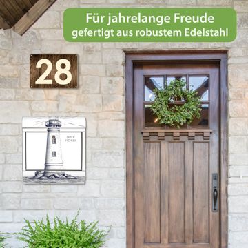 FUNKTION: Der banjado Edelstahl Briefkasten mit Motiv Motiv Leuchtturm-Skizze bietet Ihnen mit seinem Fassungsvermögen genügend Platz auch für große A4 Sendungen. Das integrierte Zeitungsfach eignet sich hervorragend um unkompliziert die Tageszeitung zu fassen. Auf Wunsch können Sie bei uns den passenden Ständer kaufen und so aus dem Wandbriefkasten einen Standbriefkasten machen. DESIGN: Der Motivbriefkasten hat ein sehr ansprechendes und ausgefallenes Design, damit entlocken Sie Ihren Nachbarn und dem Postboten ein Lächeln. Heben Sie Sich ab von der tristen grauen Masse ohne auf Funktionalität zu verzichten. DETAILS: Der Design Briefkasten mit Motiv Motiv Leuchtturm-Skizze besteht aus hochwertigem 18/0 Edelstahl. Das Motiv besteht aus einer wetter- und UV-resistenten Folie, die mit einem Schutzlaminat überzogen ist. Der Briefkasten wird mit Montagematerial und zwei Schlüsseln geliefert. NUTZEN: Sie können diesen Briefkasten sowohl als Wandbriefkasten montieren oder einen passenden Ständer auswählen und als Standbriefkasten einbetonieren. Die Größe bietet genügend Platz für Sendungen aller Art, das hochwertige Edelstahl ist rostfrei und die Motivfolie absolut wetterfest. SCHUTZ: Um Ihre Post optimal vor Witterungseinflüssen wie Starkregen zu schützen, empfehlen wir, den Briefkasten geschützt anzubringen. BANJADO: Ihr Briefkasten wird in Sachsen in einer kleinen Manufaktur von Hand veredelt. Die Motivfolie ist lösungsmittelfrei und schutzlaminiert, dies sorgt für einen langen Halt. Wir legen großen Wert auf die Verbindung von Funktionalität und Design. Sie erhalten Handarbeit aus Sachsen.