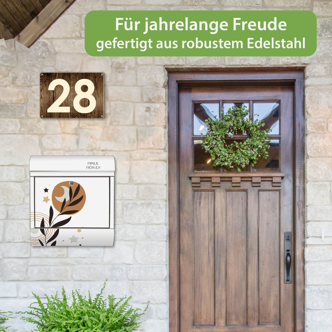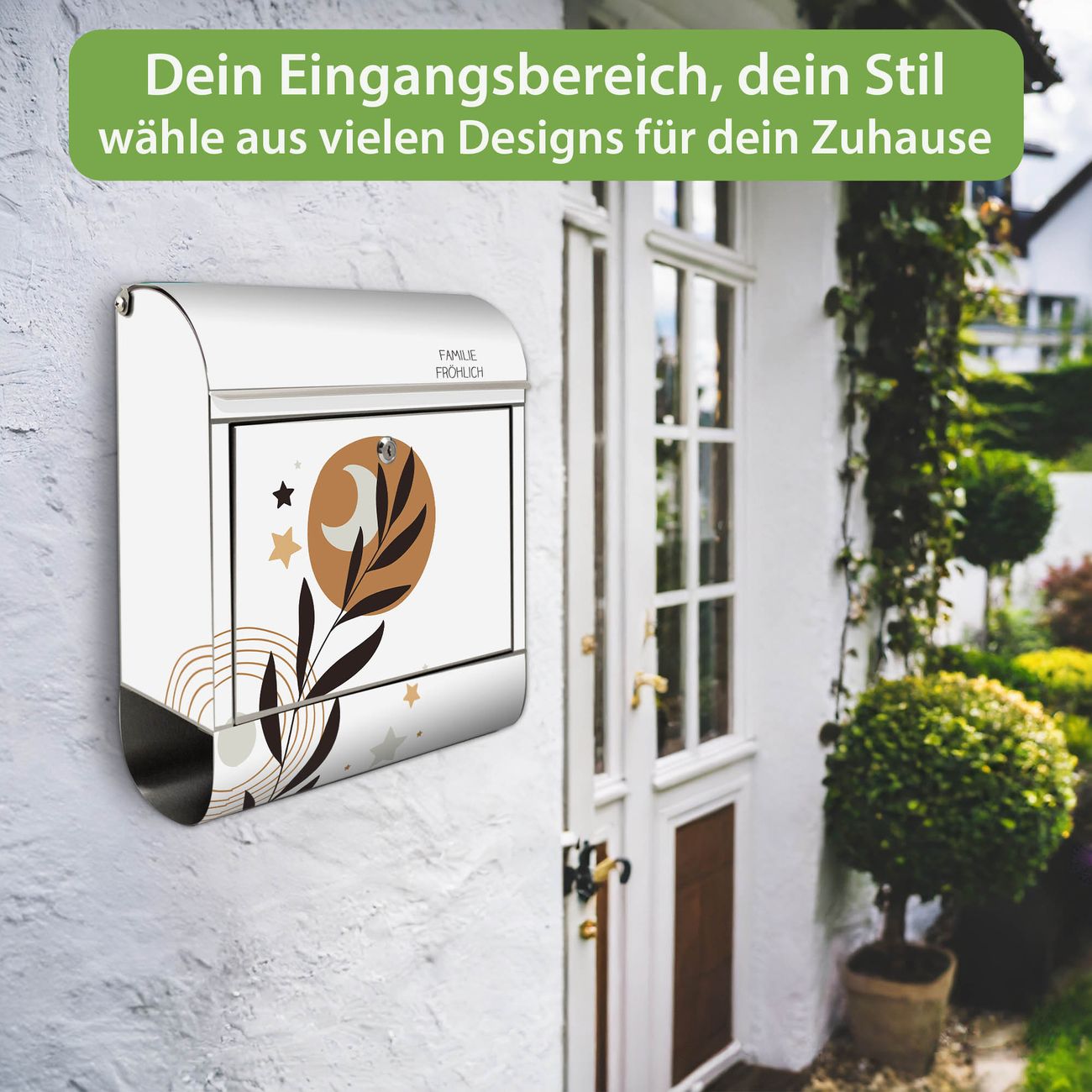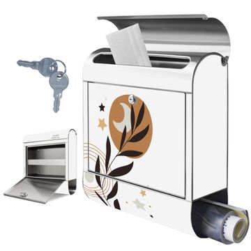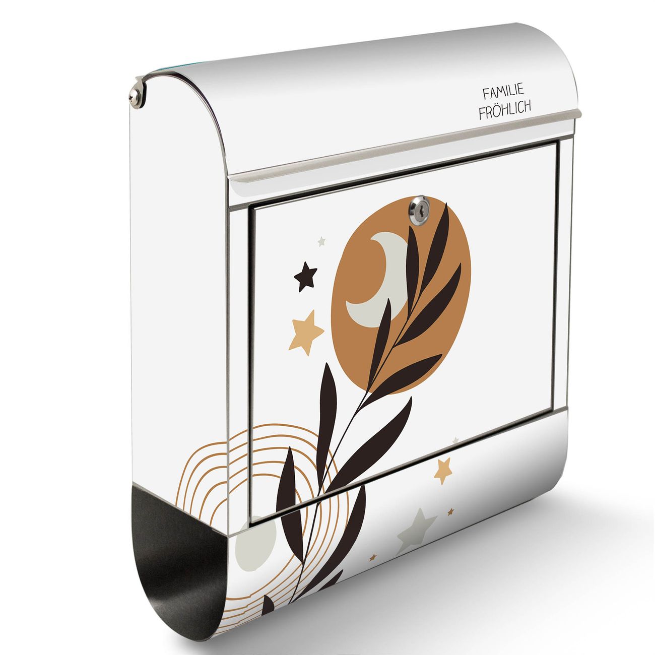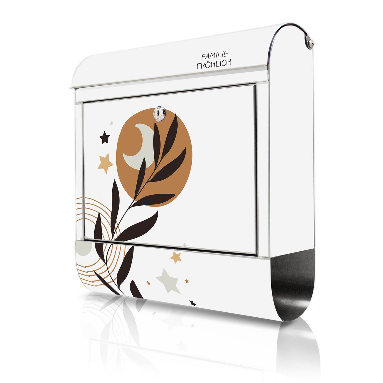 Wandbriefkasten Edelstahl Motiv Mond und Blätter Komposition