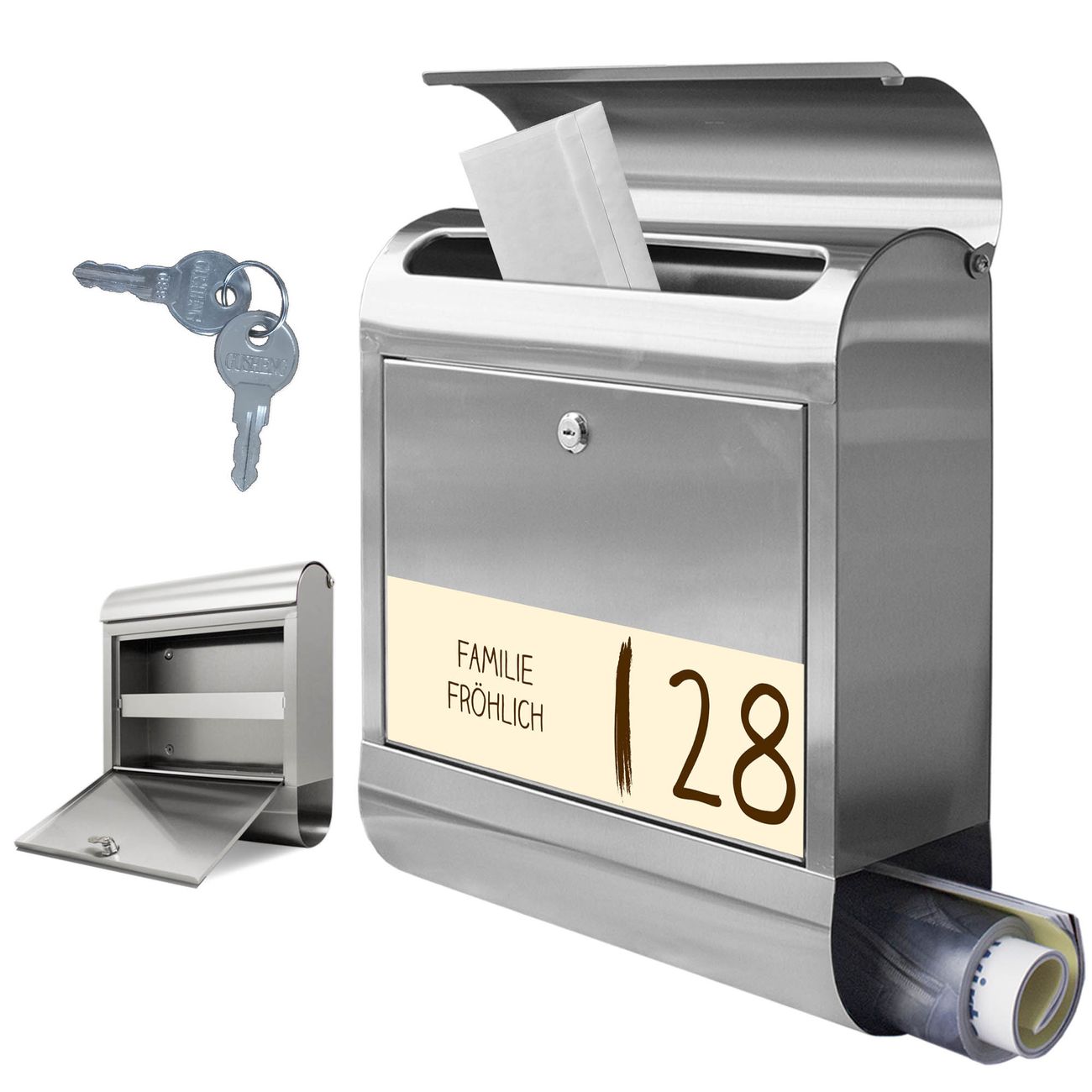 Wir bieten Ihnen ebenfalls Namensschilder, bereits beschriftet oder frei zu beschriften, und verschiedene selbst gestaltete Bitte-Keine-Werbung-Aufkleber.